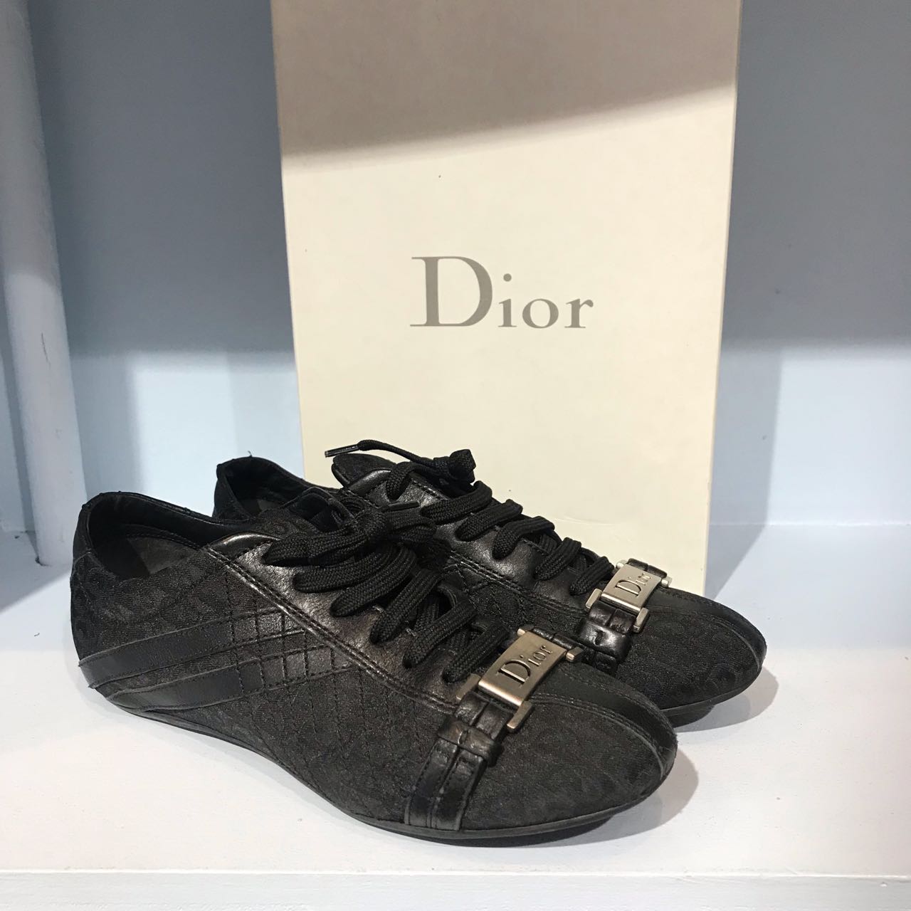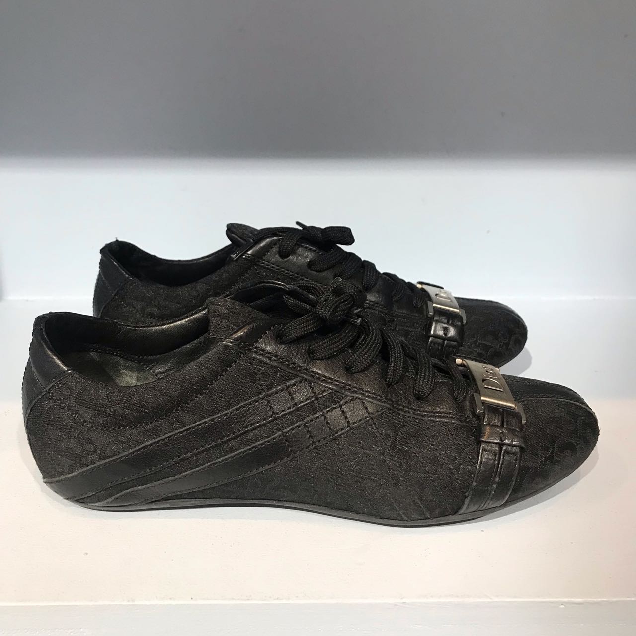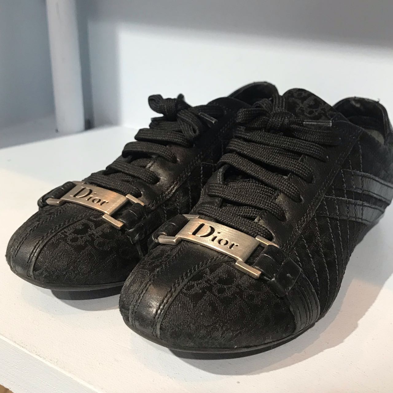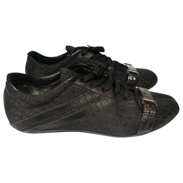 Baskets à lacets en toile et cuir noir, plaque Dior en métal argent.