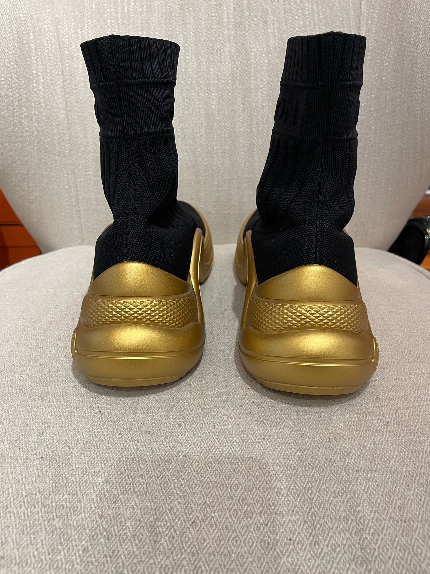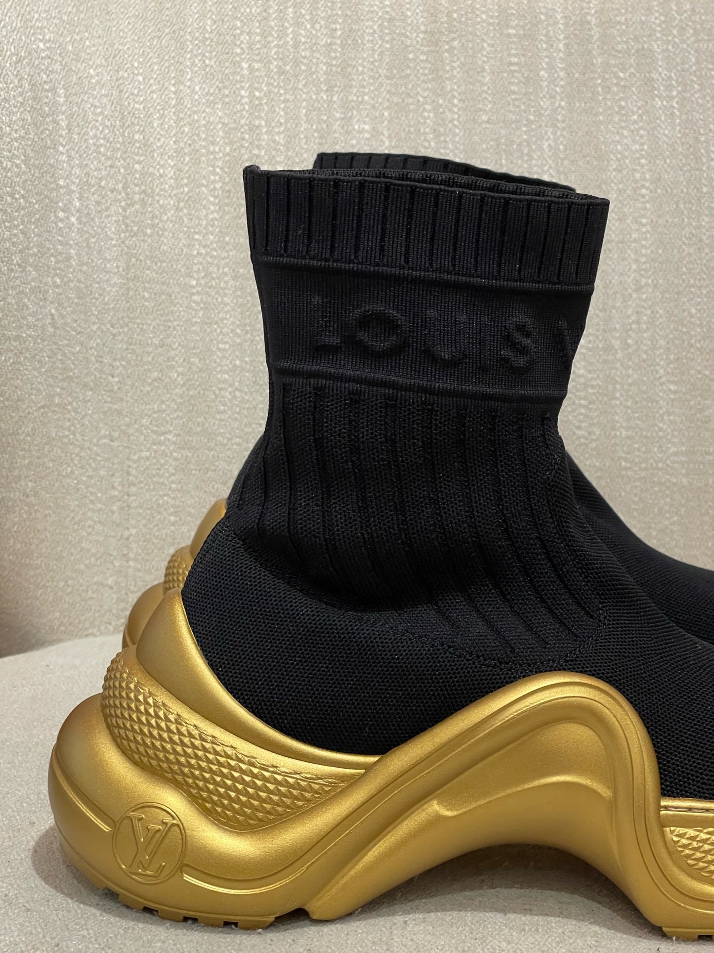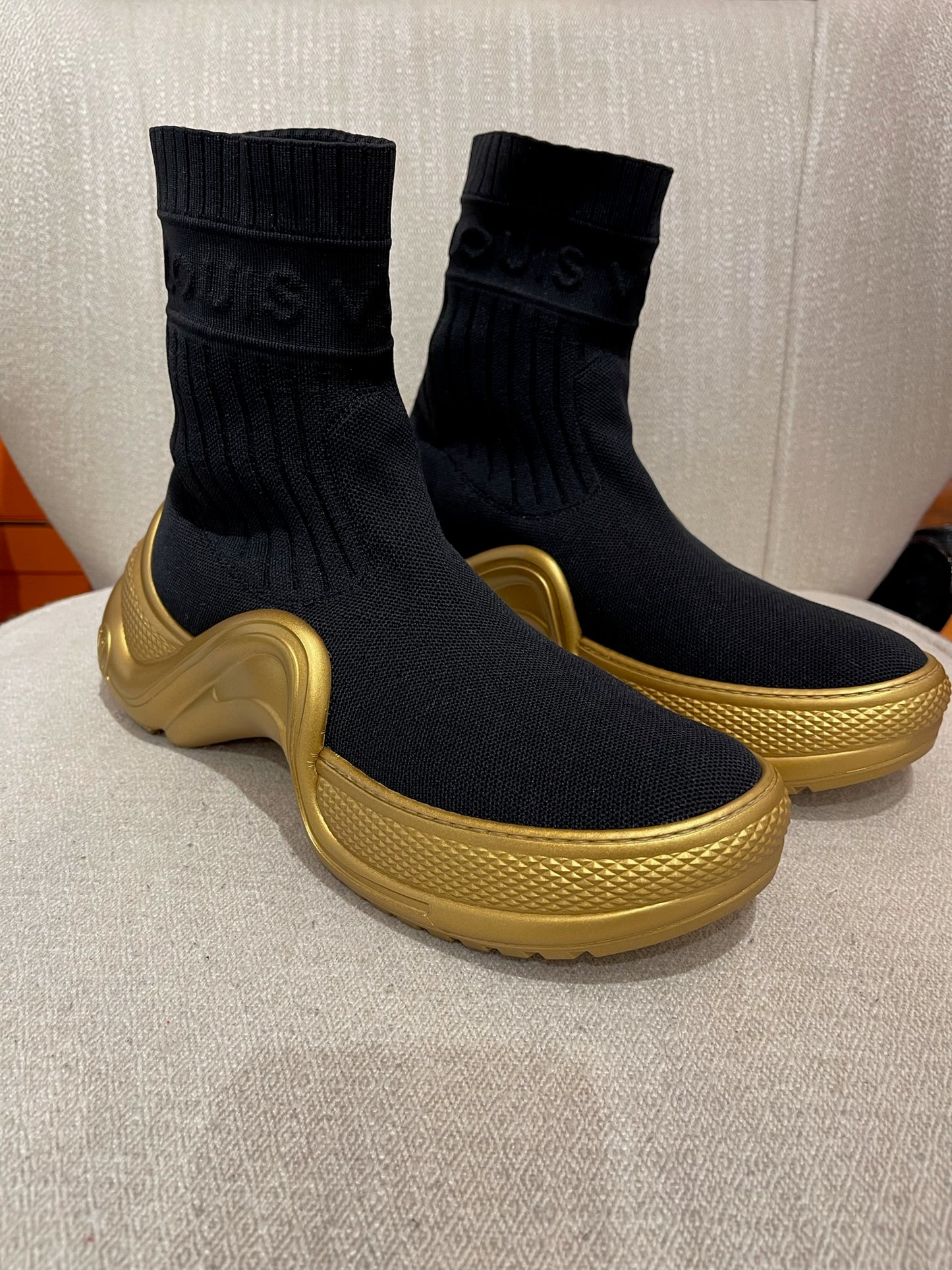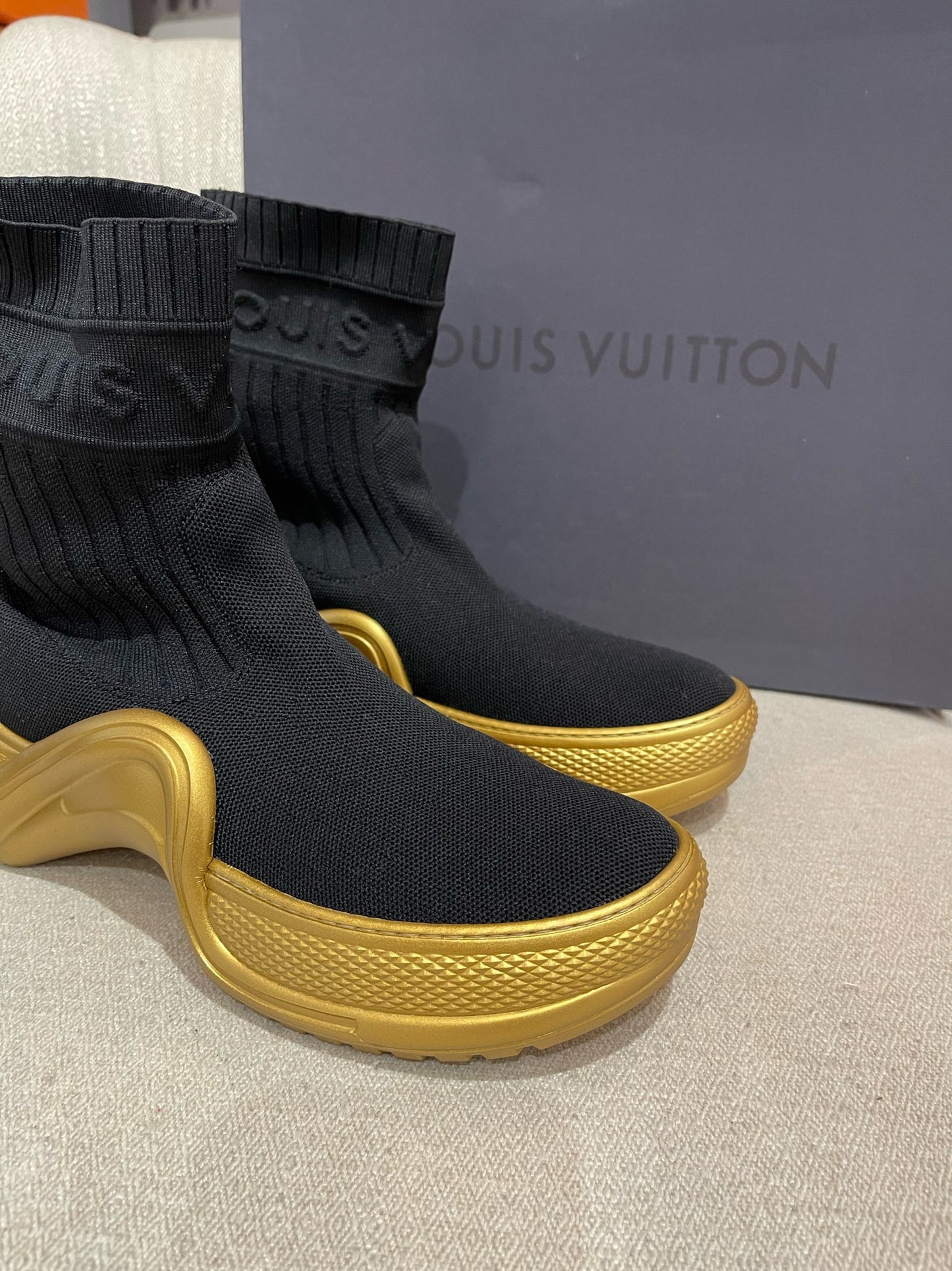 Baskets montante LV Archlight en tissu extensible noir orné de l'inscription Louis Vuitton sur la cheville. Semelle turbo oversize couleur or.