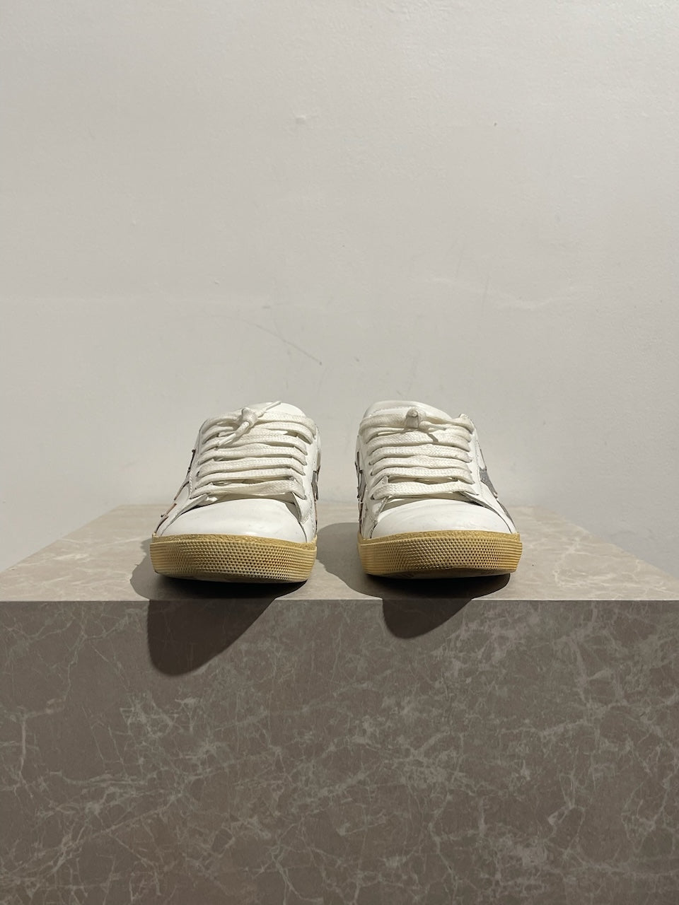 Baskets basses à lacets en cuir blanc et motif étoiles argents.