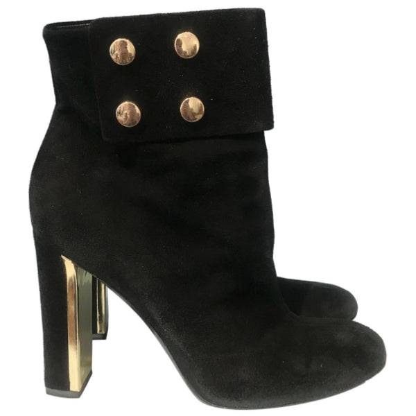 Boots à talons en daim noir à détails dorés. Fermeture à zip.