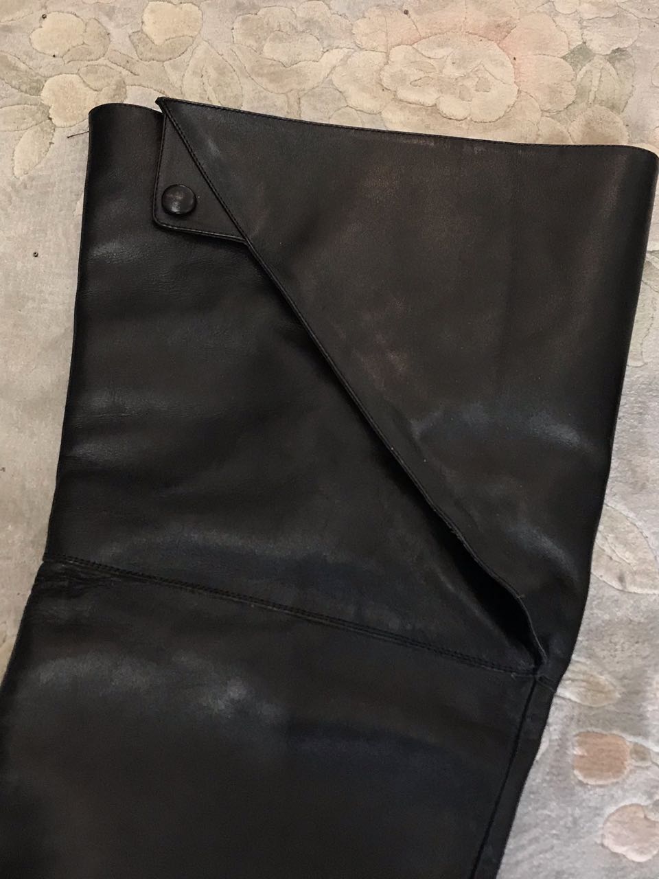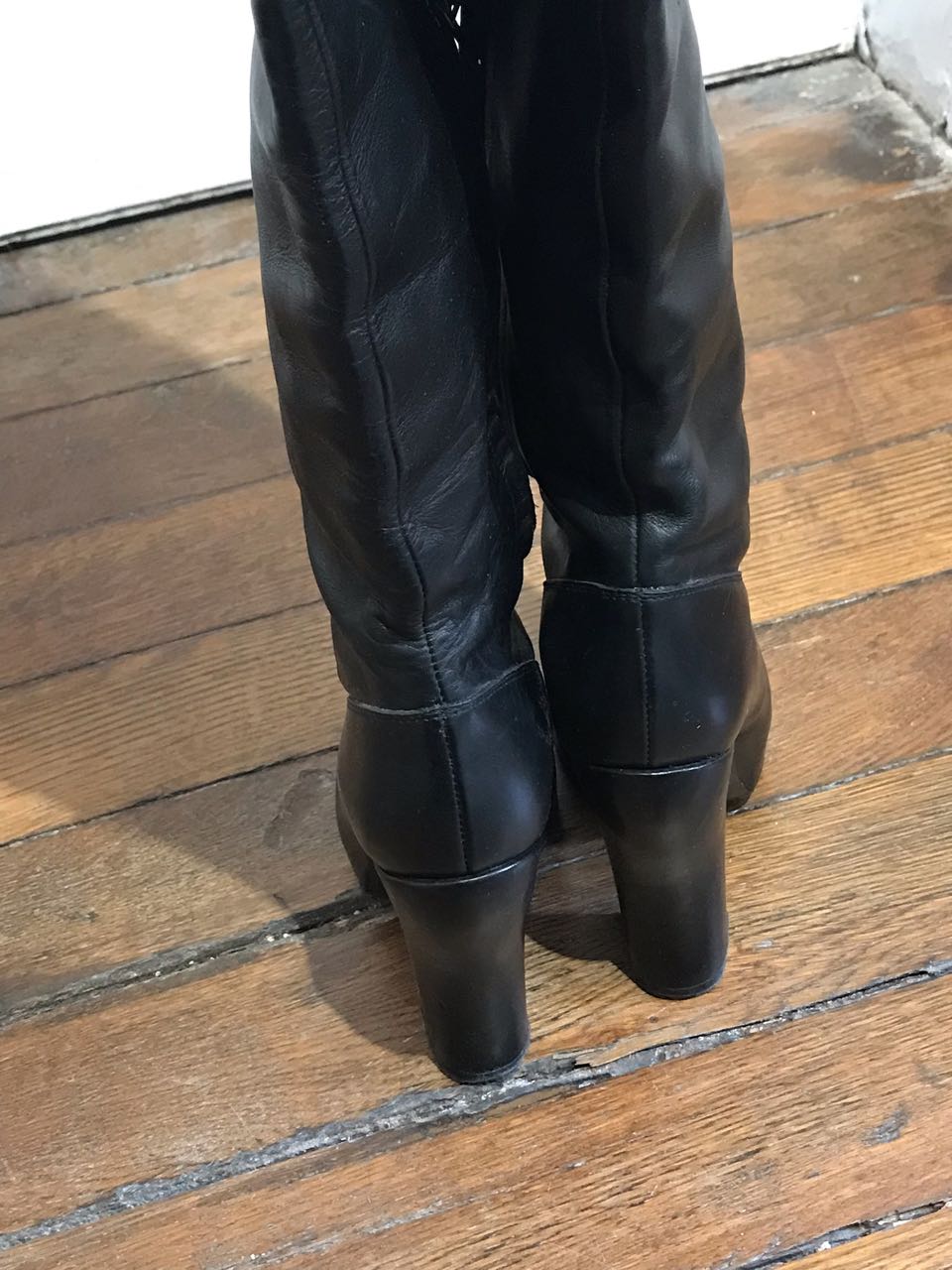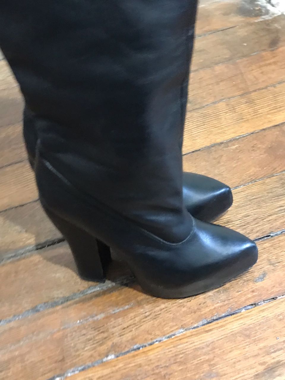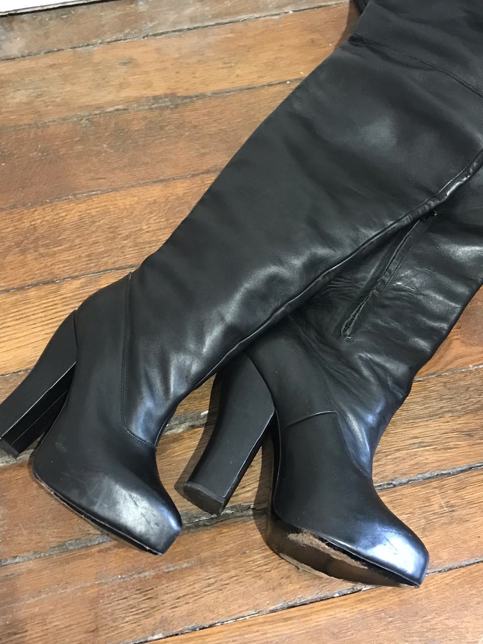 Bottes cuissardes en cuir noir. Talon avec plateforme et ouverture zip dans l'intérieur.