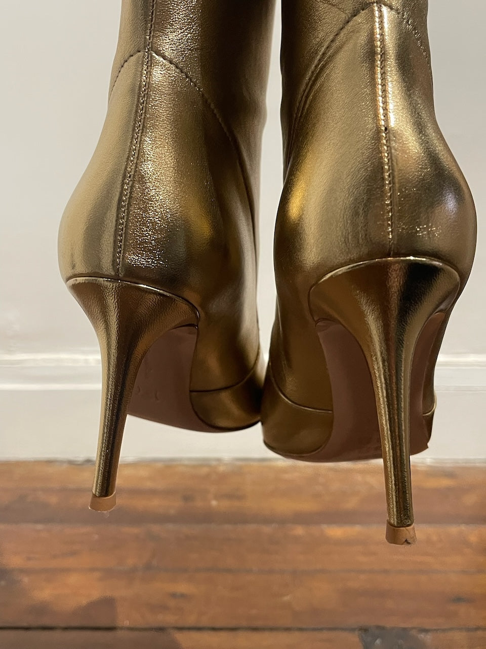 Bottes en cuir doré avec bouts pointus. S'enfile simplement.