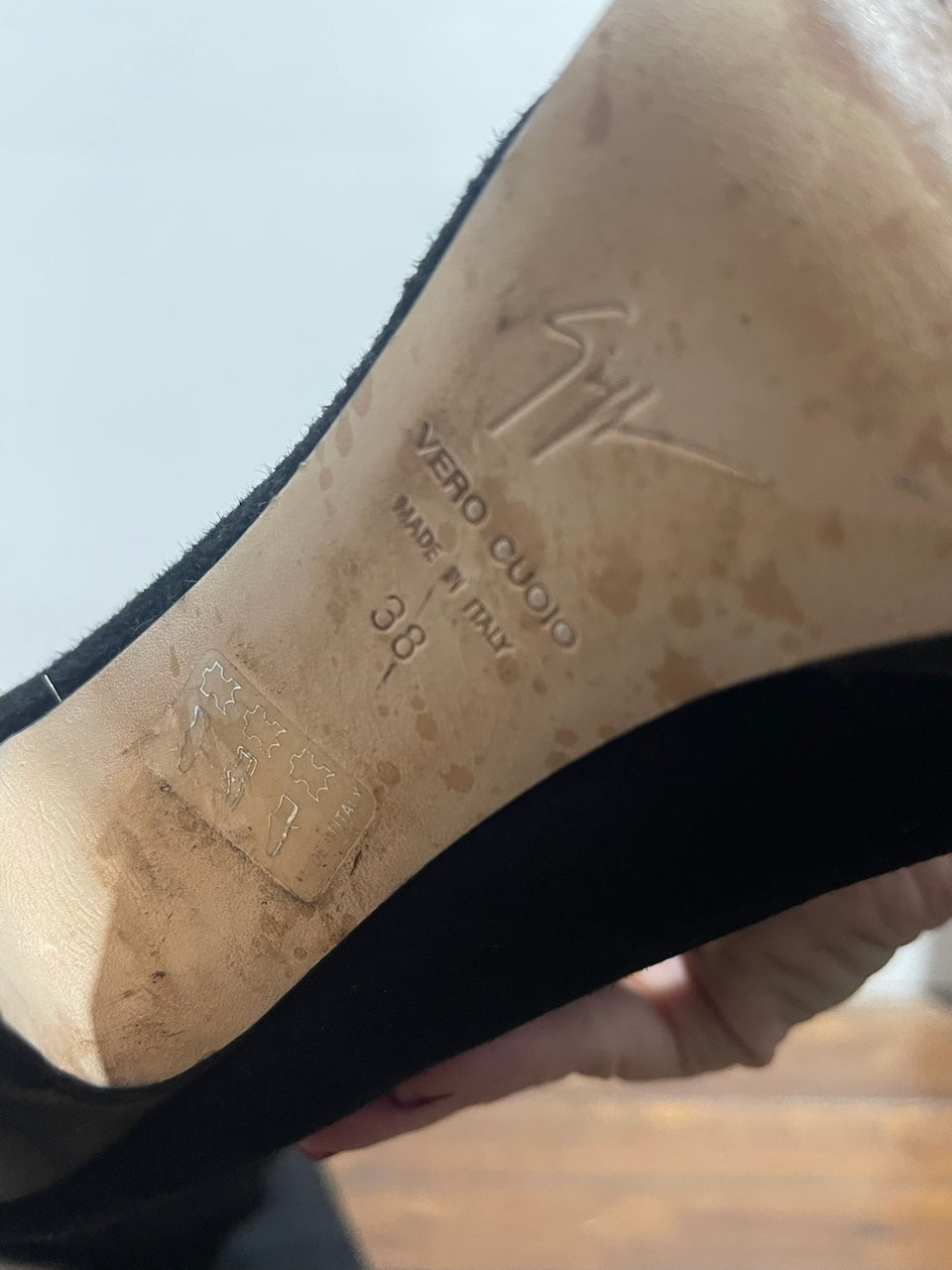 Bon état, à noter des frottements usuelles sur le daim et un accroc au talon (voir photos)