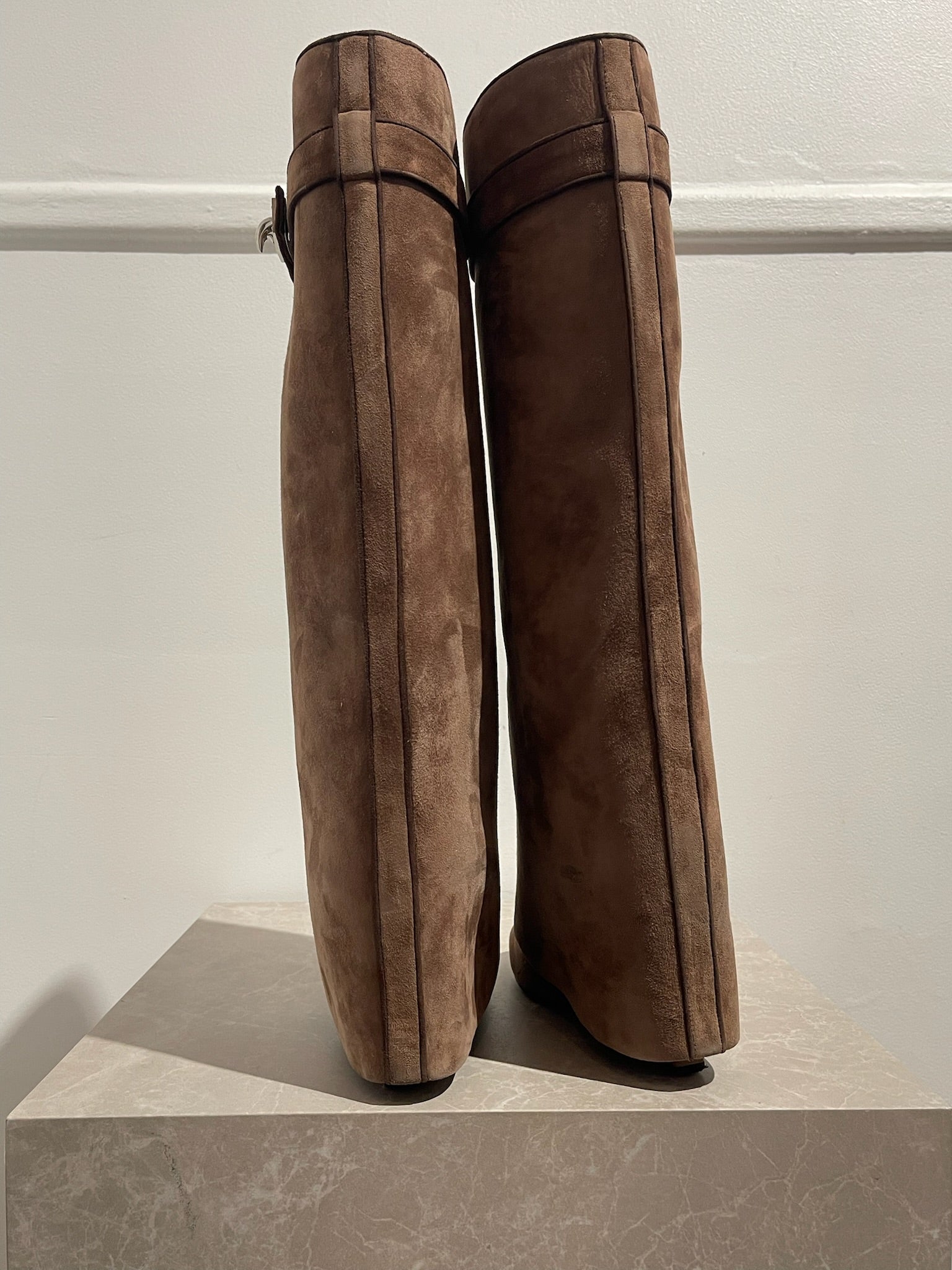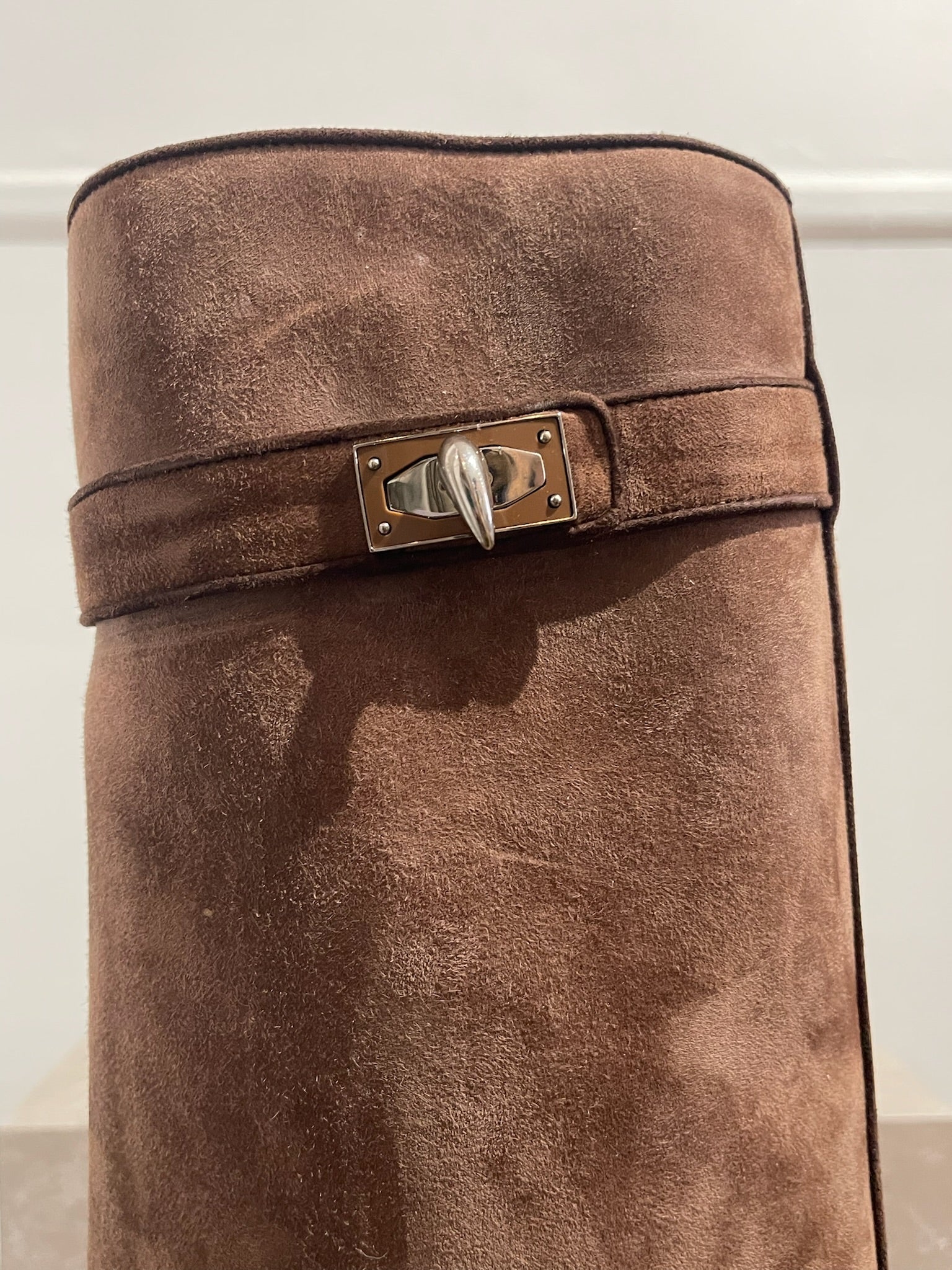 Bottes à fourreau en suédine marron clair avec cadenas Lock sur le côtés et bouts pointus. Hauteur des talons 9 cm, hauteur de la tige 45 cm