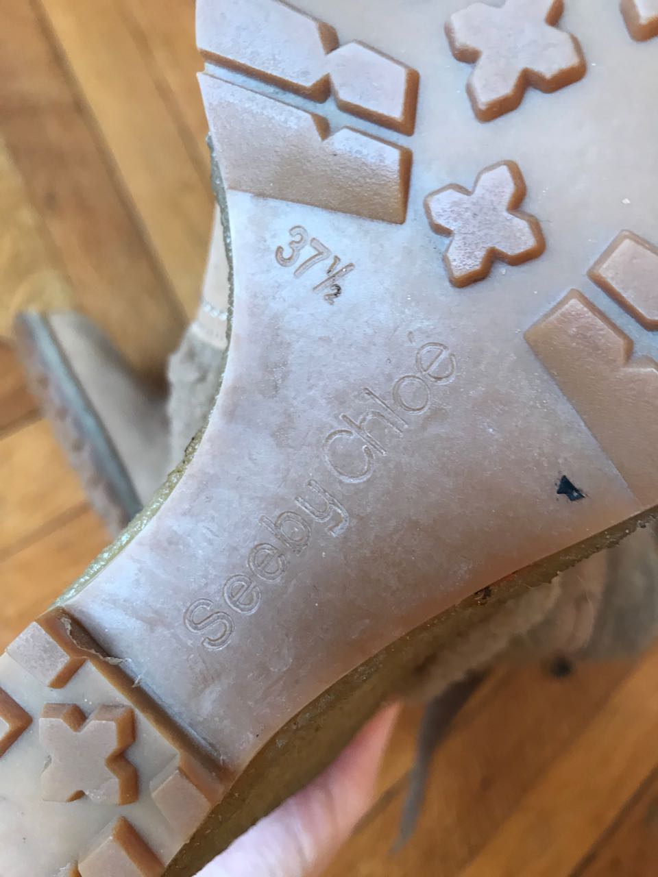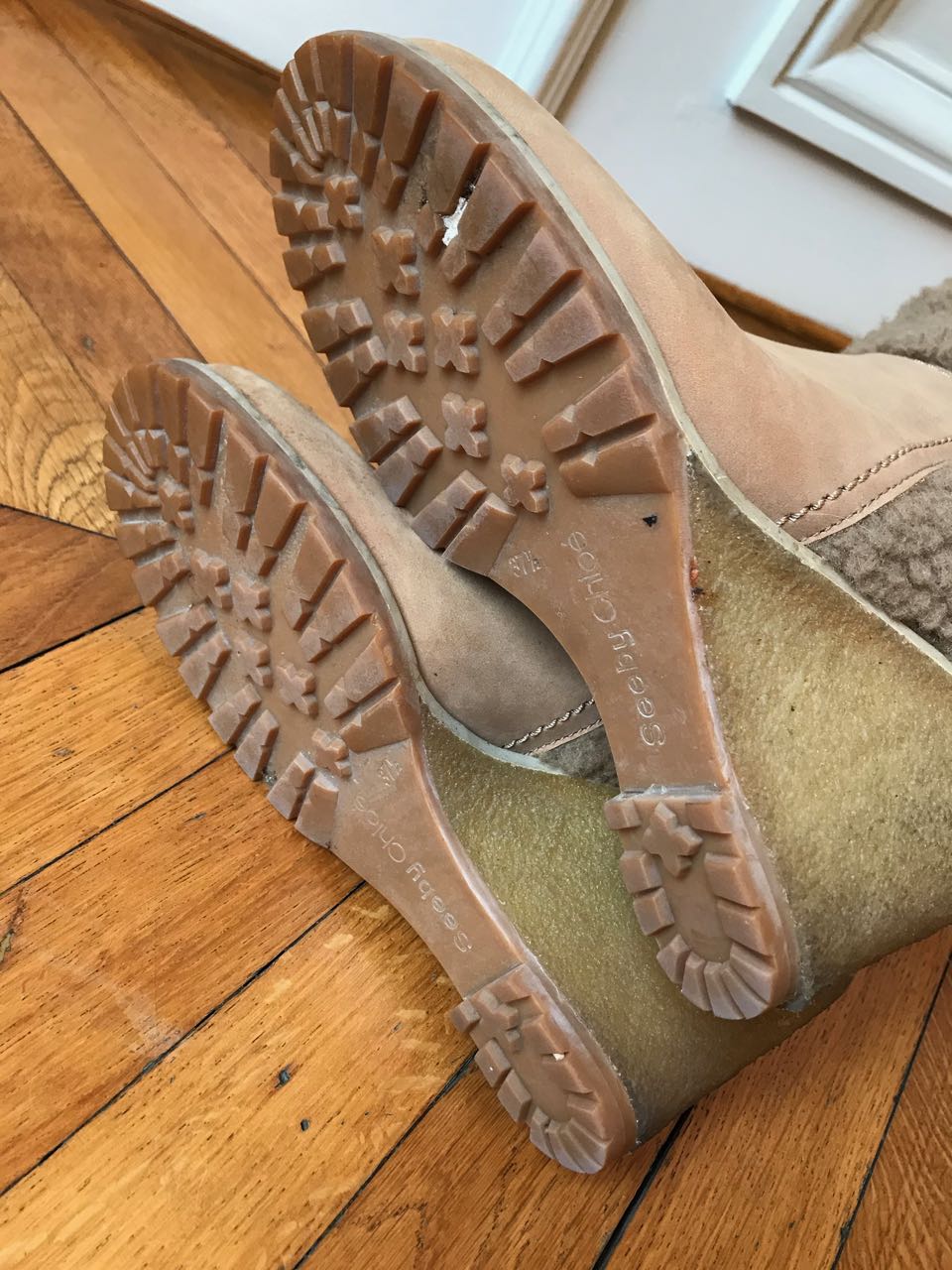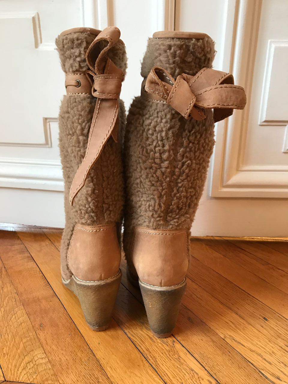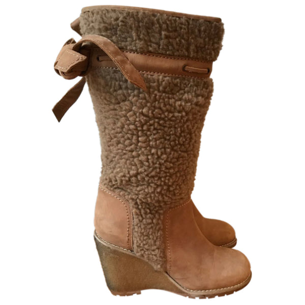 Bottes fourées en daim camel avec talons compensés en gomme. Noeuds décoratifs à l'arrière.