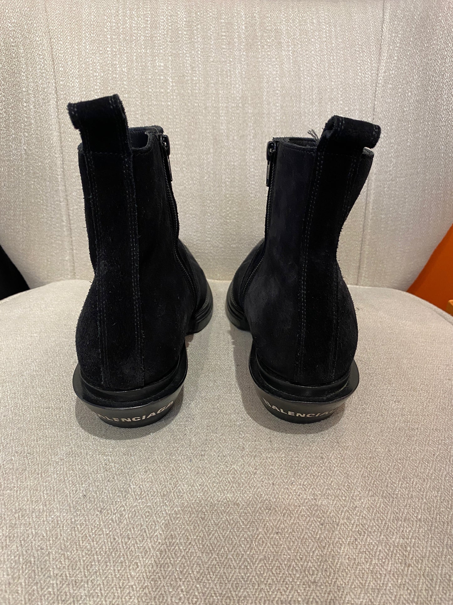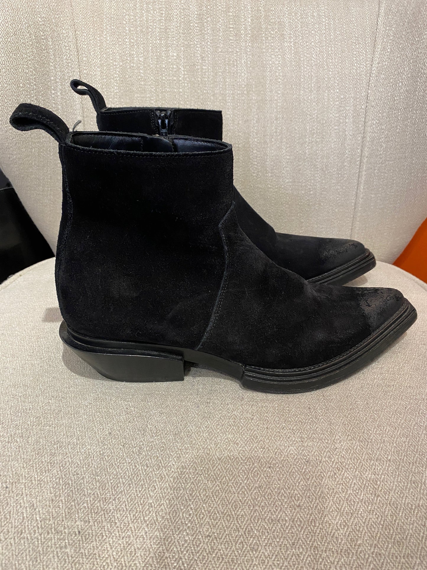 Boots en daim noir, style santiag avec bouts pointus, fermeture zip sur le côté et languette arrière. Signé Balenciaga sur le talon arrière. Effet usé d'origine.