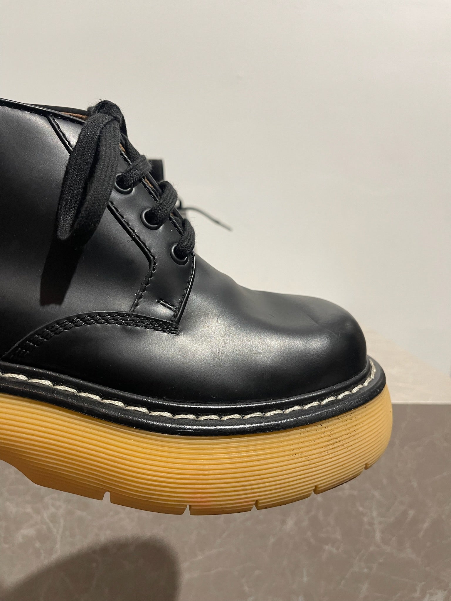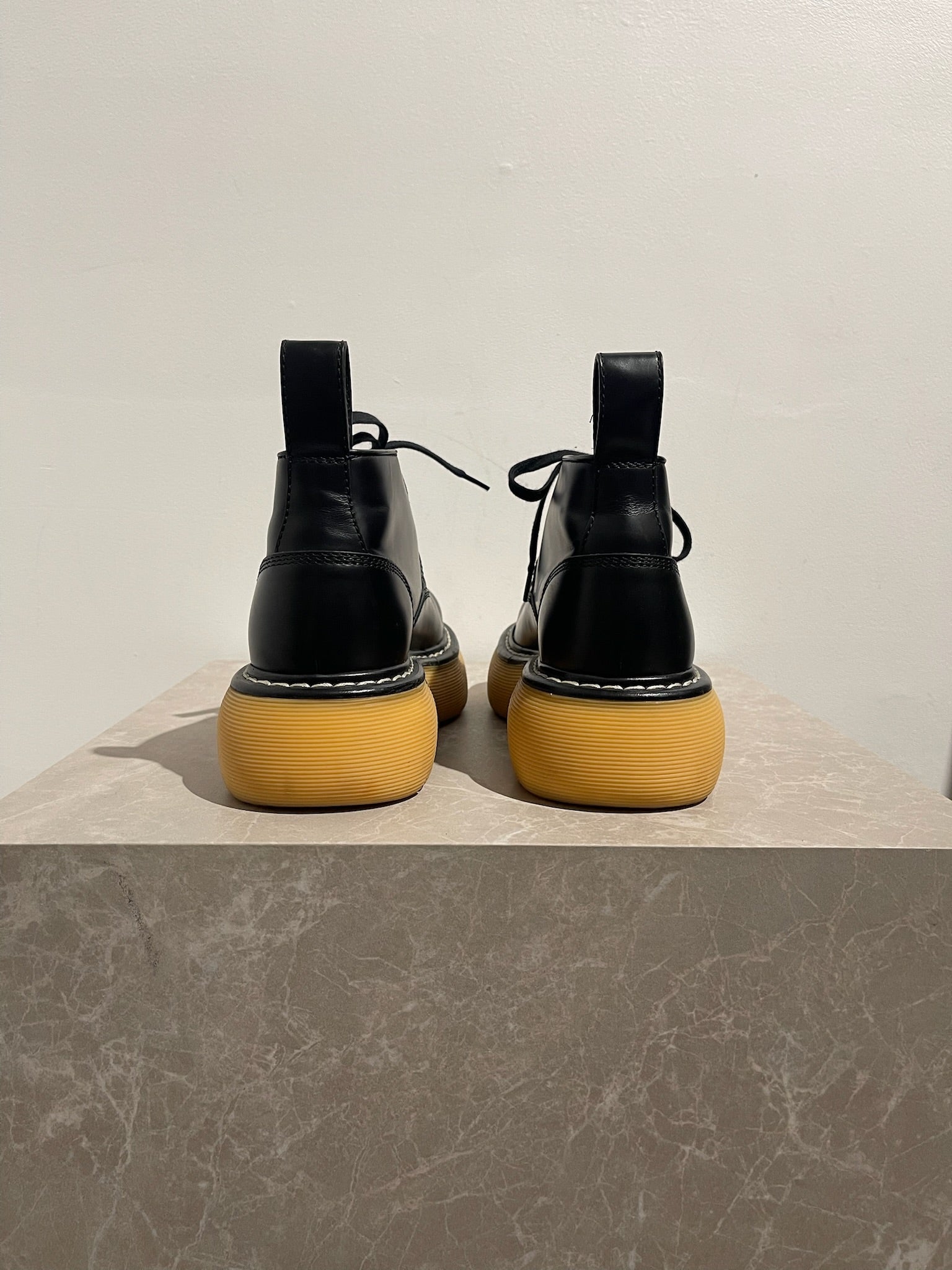 Bottines en cuir de veau noir avec surpiqûre blanc cassé à la trépointe. Semelle à plateforme en caoutchouc brun clair.