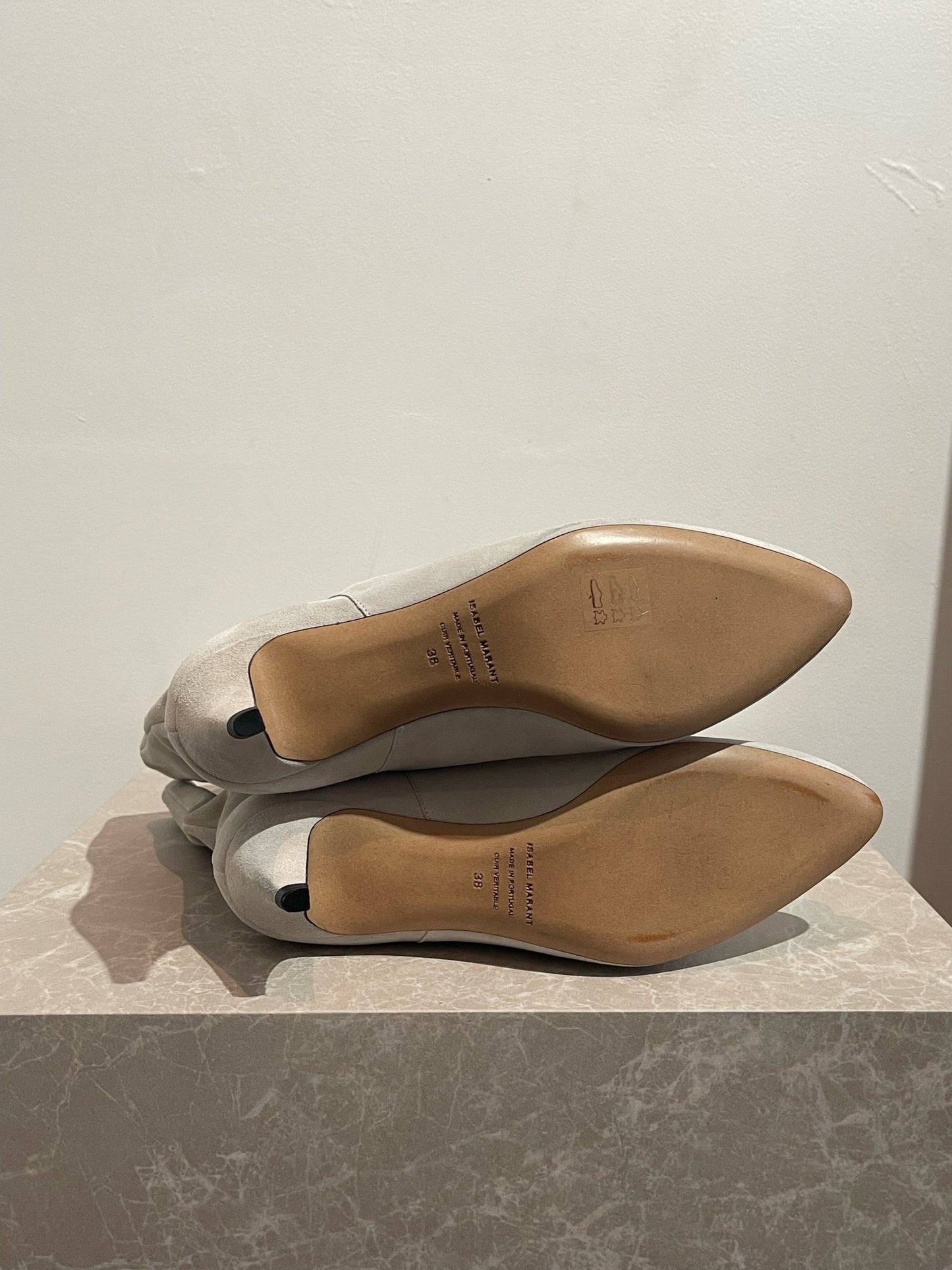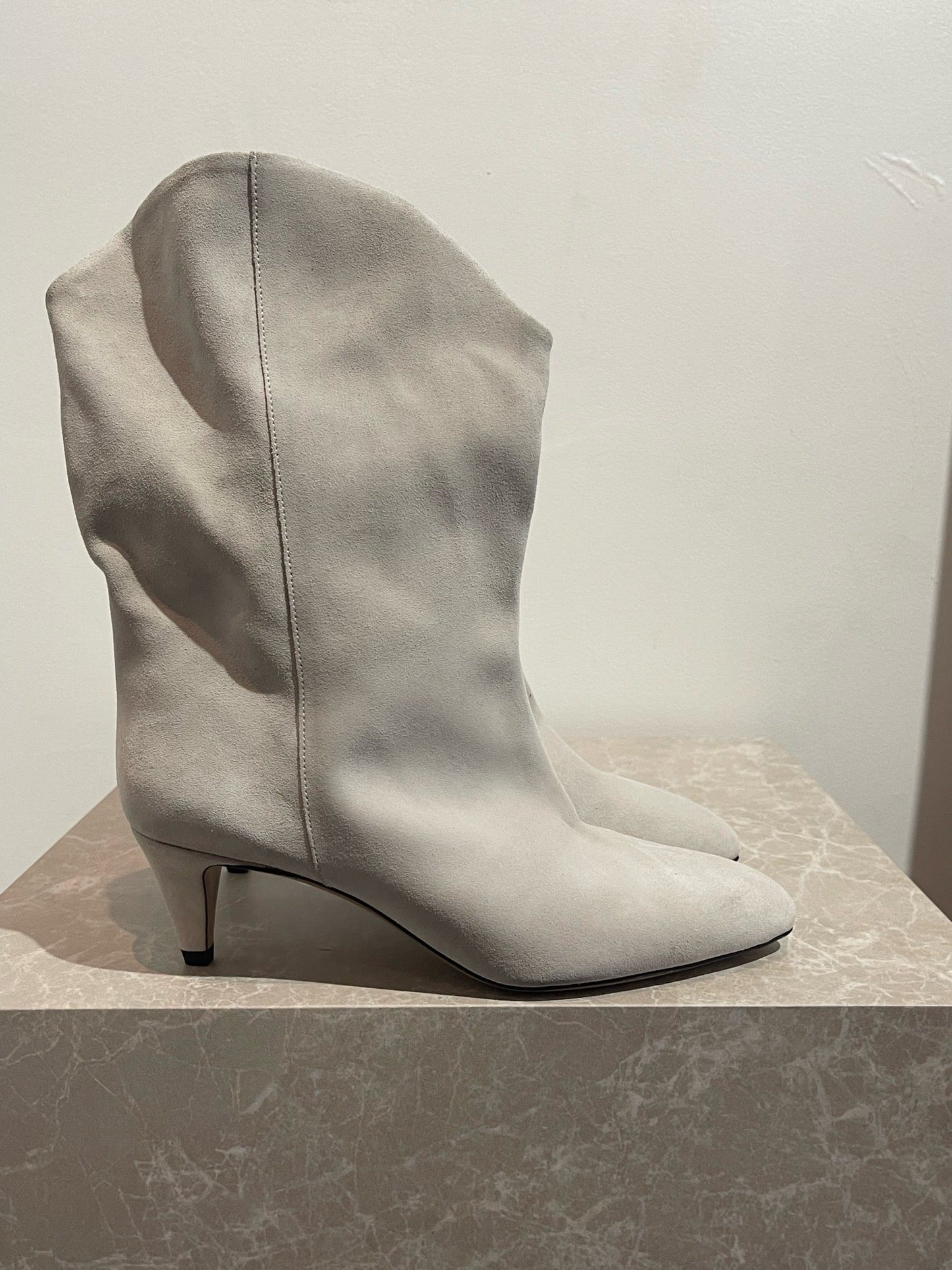 Boots santiags en daim gris clair avec bouts pointus.