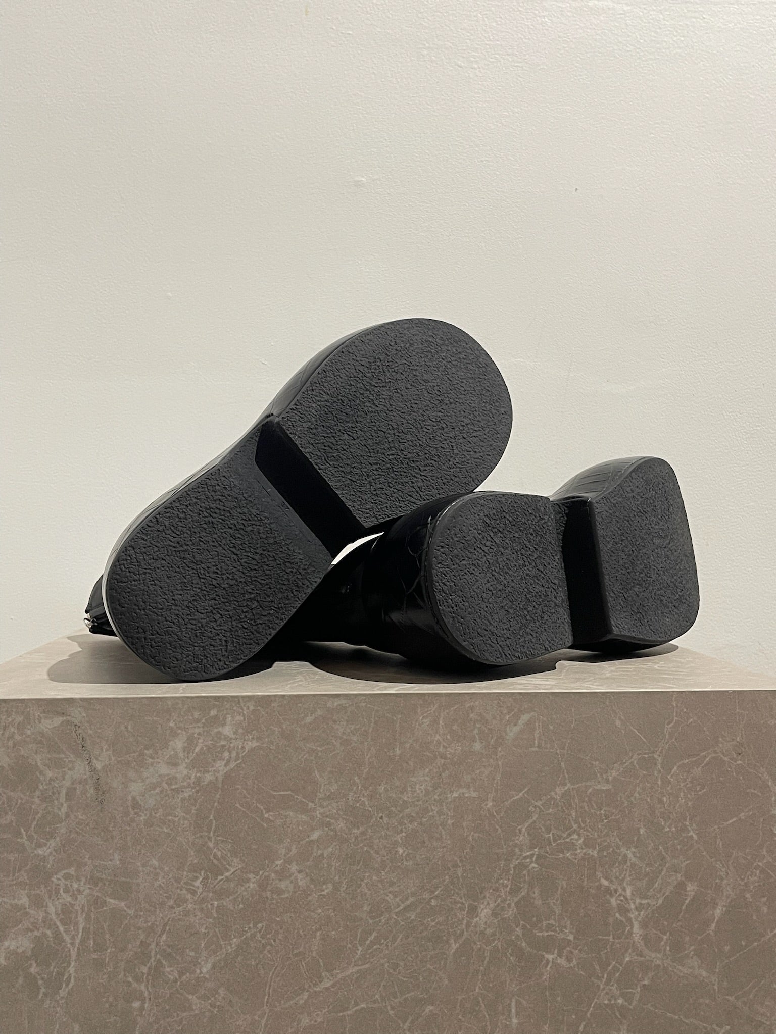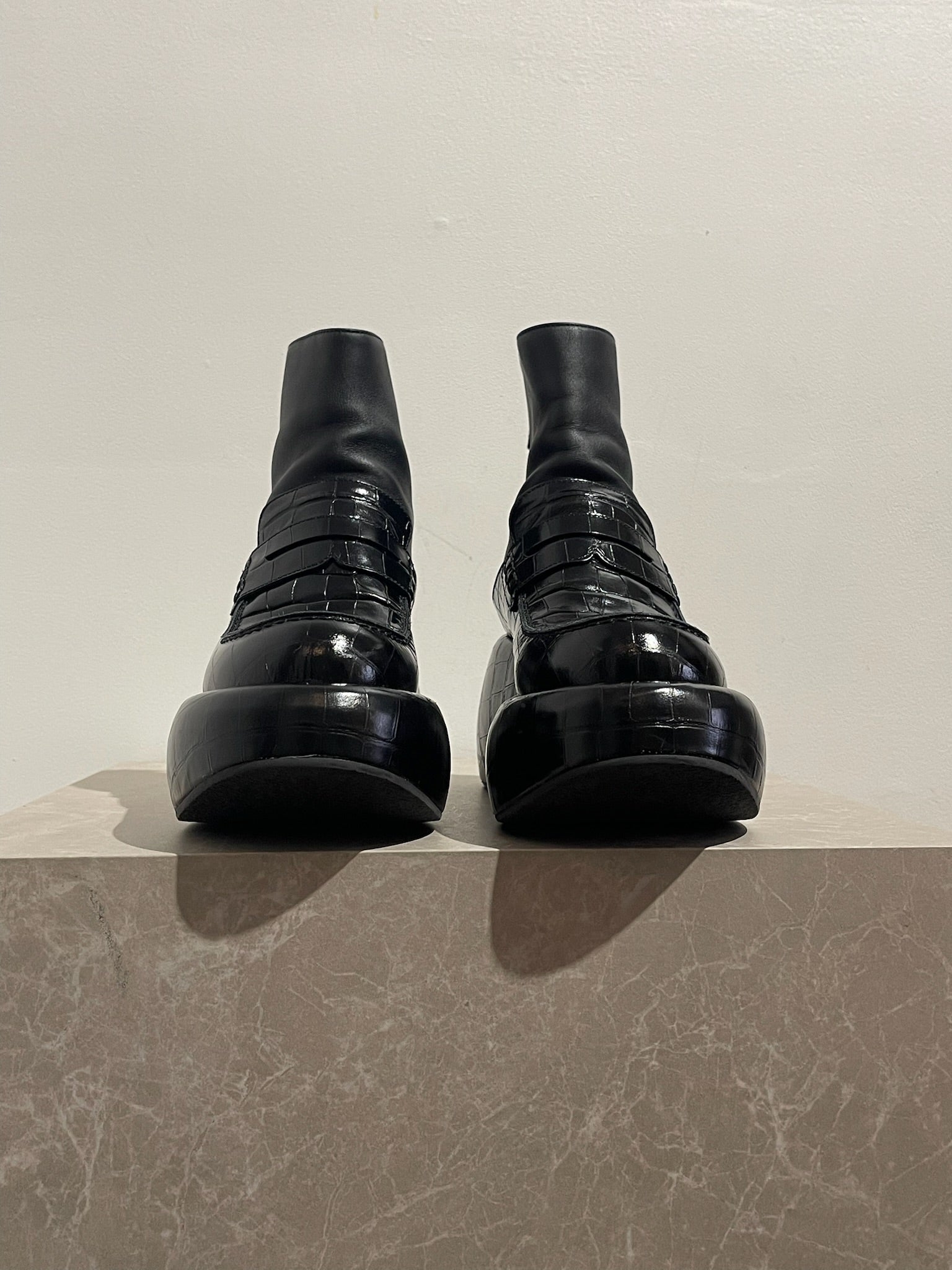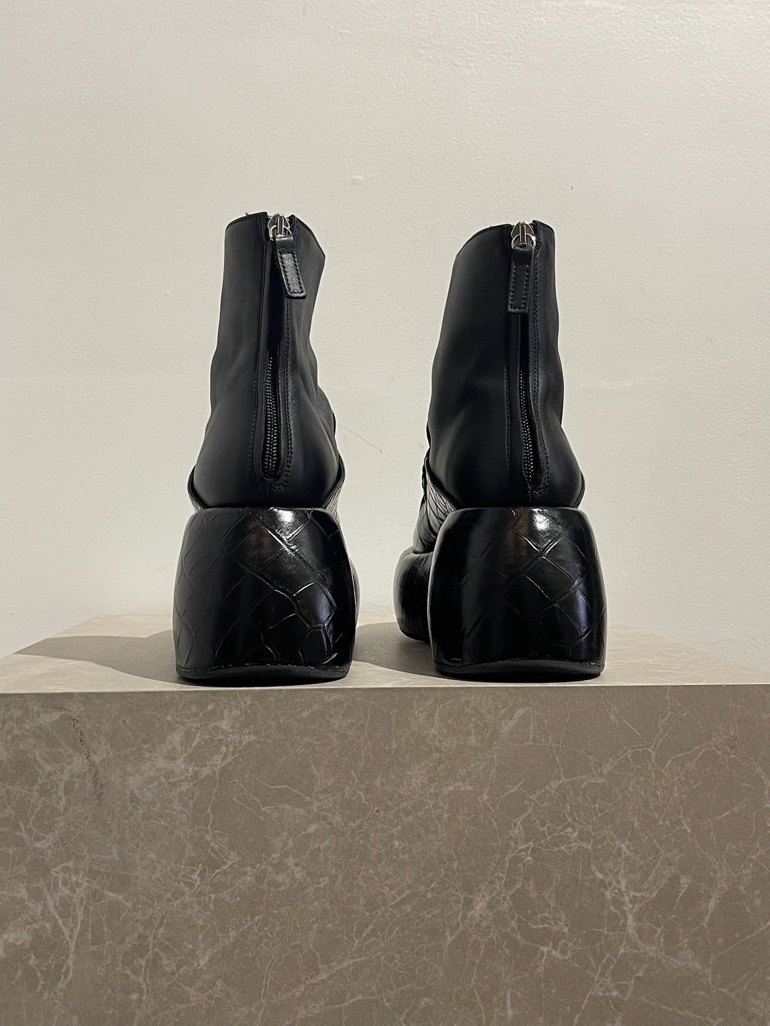 Bottines effet mocassins en cuir embossé croco et empiècements en cuir lisse à la cheville. Bout rond. Fermeture zippée à l'arrière.