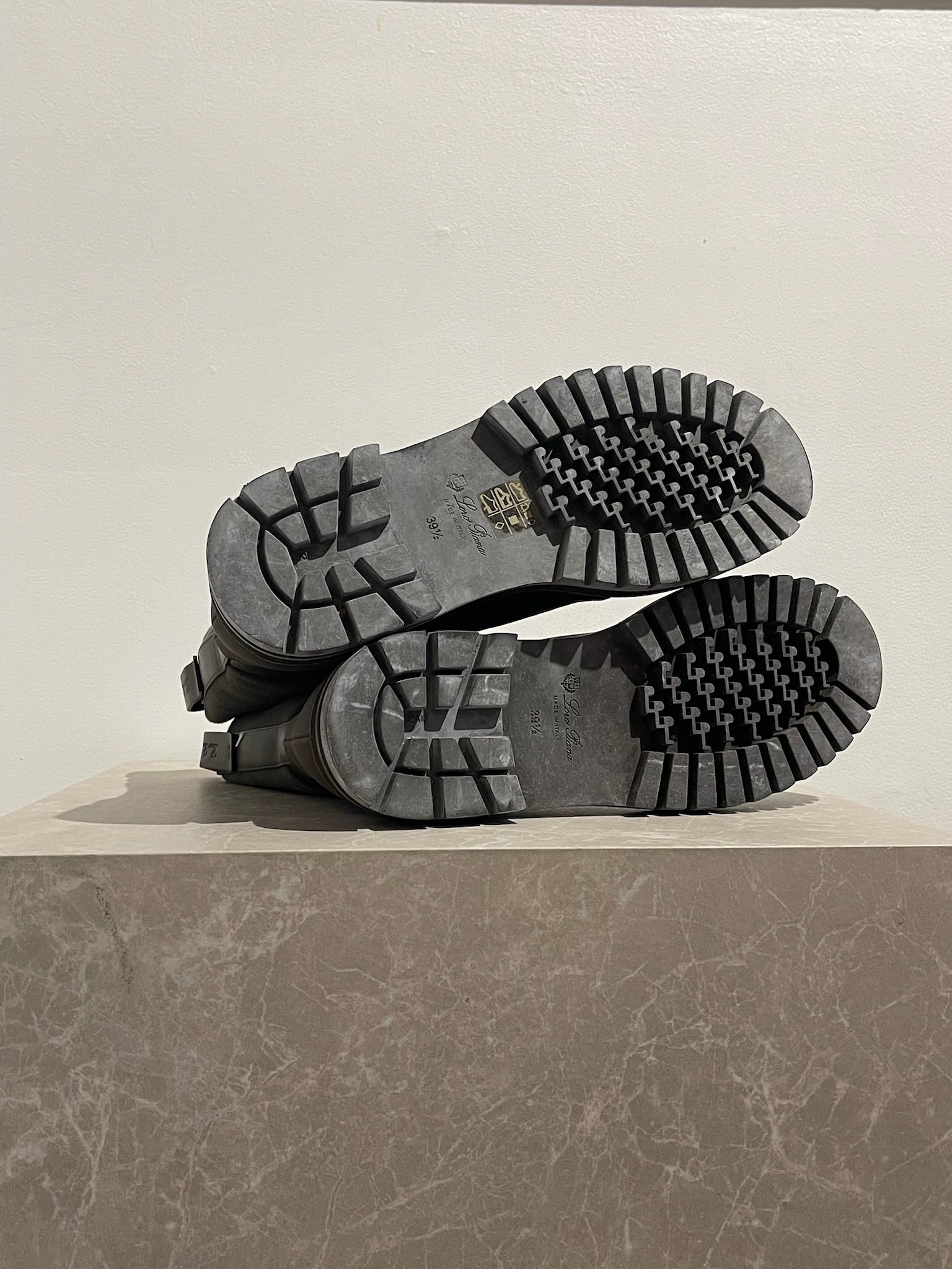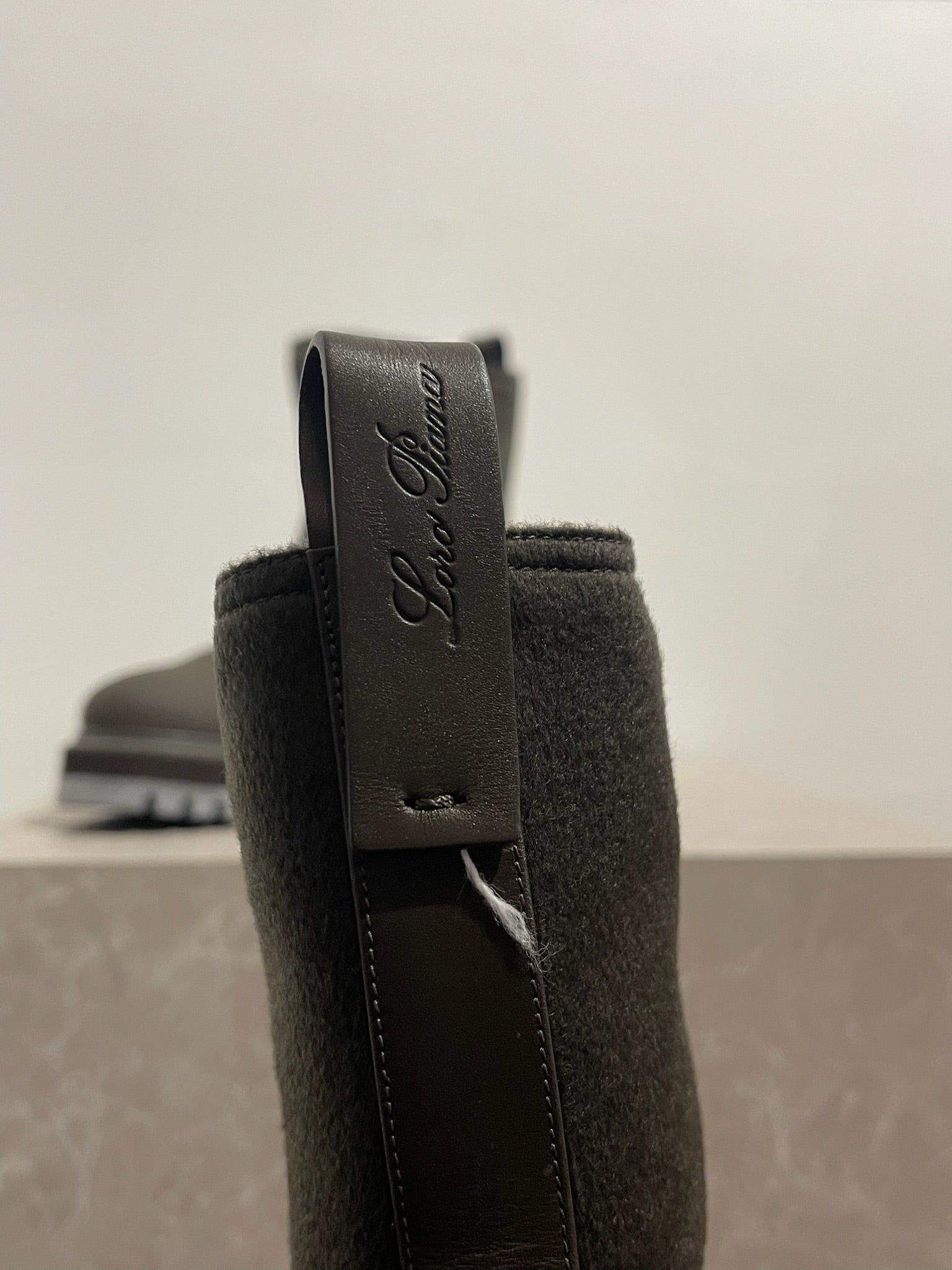 Bottines bi-matieres en cuir et caoutchouc marron avec détail en cachemire à la cheville. Semelles crantées en caoutchouc (4cm)