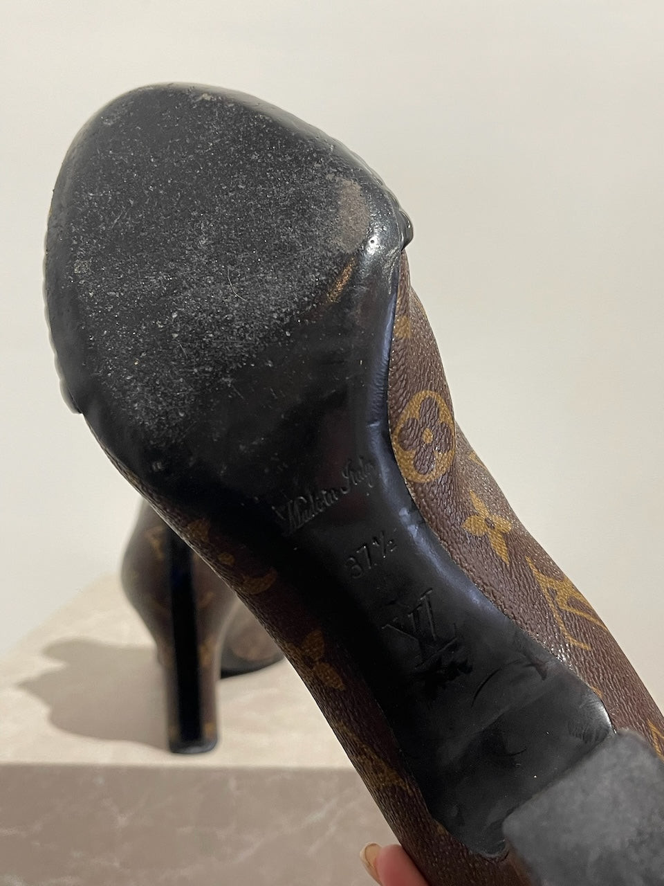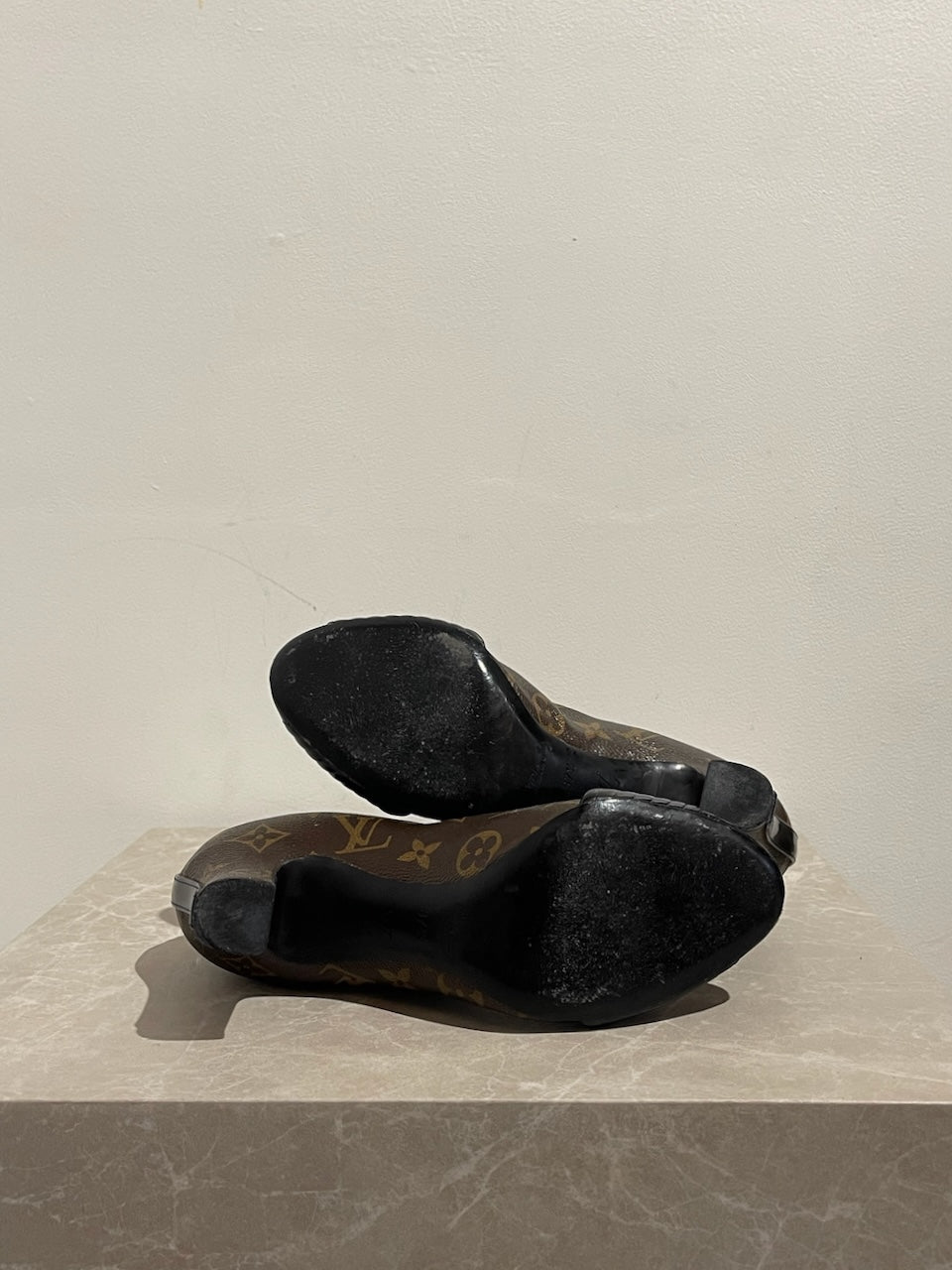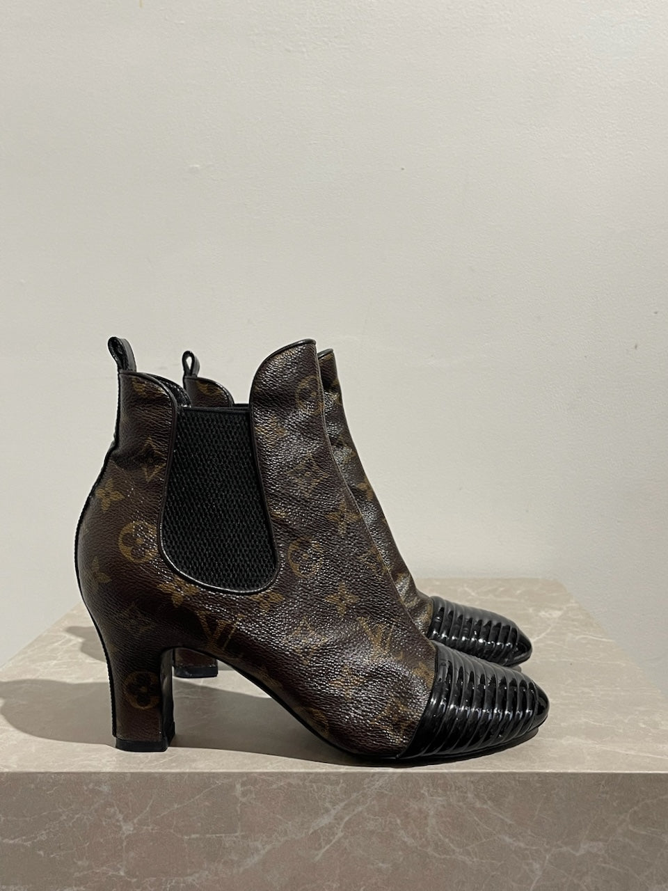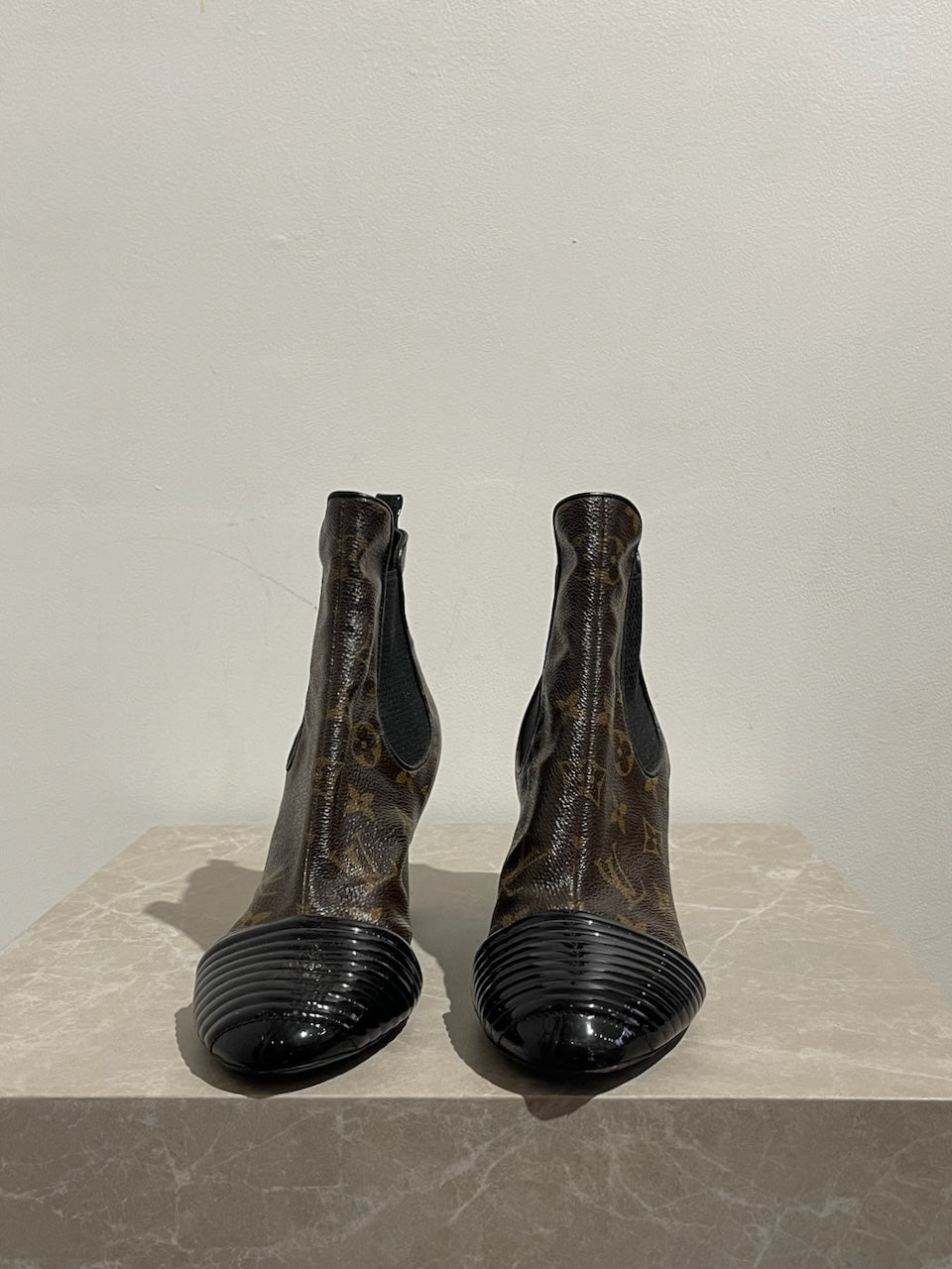 Boots à talon en toile Monogram marron, bouts en cuir vernis noir, élastiques sur les cotés.