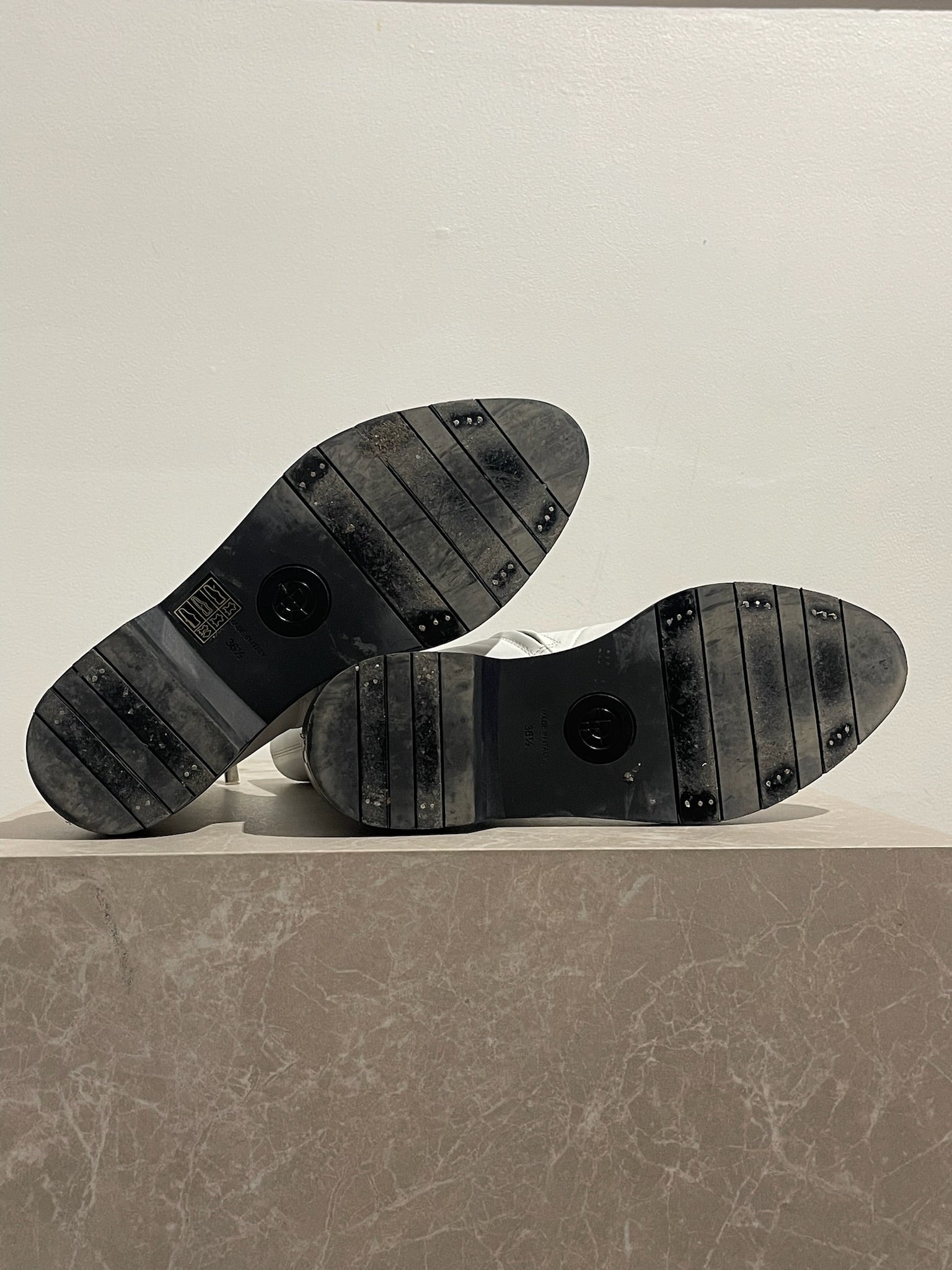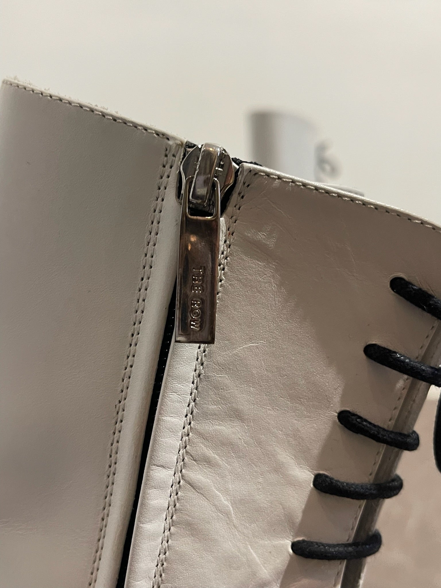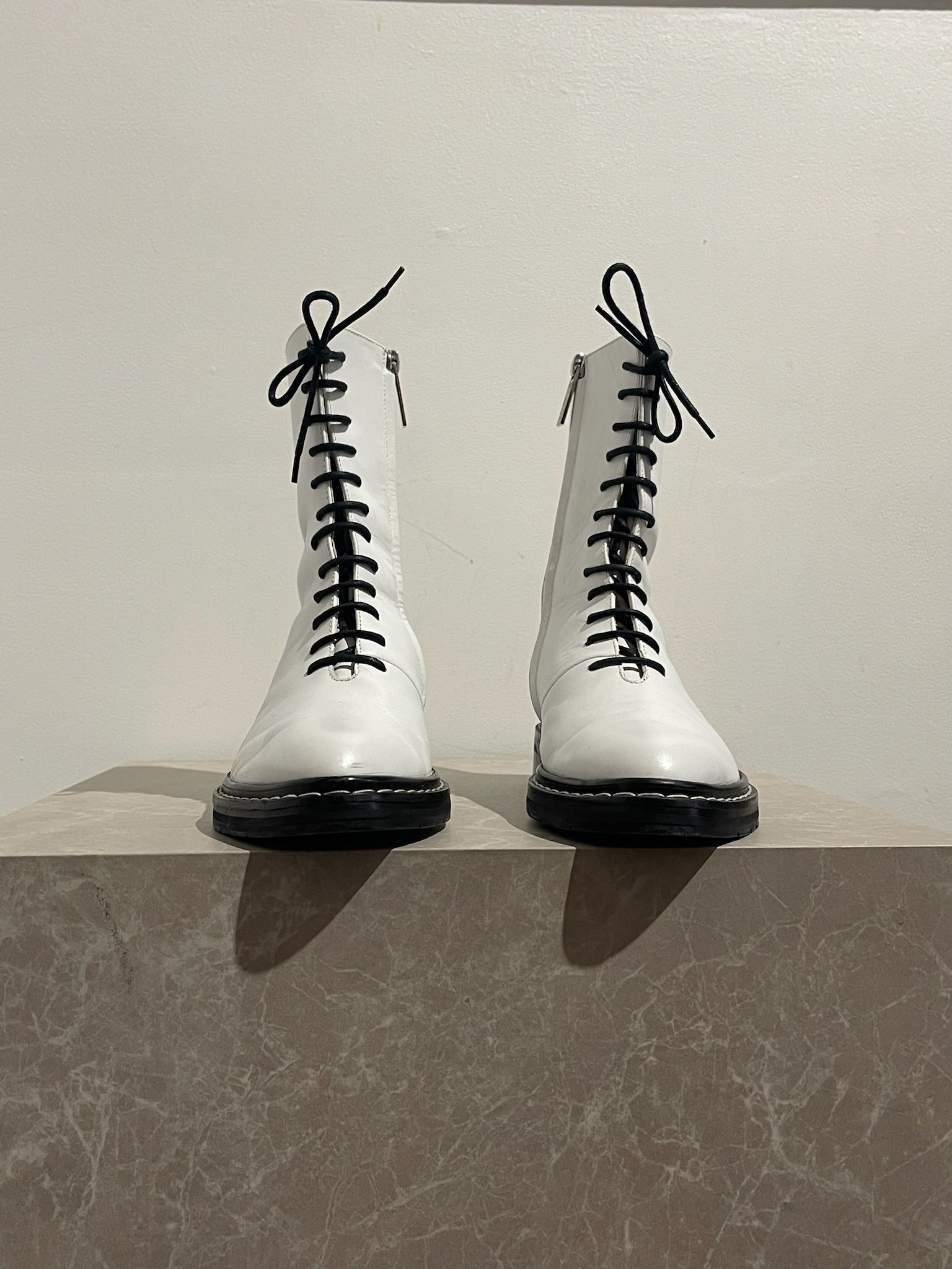 Bottines en cuir blanc avec fermeture à lacet noir à l'avant et fermeture zippée sur le côté. Bouts en amande. Semelle noir avec petit talon (4 cm)