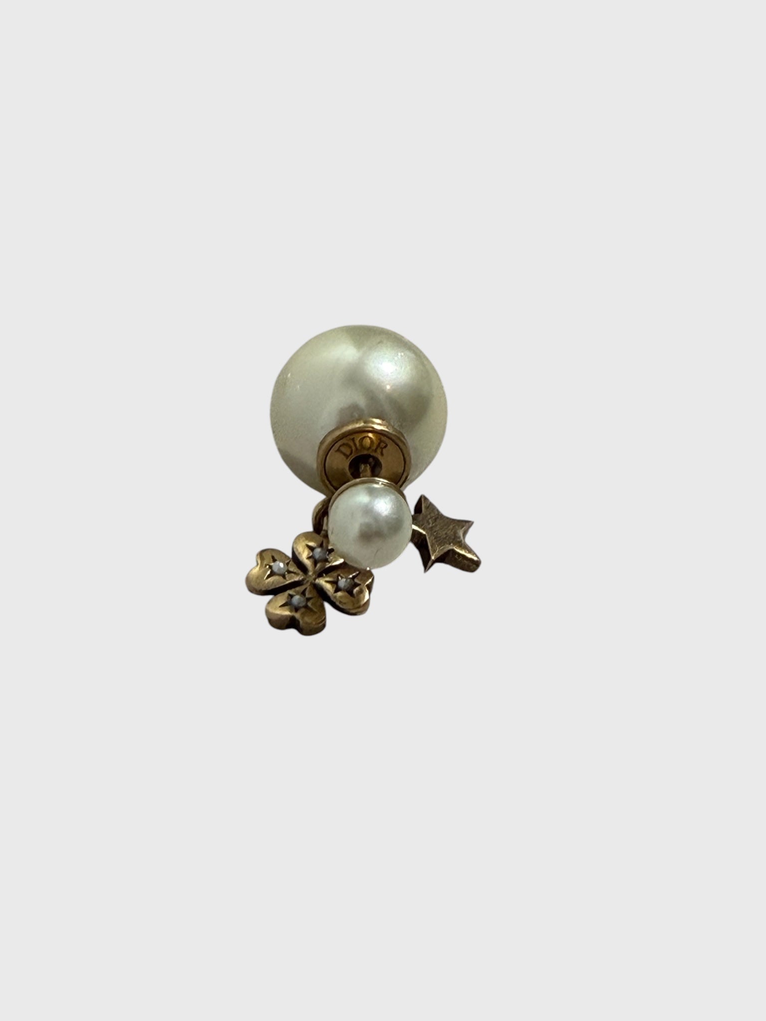 Boucles d'oreilles perle nacre blanche, avec pendentif étoile et trèfles d'un coté et coeur et strass de l'autre. Fermeture clous perle. Signé Dior sur le métal.