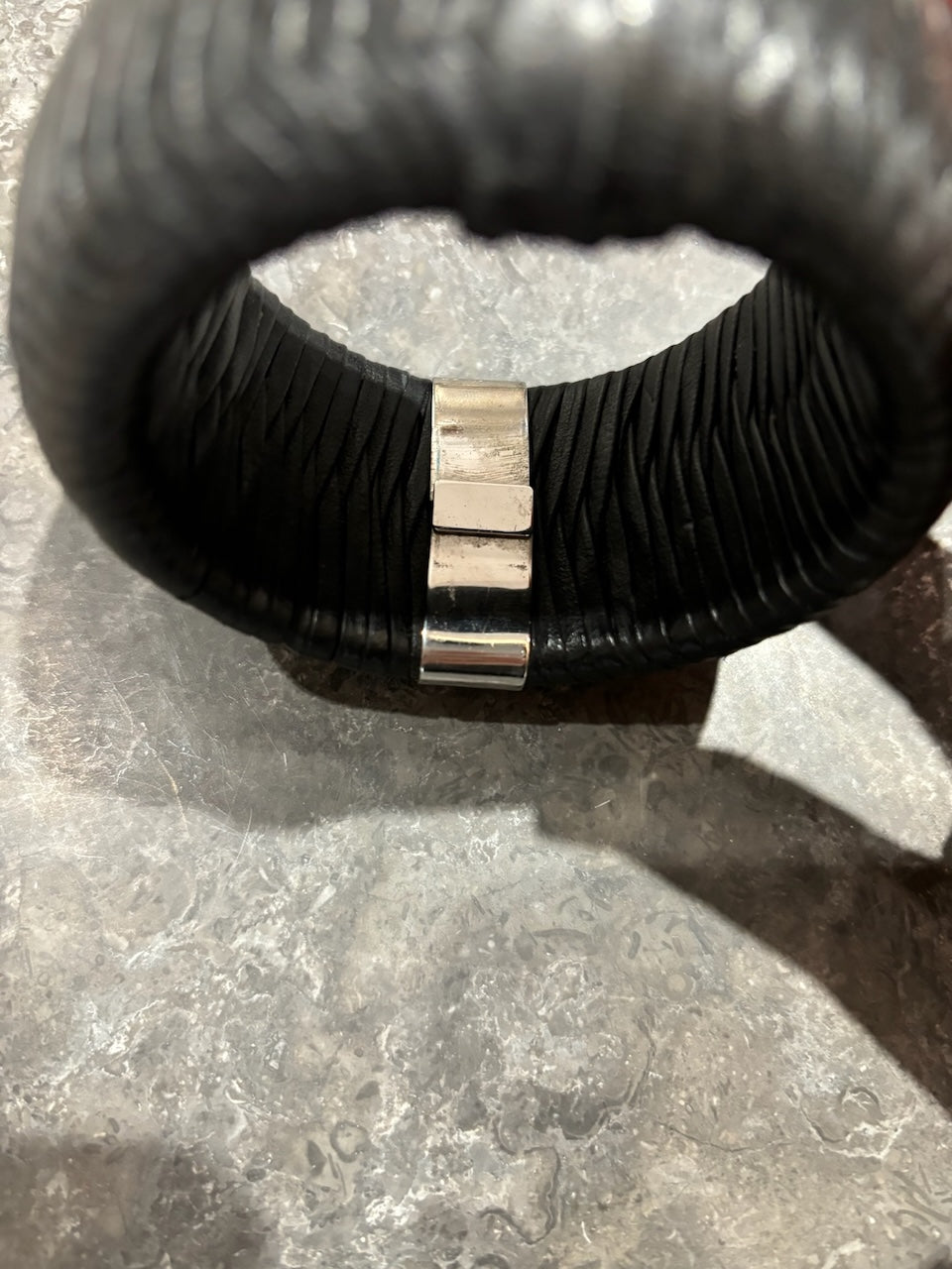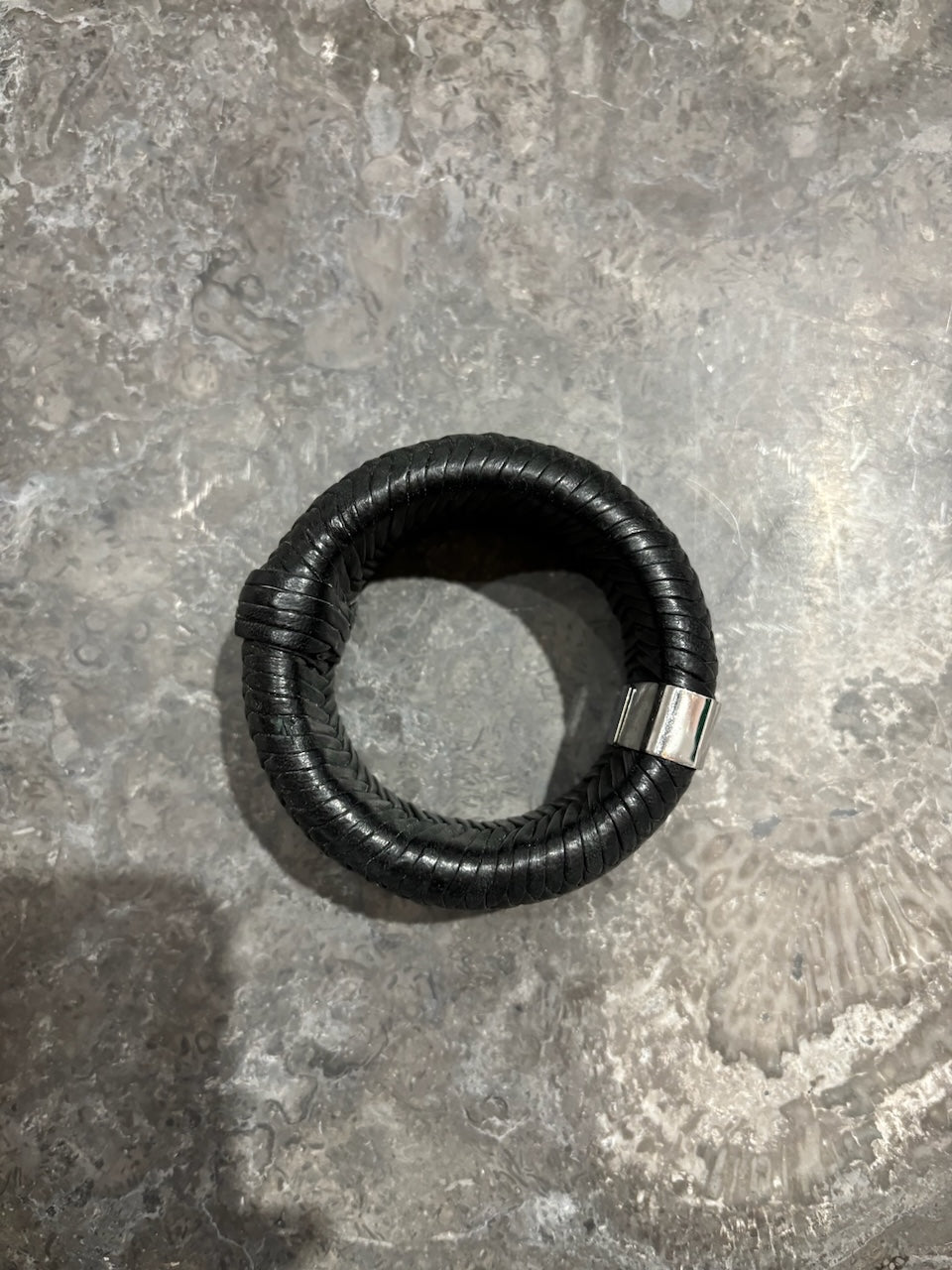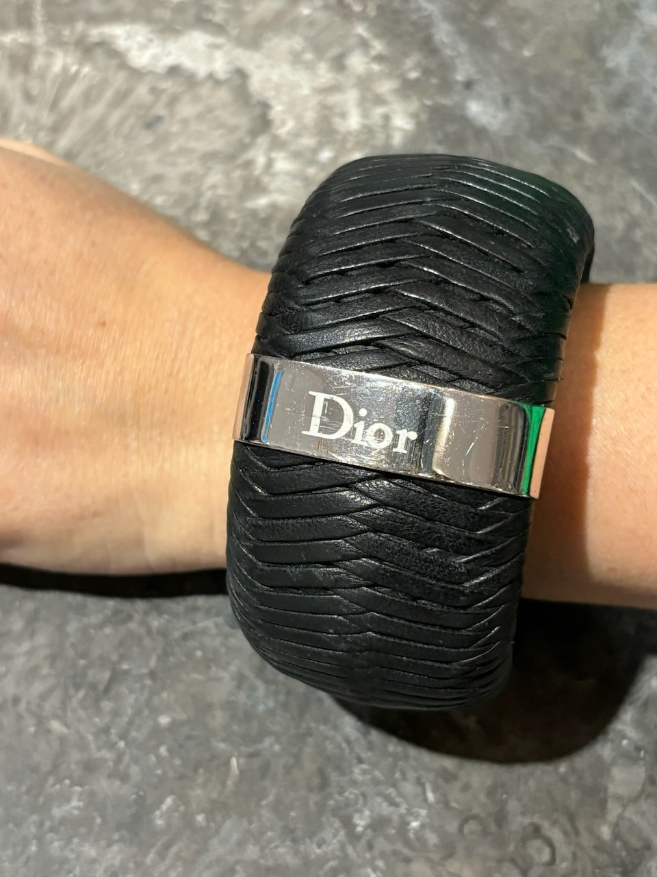 Manchette large en cuir tressé noir avec fermoir en métal argent signé Dior.