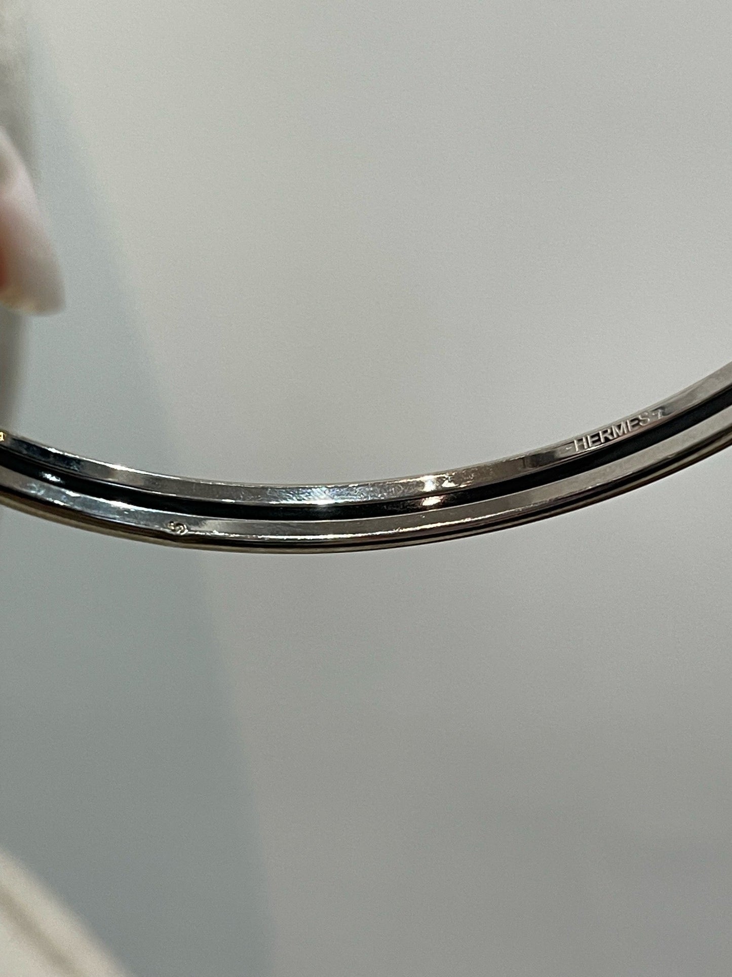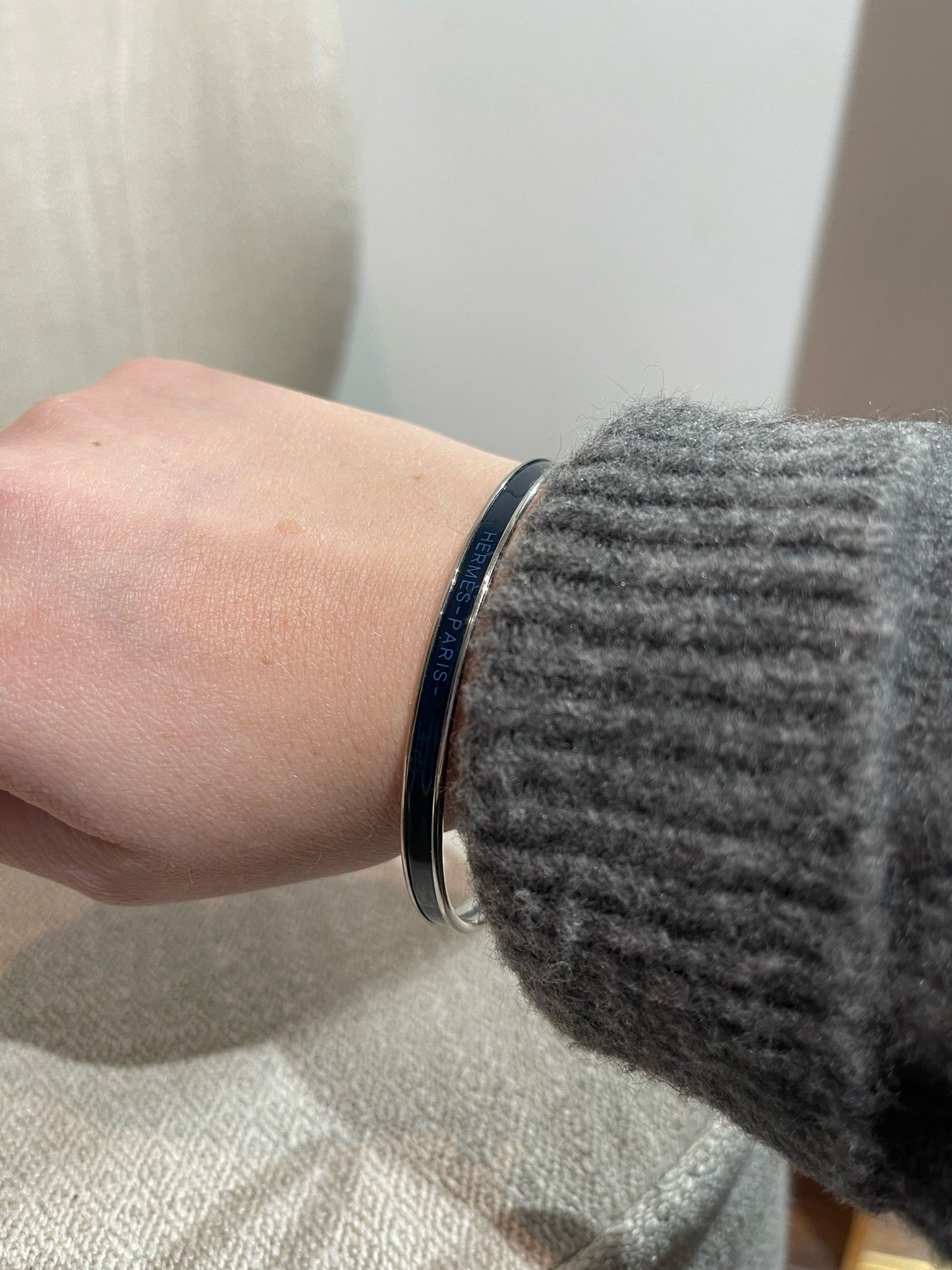 Bracelet jonc extra-fin en émail argent et bleu nuit orné du logo Hermès Paris.
