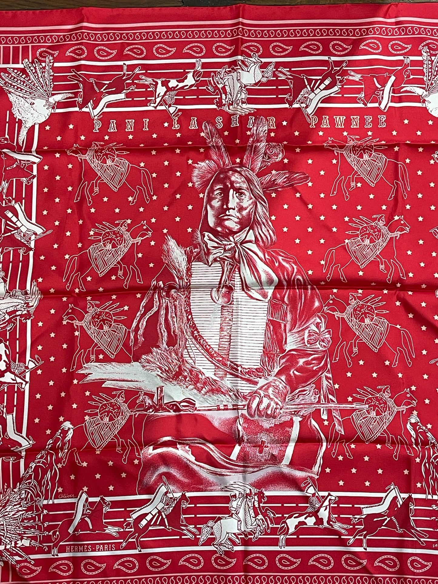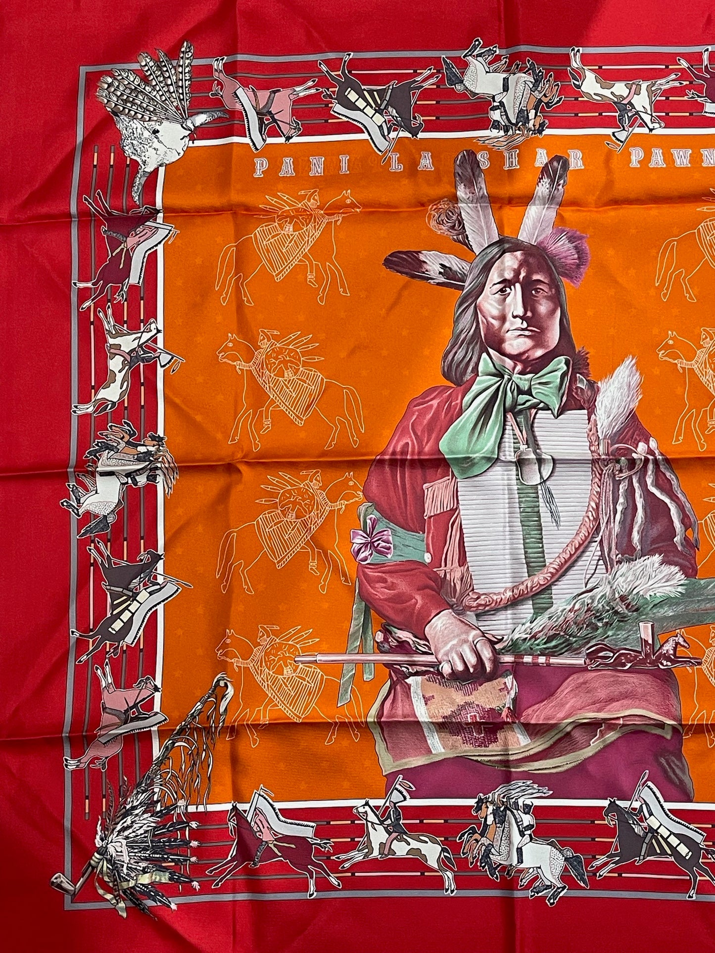Foulard réversible en soie orné d'un indien, par Kermit Oliver.