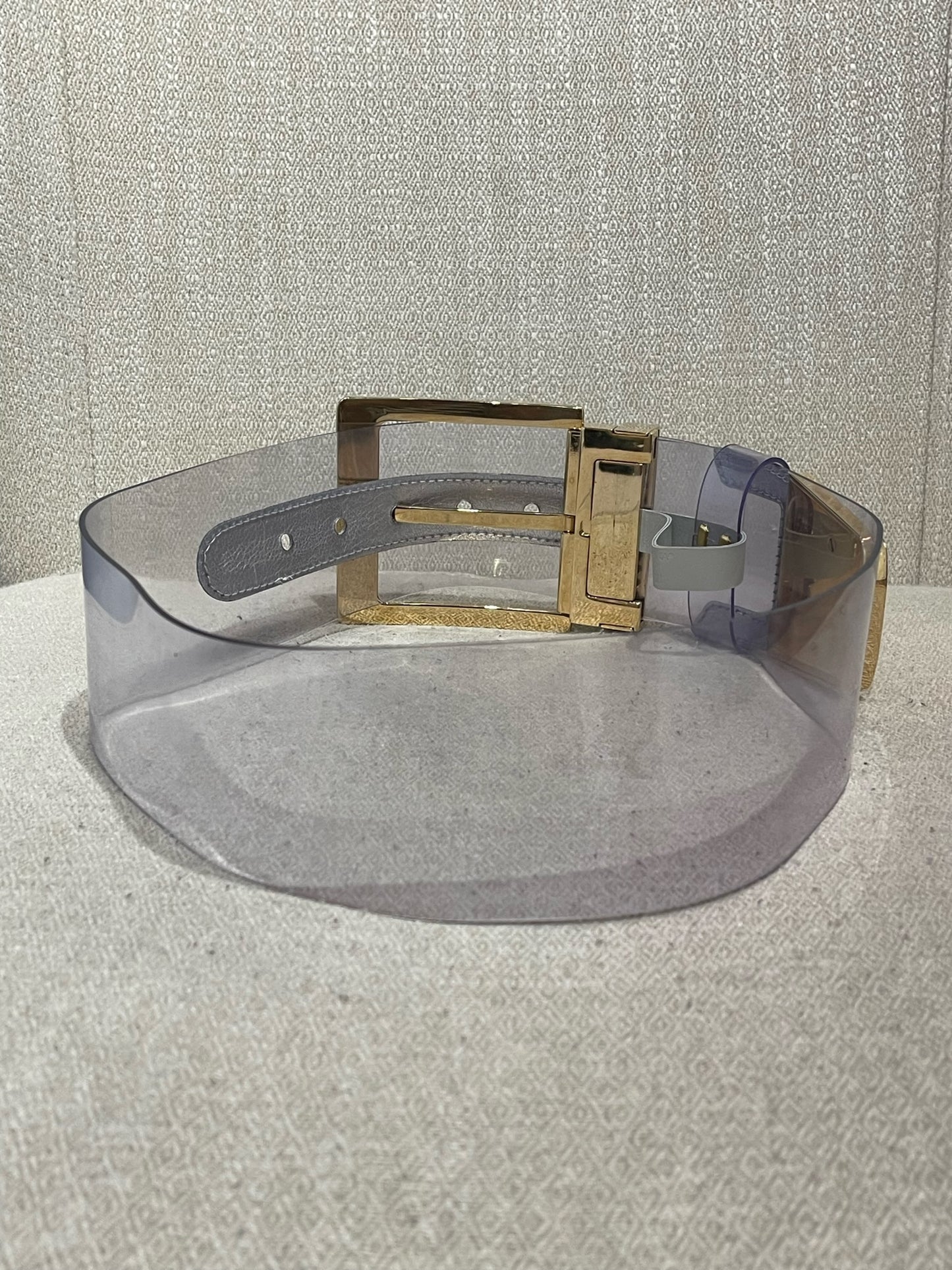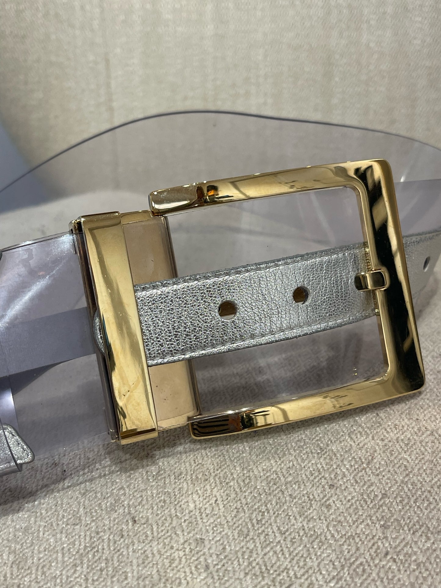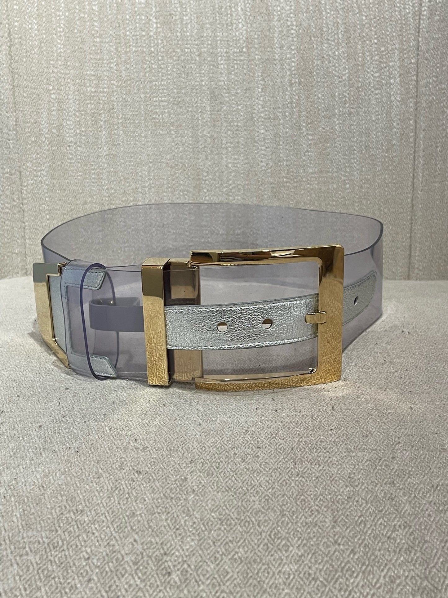 Ceinture en plexi transparant et cuir argenté avec large boucle ajustable en métal doré.