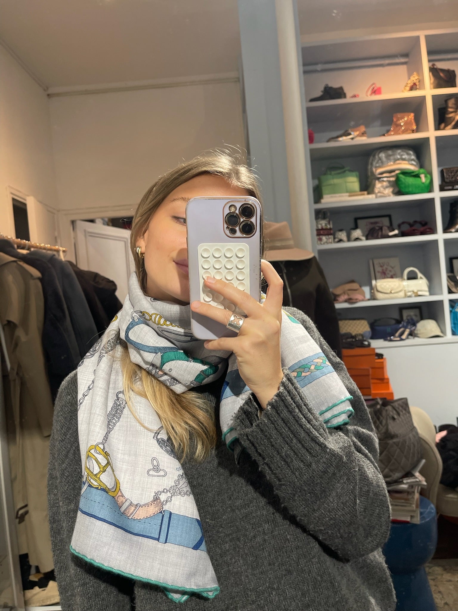 Châle en cachemire et soie gris avec imprimés boucles de ceinture dans les tons bleu.