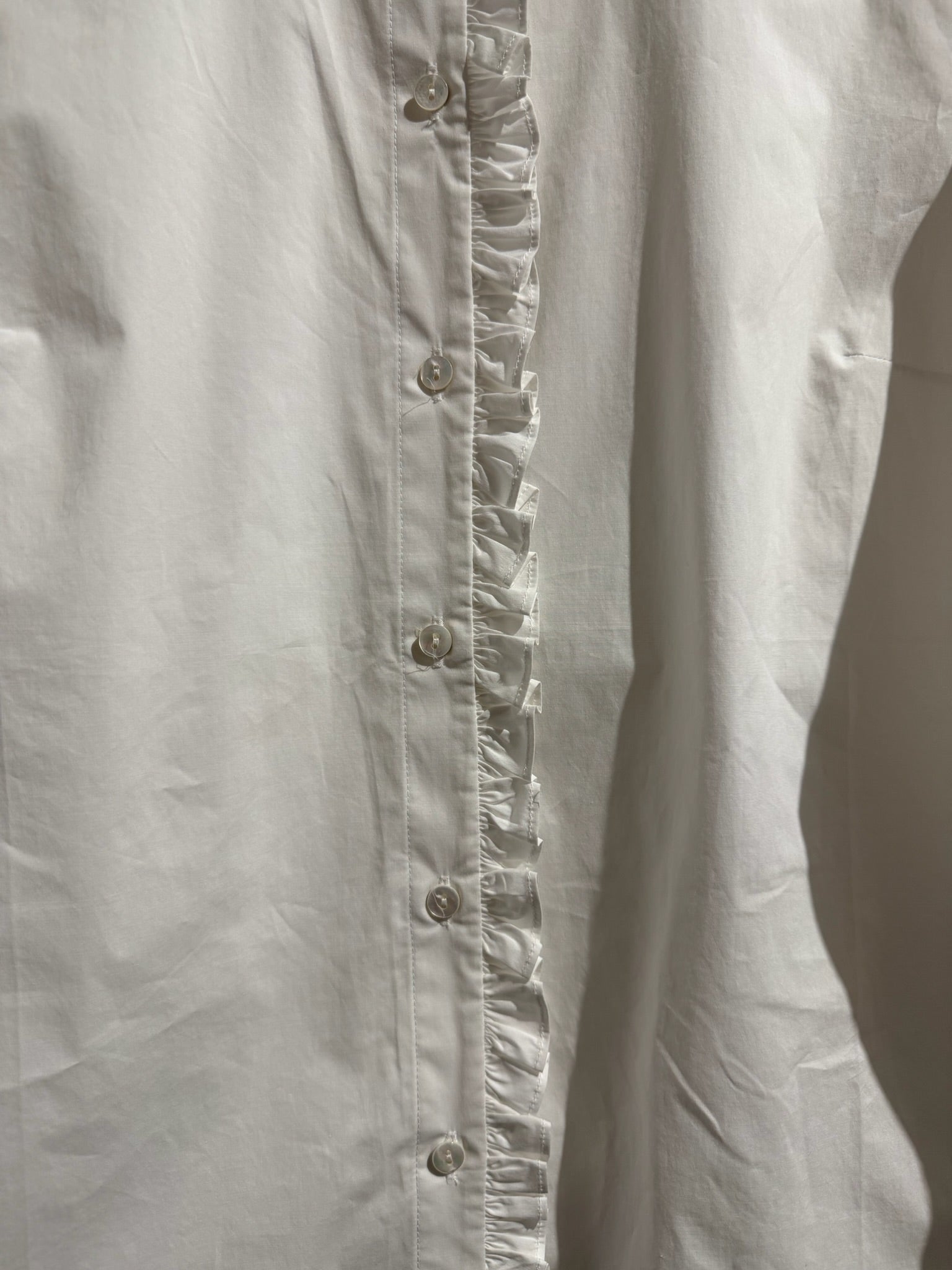 Chemise manches longues en coton blanc. Col claudine avec détail de bouches en perles rouges. Fermeture boutonnée.