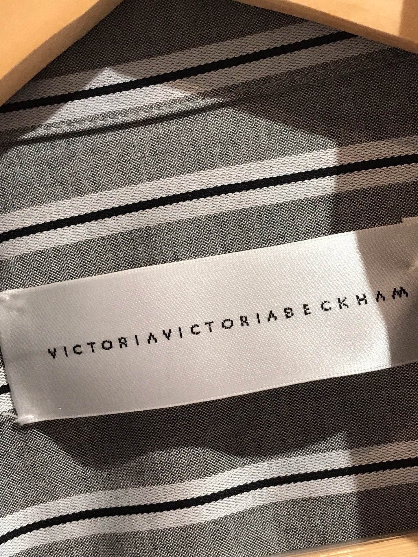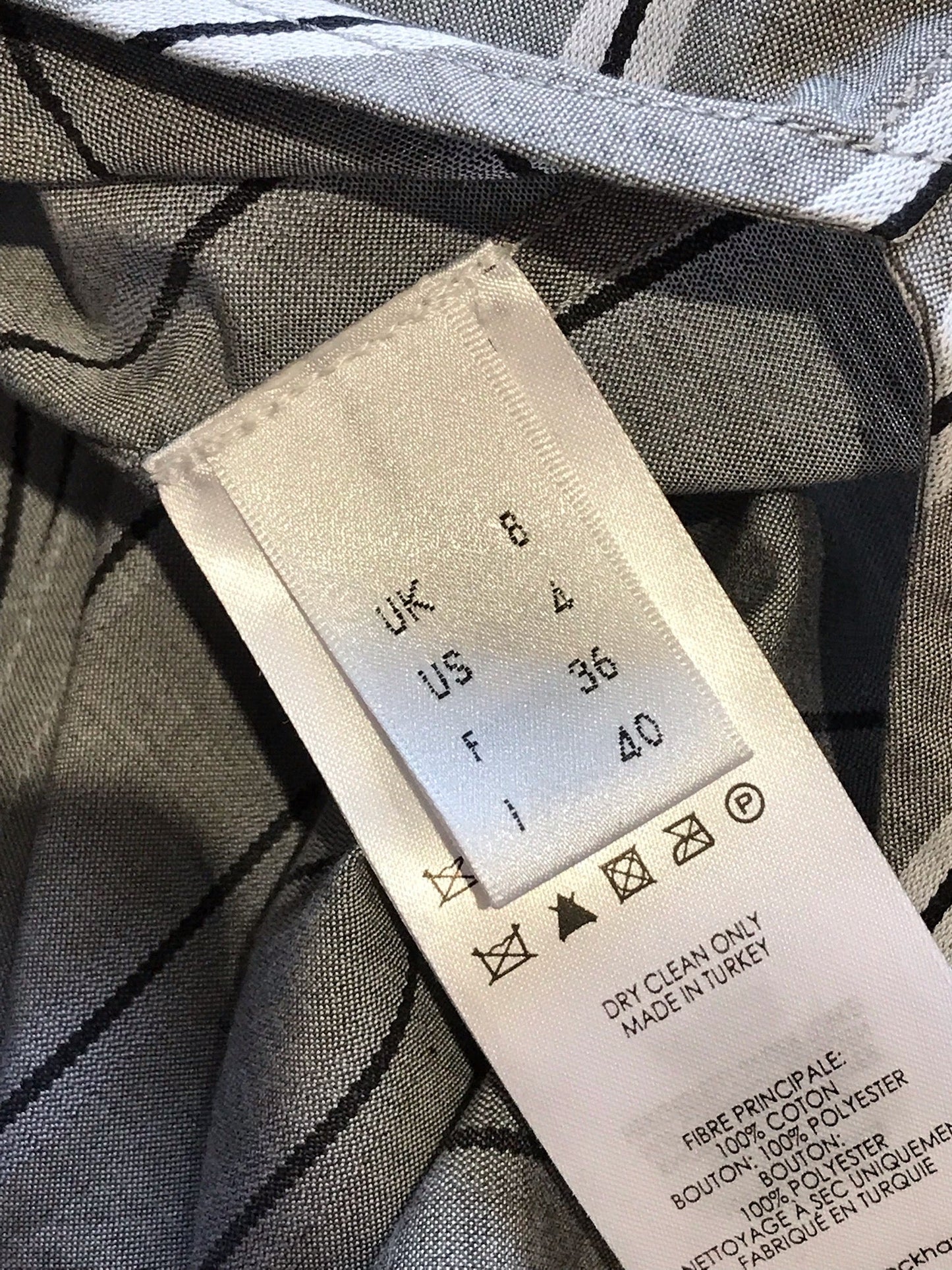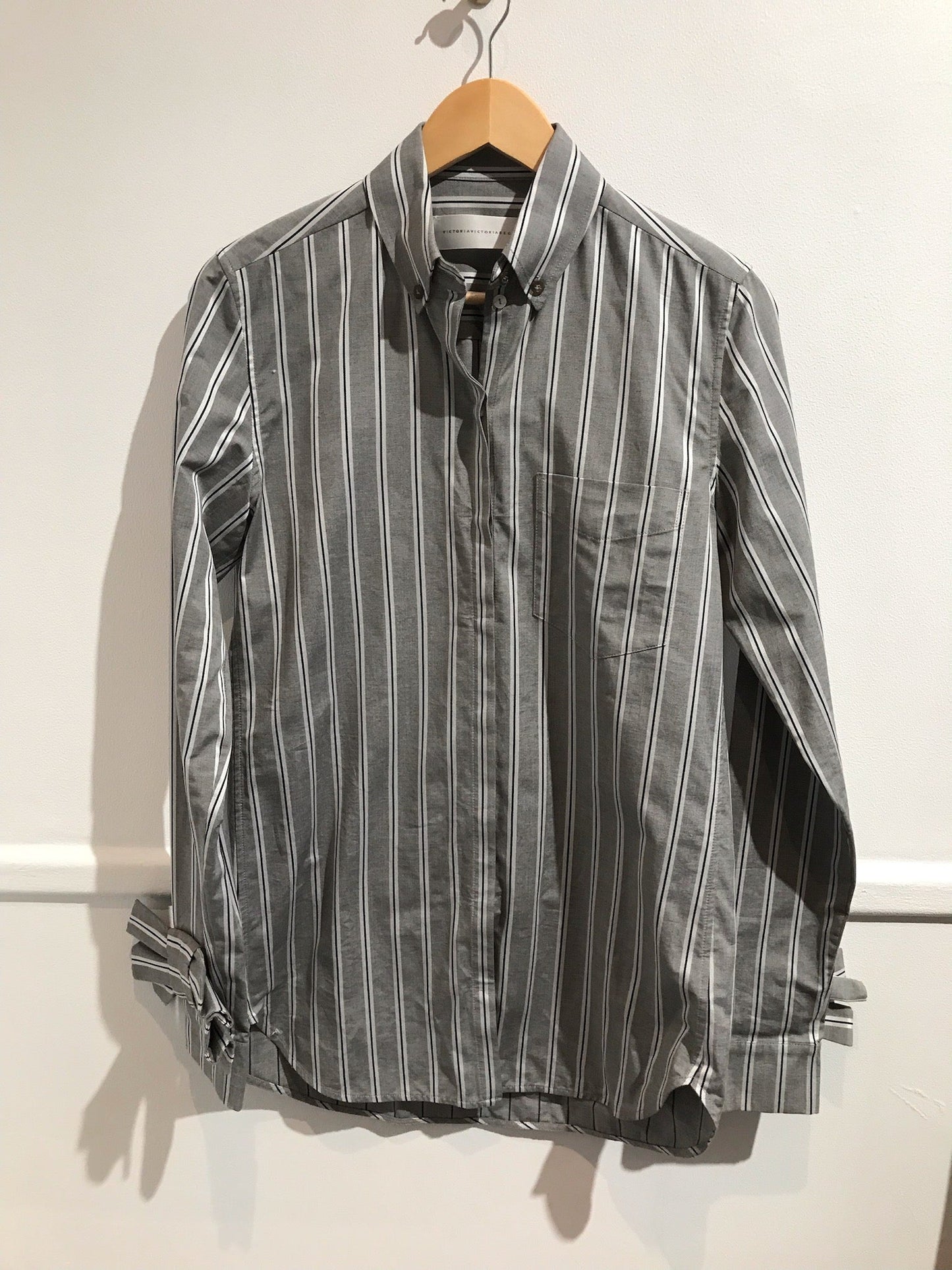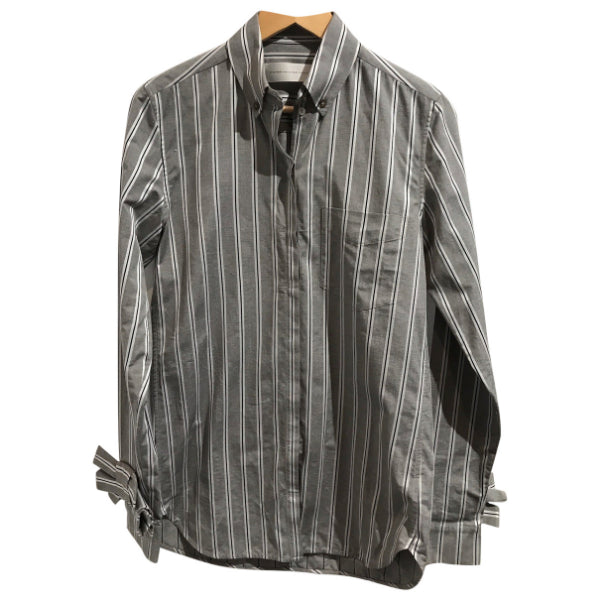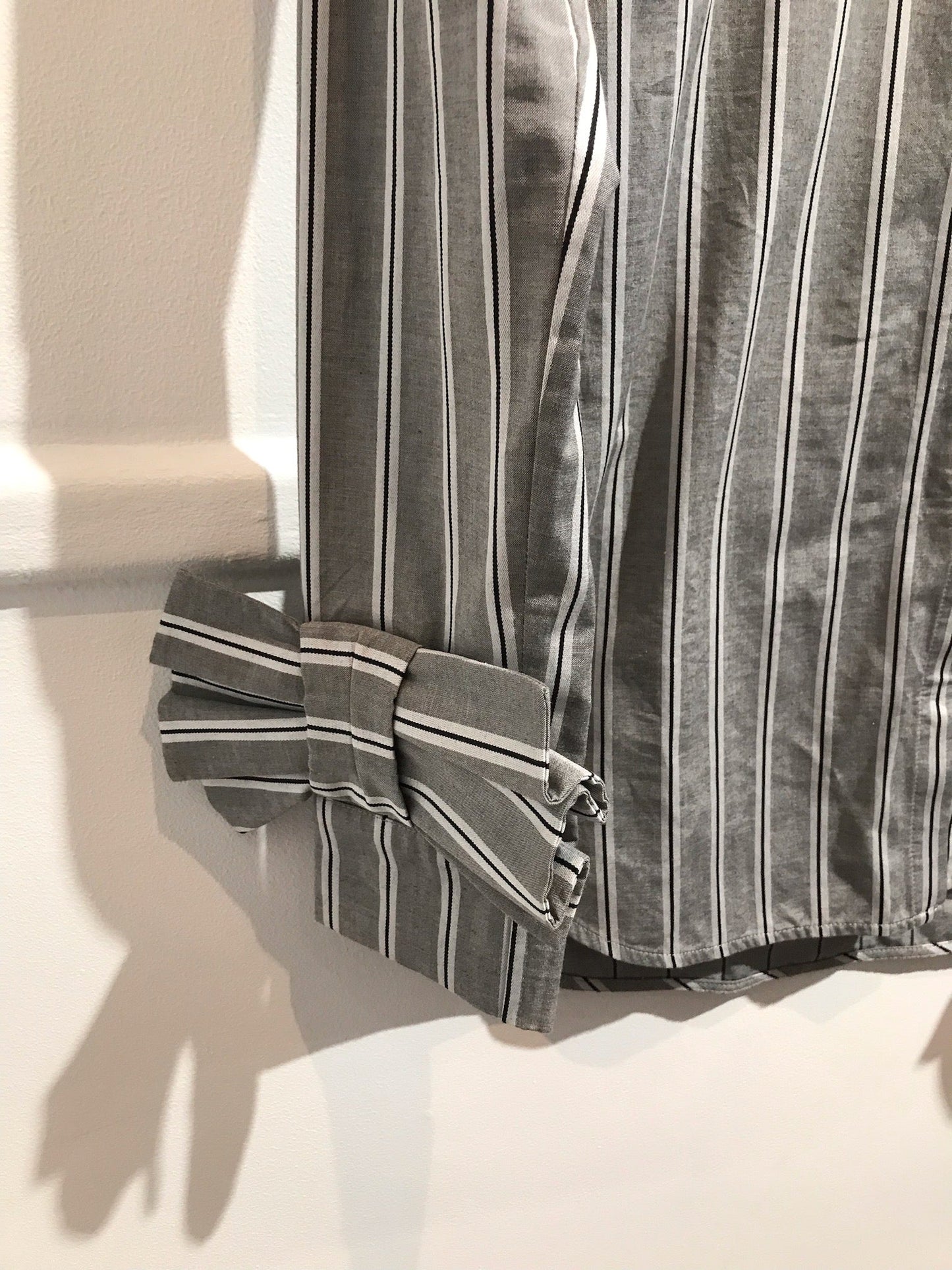 Chemise en coton gris à rayures blanches et noires. Fermeture boutonnée et poignets ornés de noeuds.