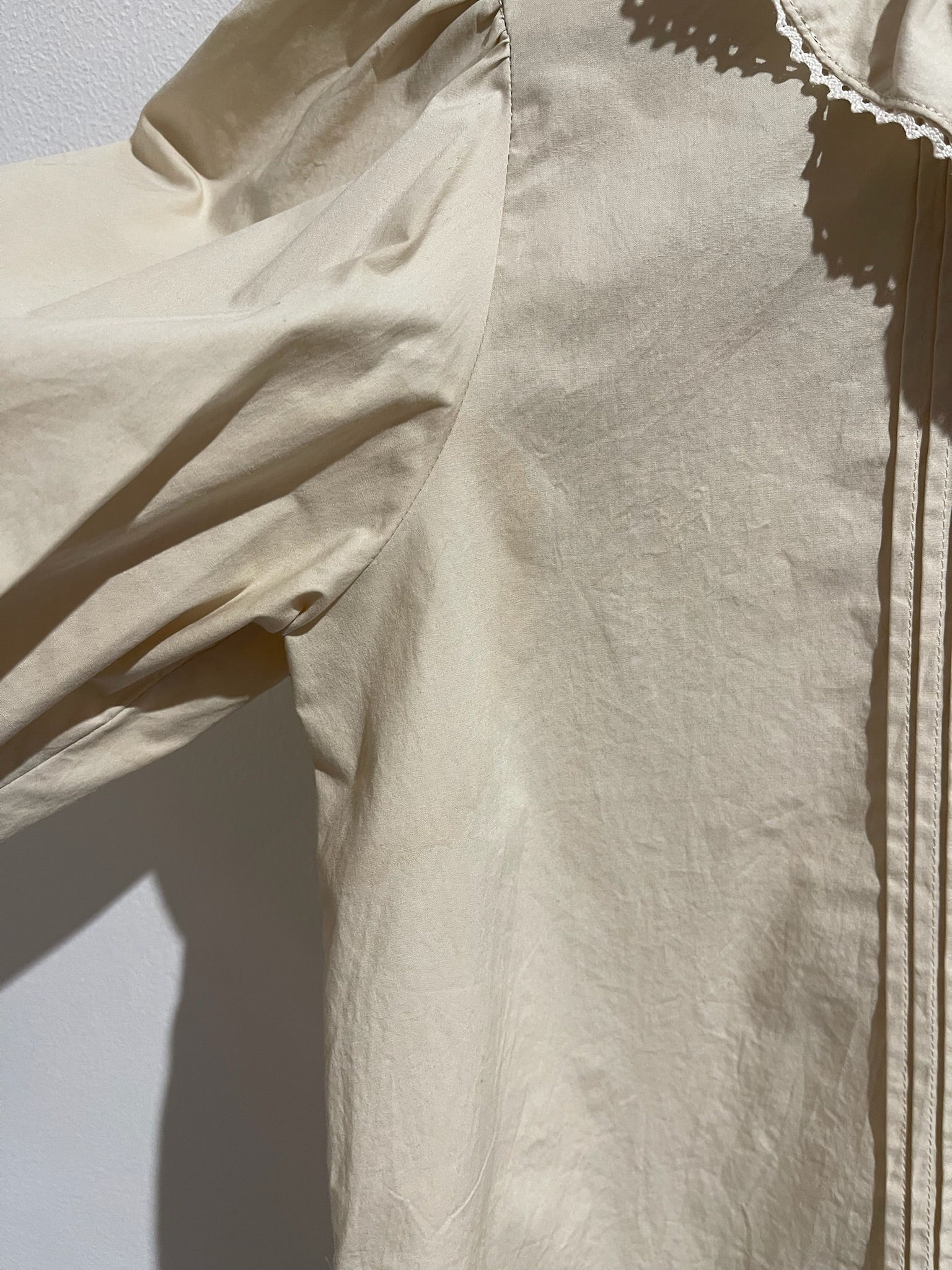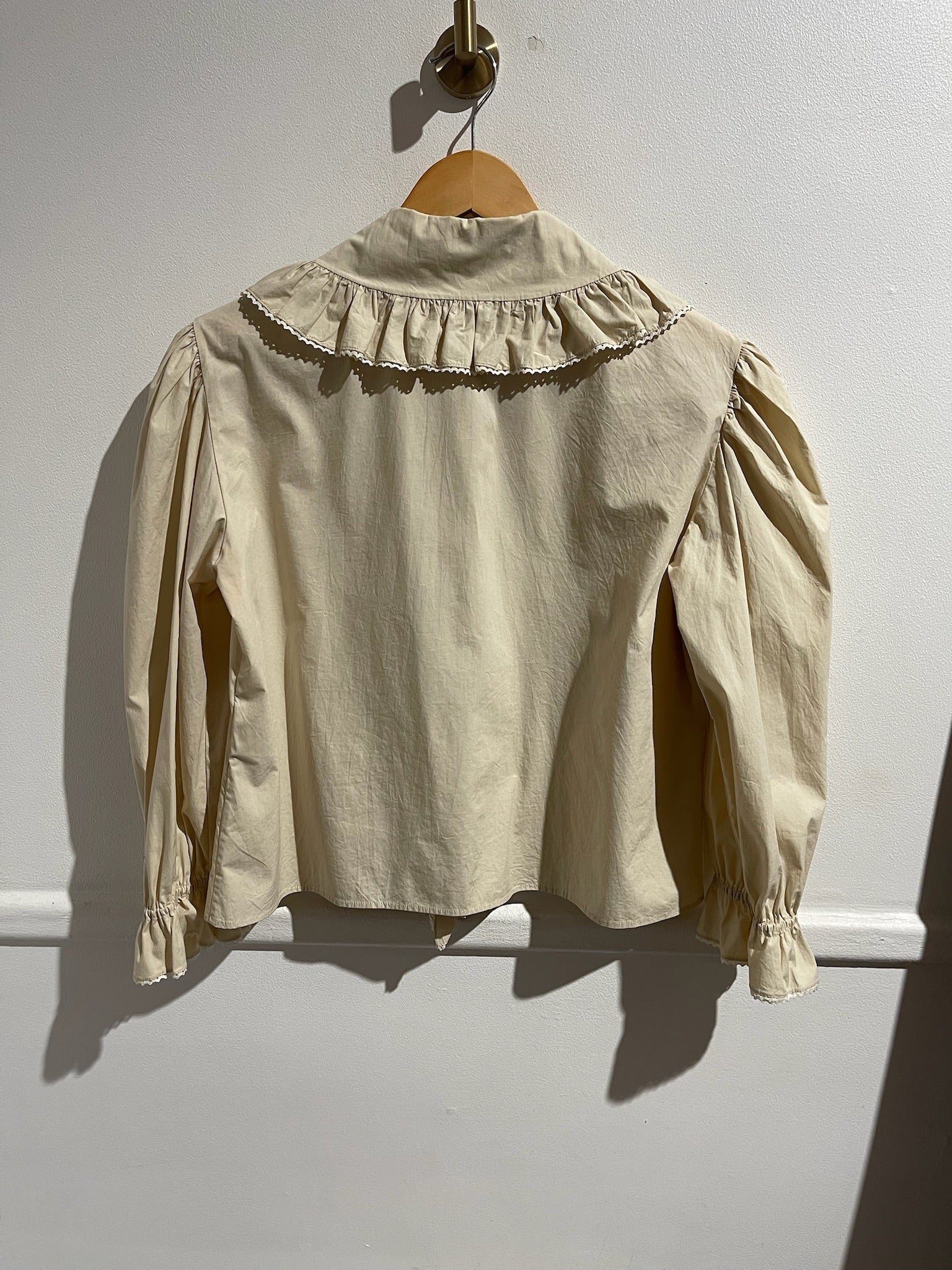 Chemisier en coton écru avec col Claudine à noeud noir, fermeture à boutons et détails volantés au col, à l'avant et aux poignets.
