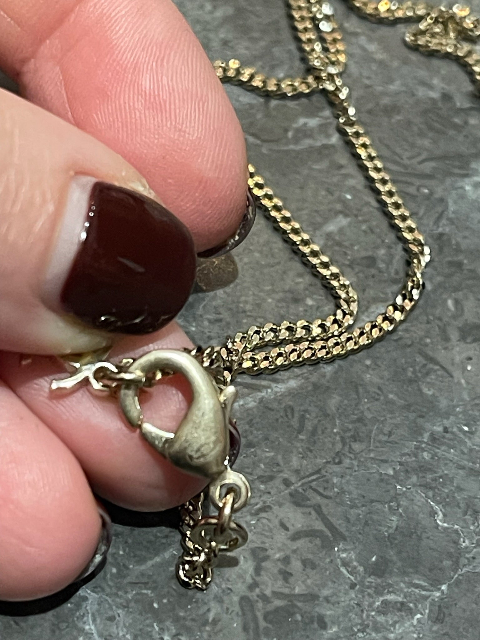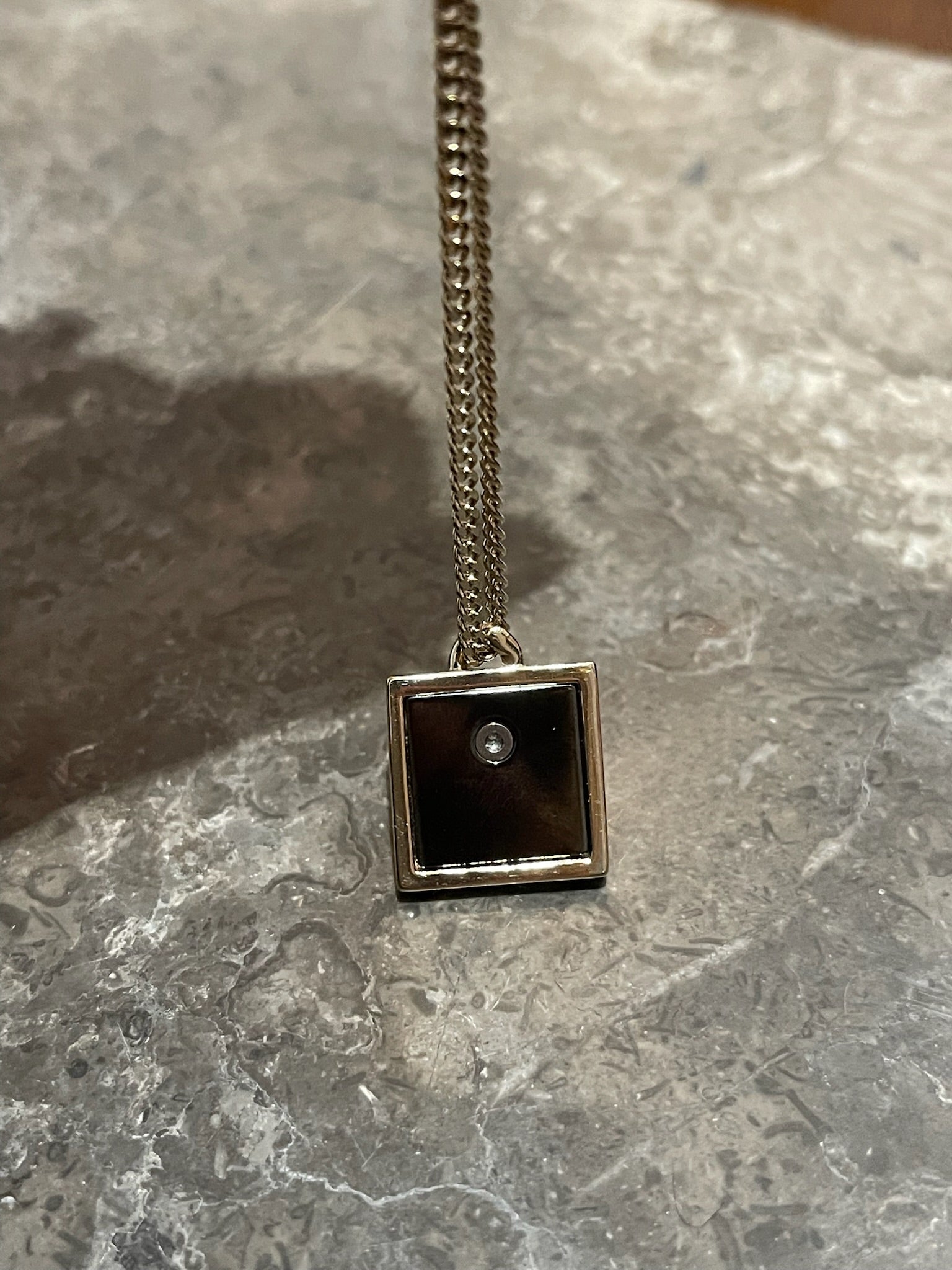 Collier chaine en métal doré avec médaillon carrée signé CC sur fond noir.