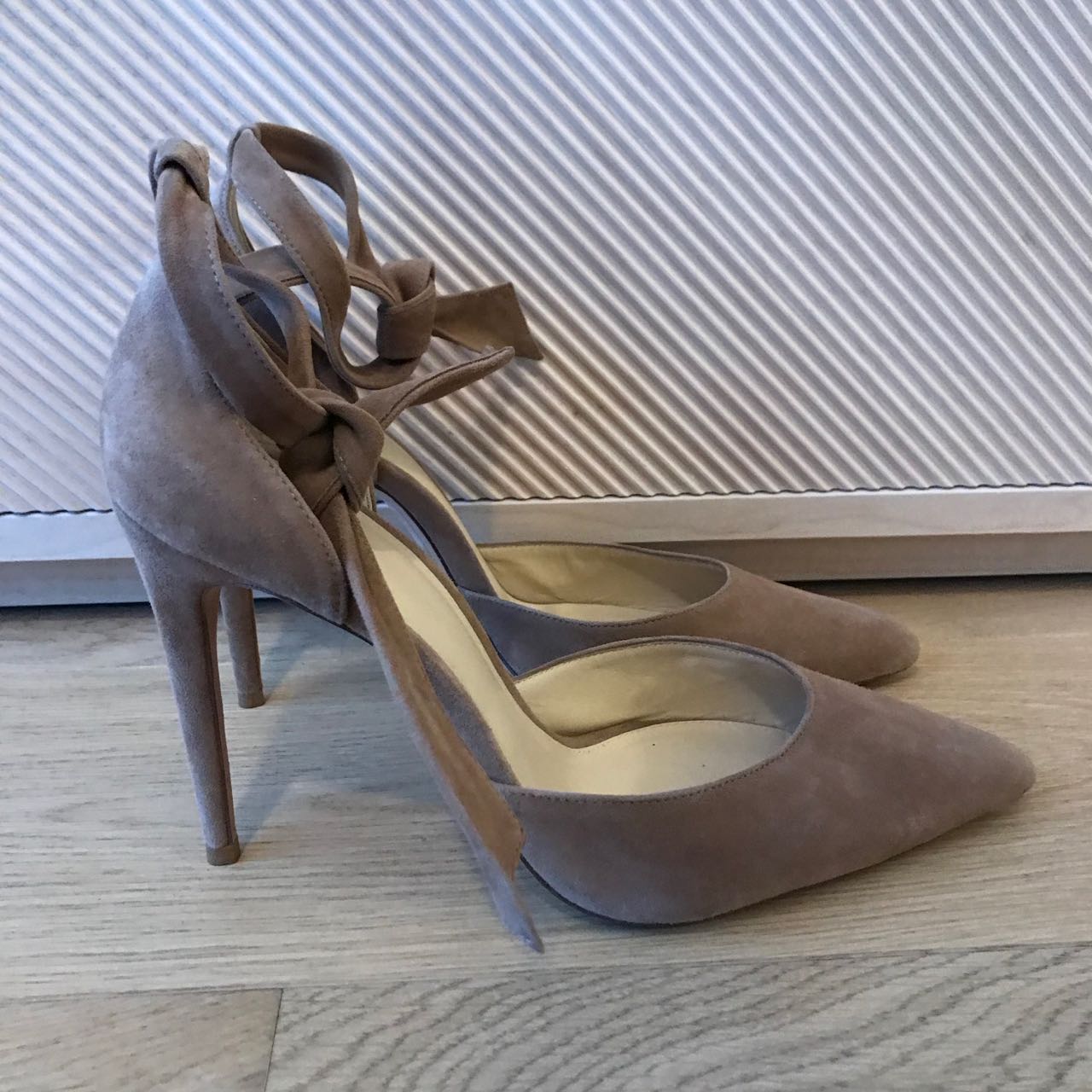 Escarpins en daim beige à bouts pointus, noeud à la cheville.