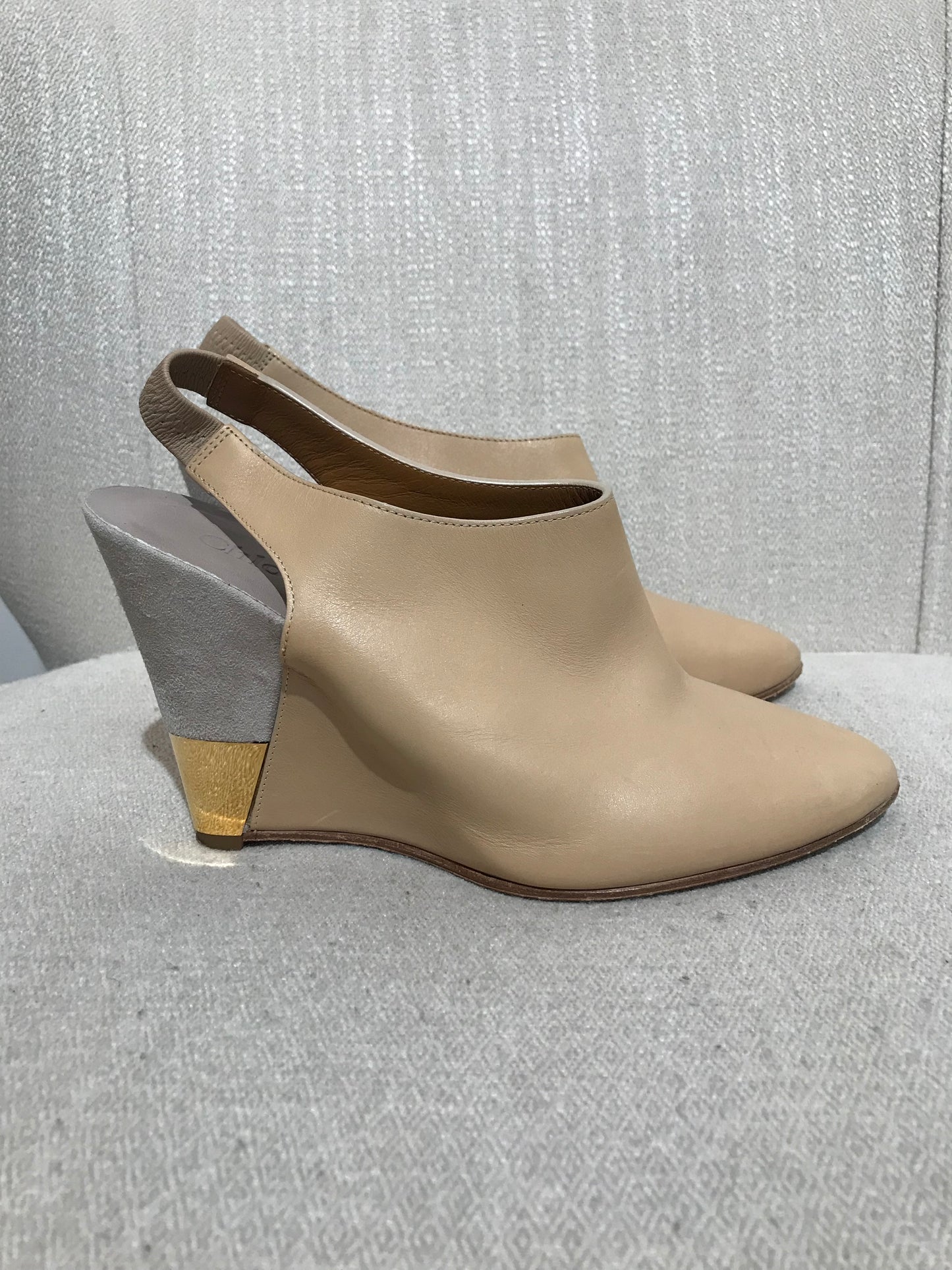 Escarpins en cuir beige avec ouverture à l'arrière style slingback. Talons compensés en daim gris et métal doré.