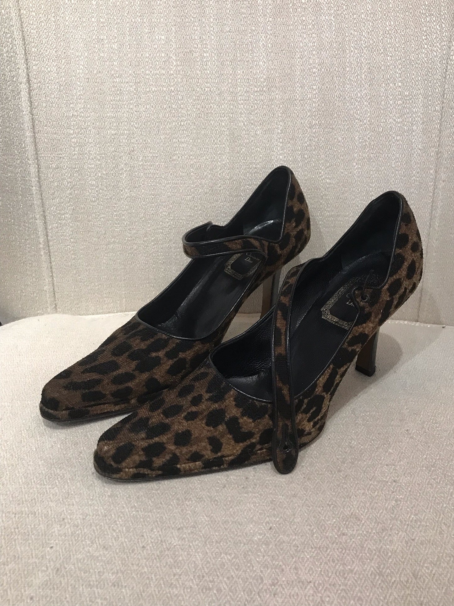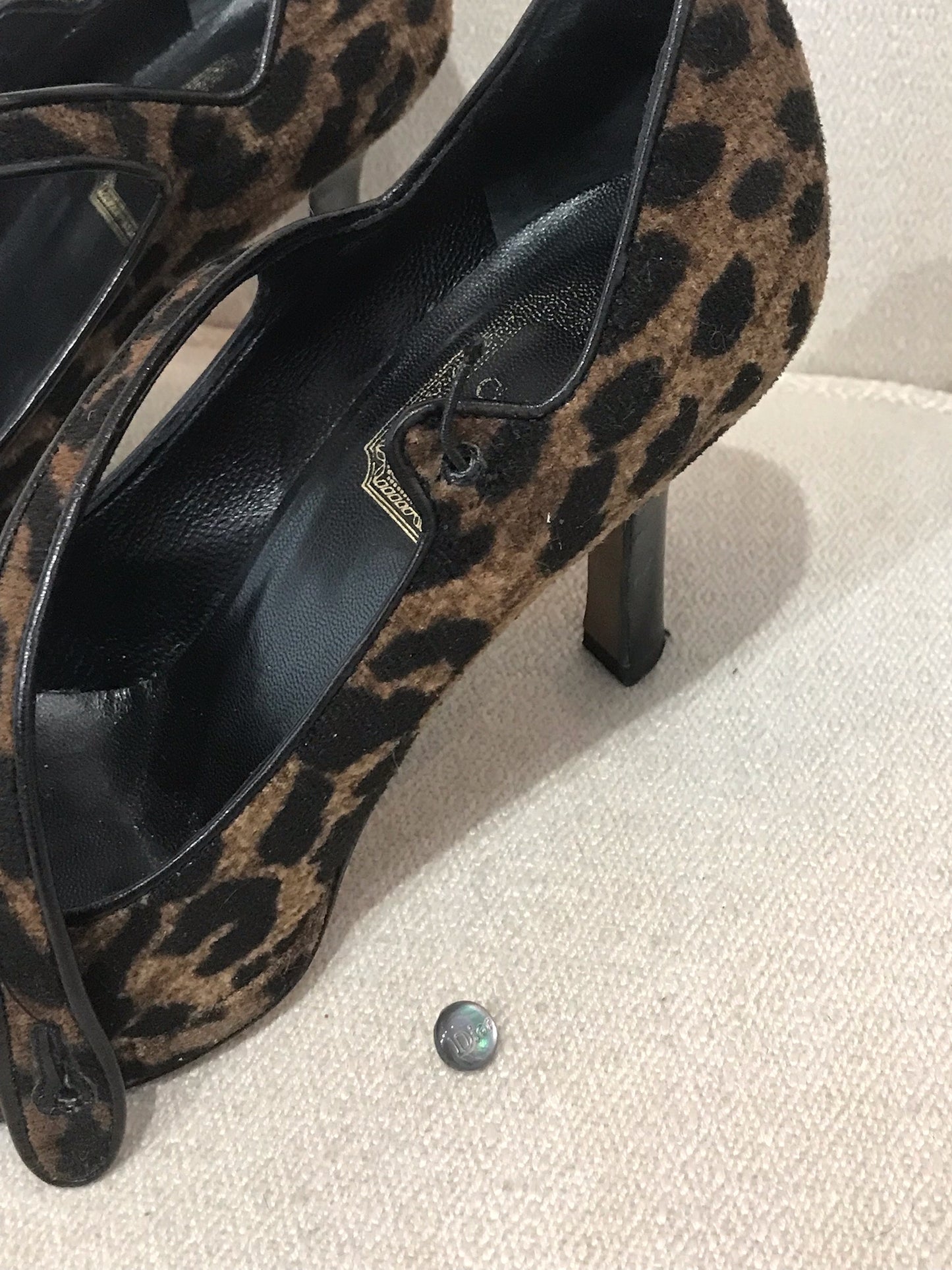 Escarpins en tissu imprimé léopard avec bride à la cheville. Petit bouton signé Dior.