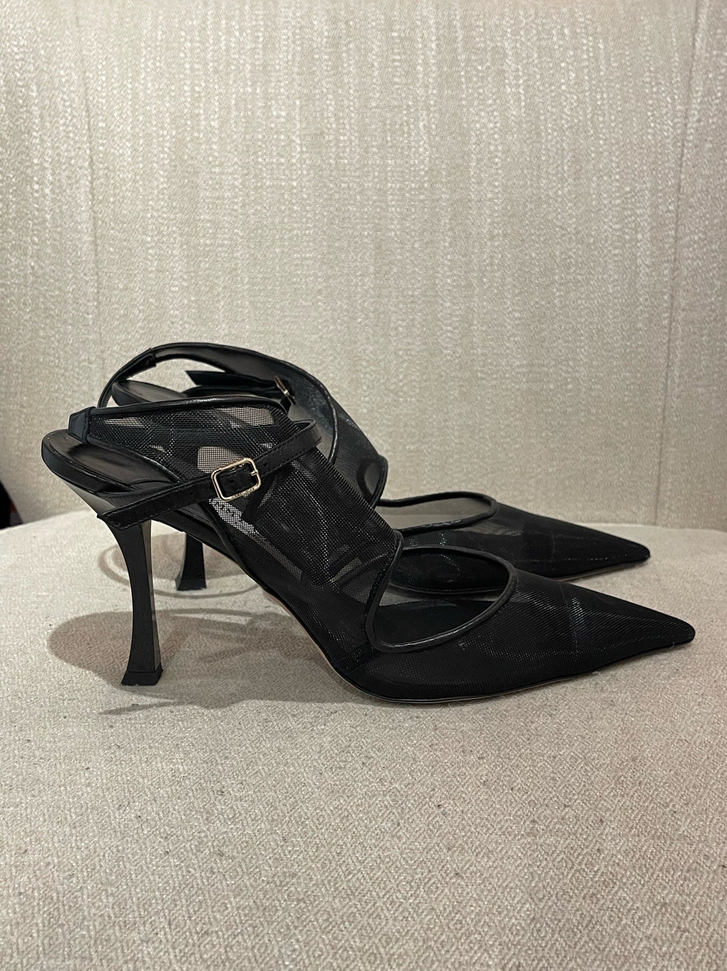 Escarpins en résille noir avec liseré en cuir et bouts pointus. Bride à la cheville ajustable. Talon noir vernis.