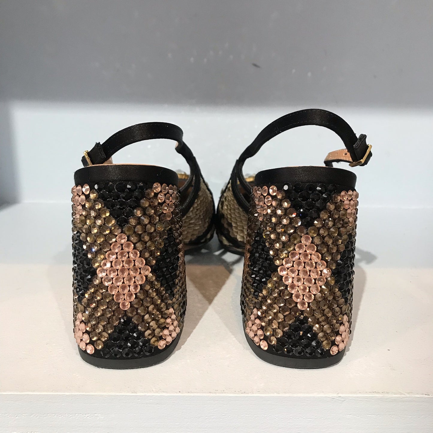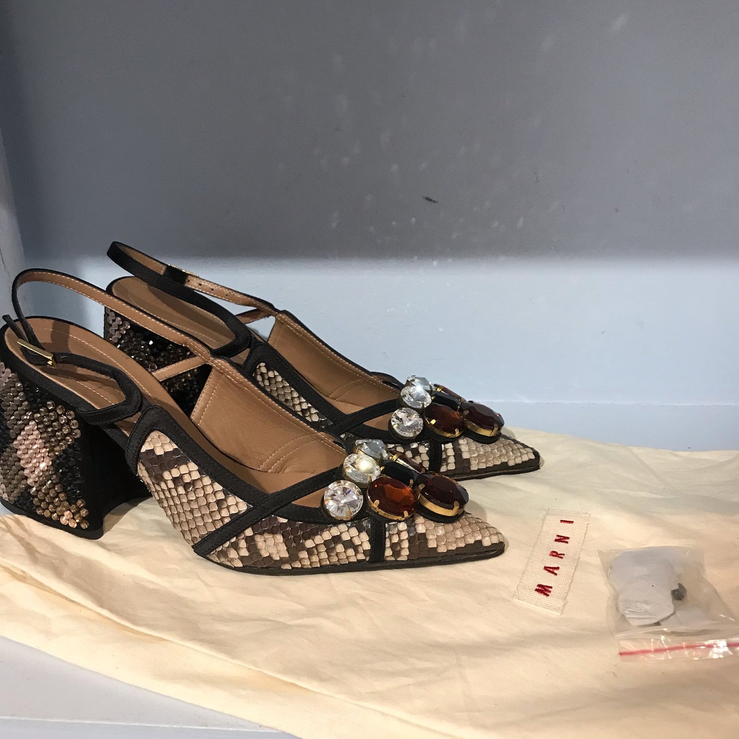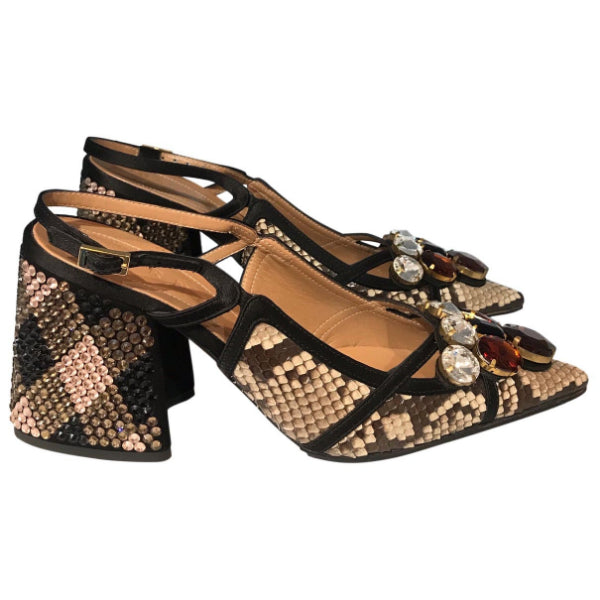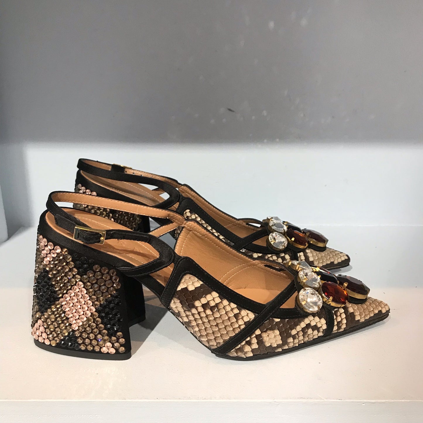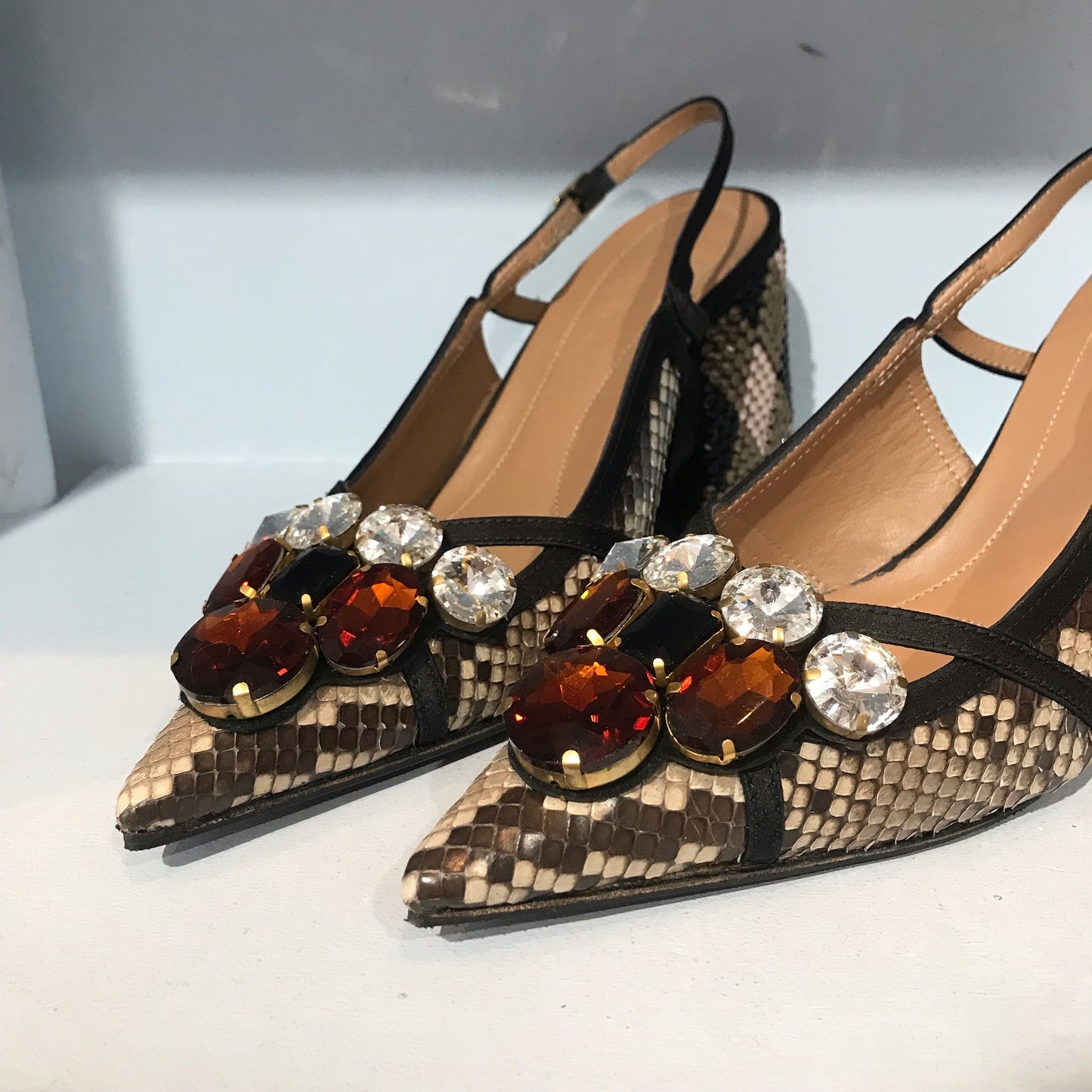 Escarpins Marni en python avec bouts pointus décorés de strass. Talons blocs à strass.