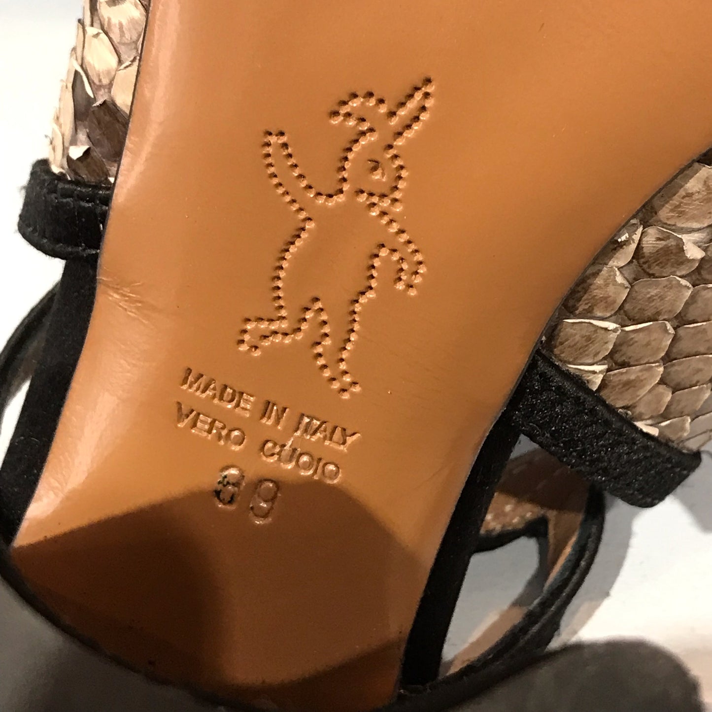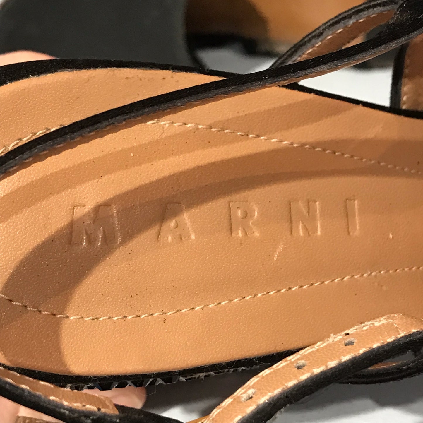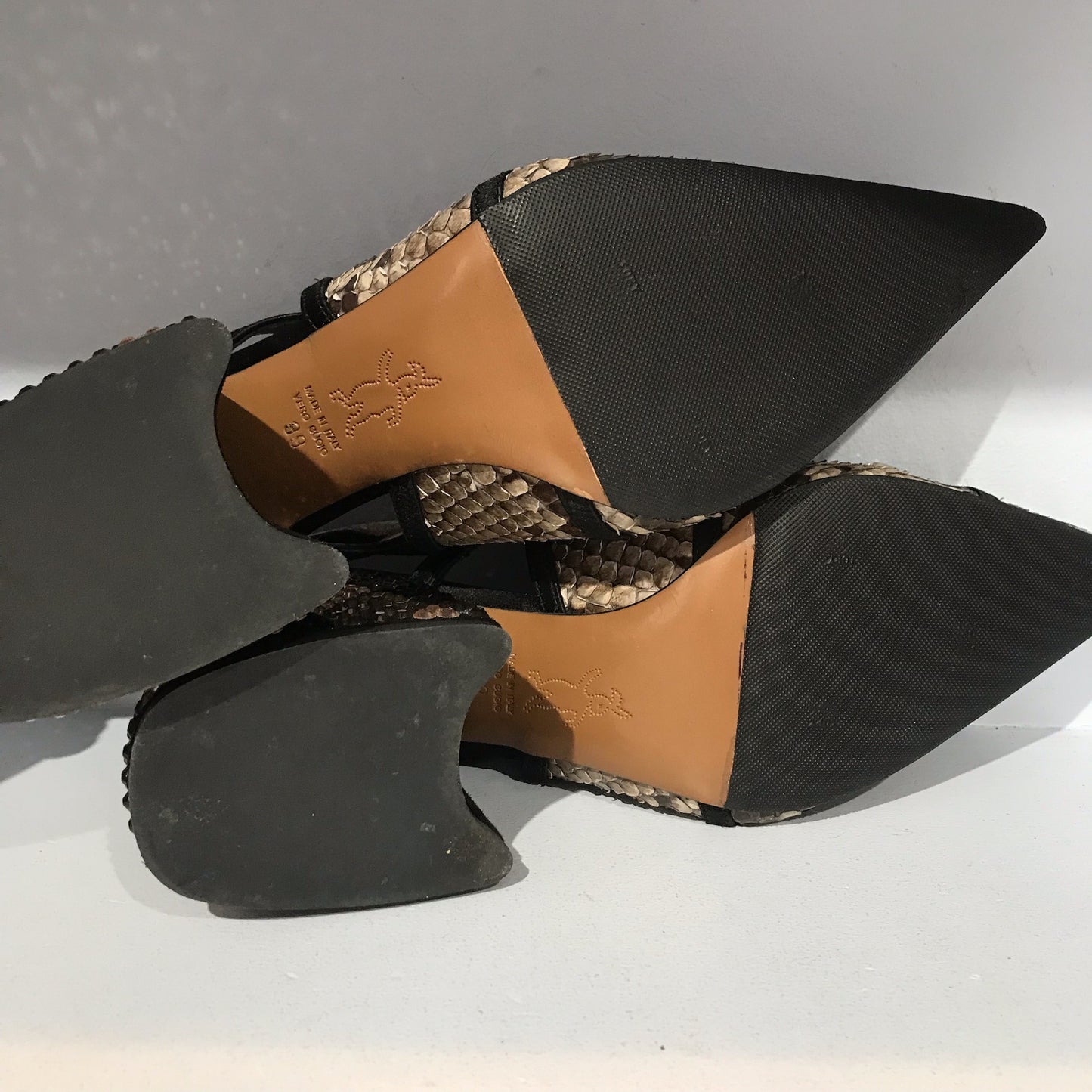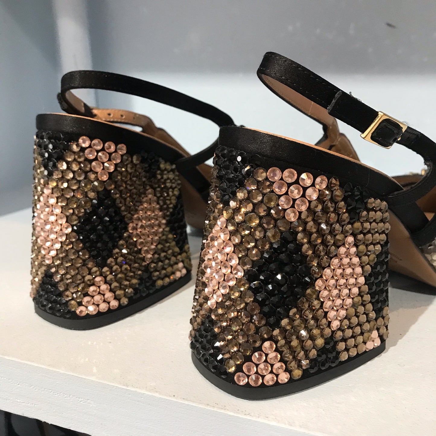 Escarpins Marni en python avec bouts pointus décorés de strass. Talons blocs à strass.