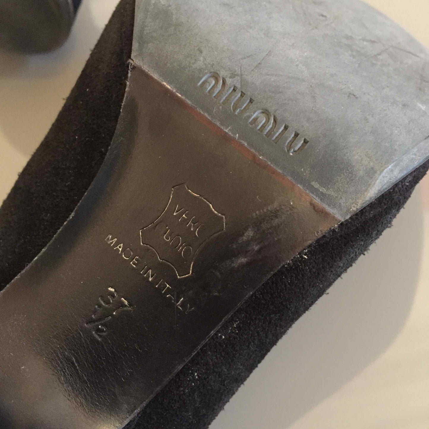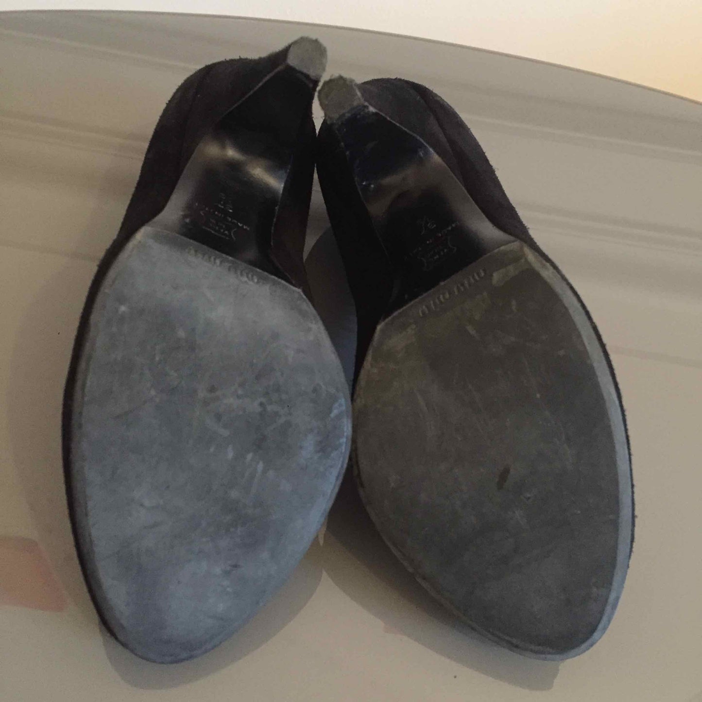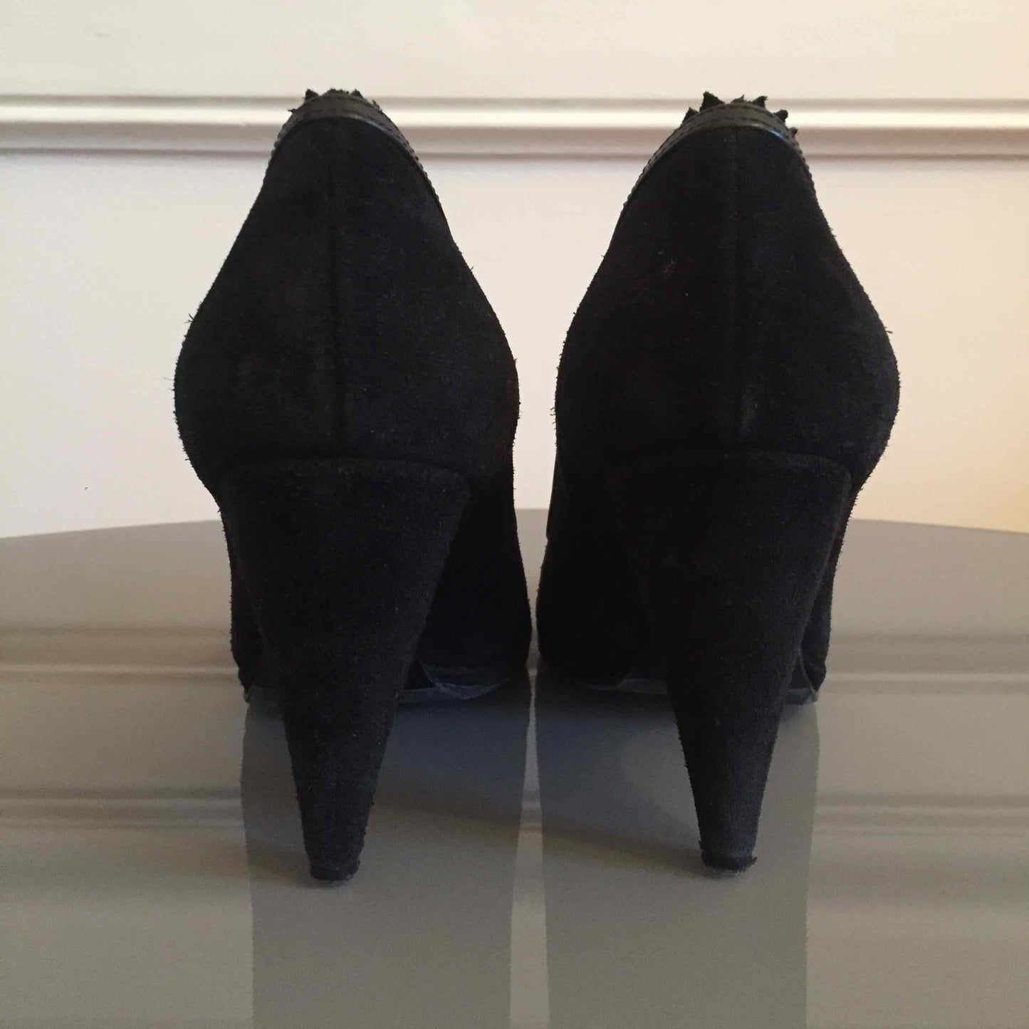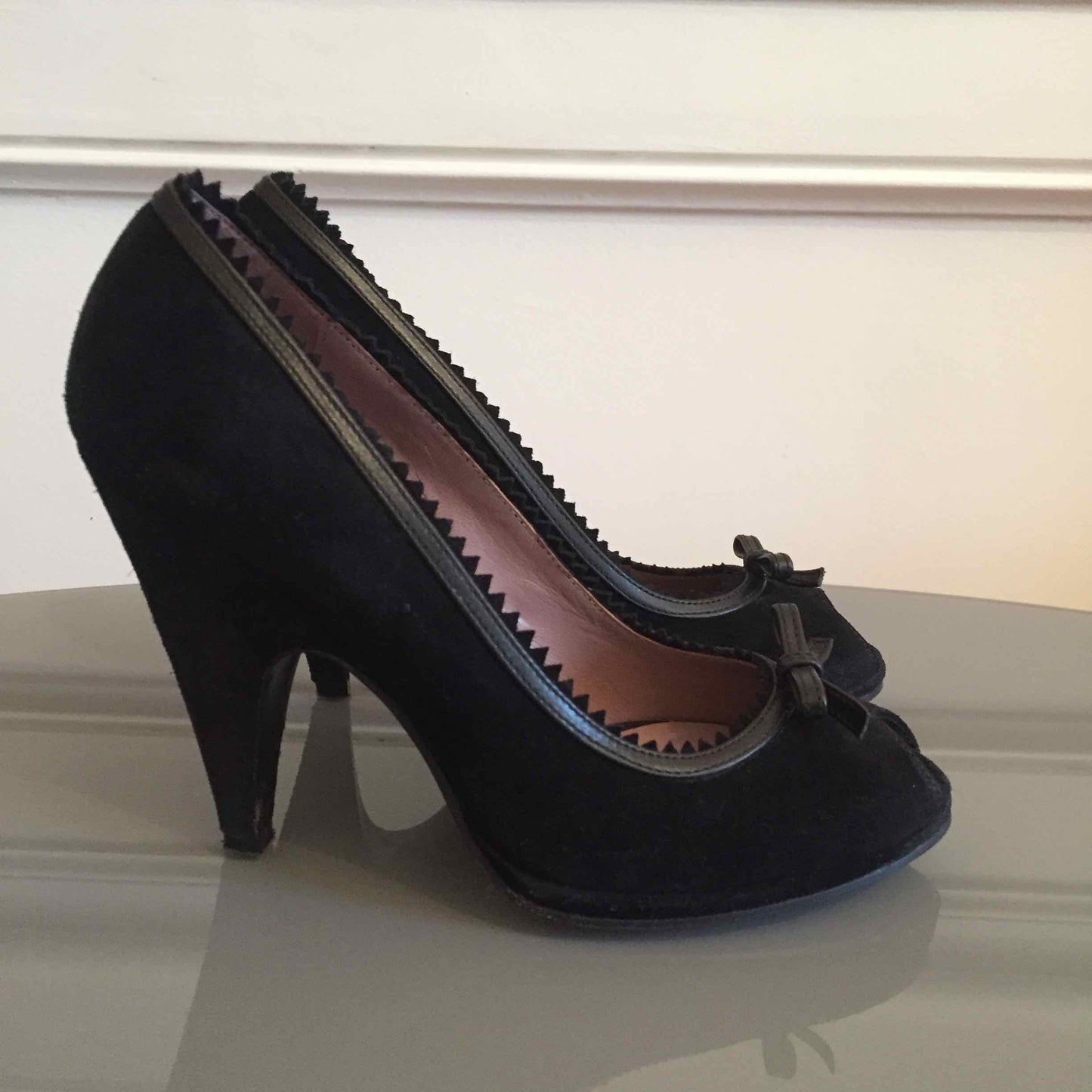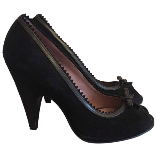 Escarpins en daim noir, bouts ouverts et petits noeuds.