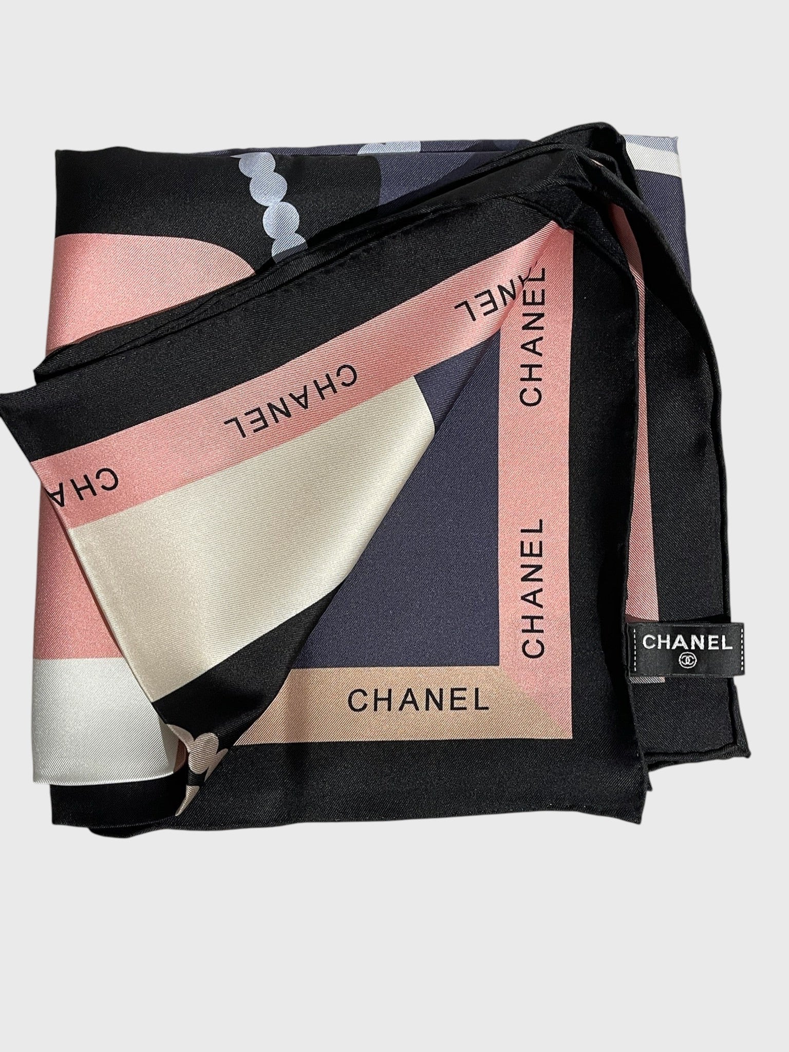 Carré 100 % soie banc et rose avec imprimé shopping bag et sac Chanel noir, bleu et rose. Contour avec inscription Chanel.
