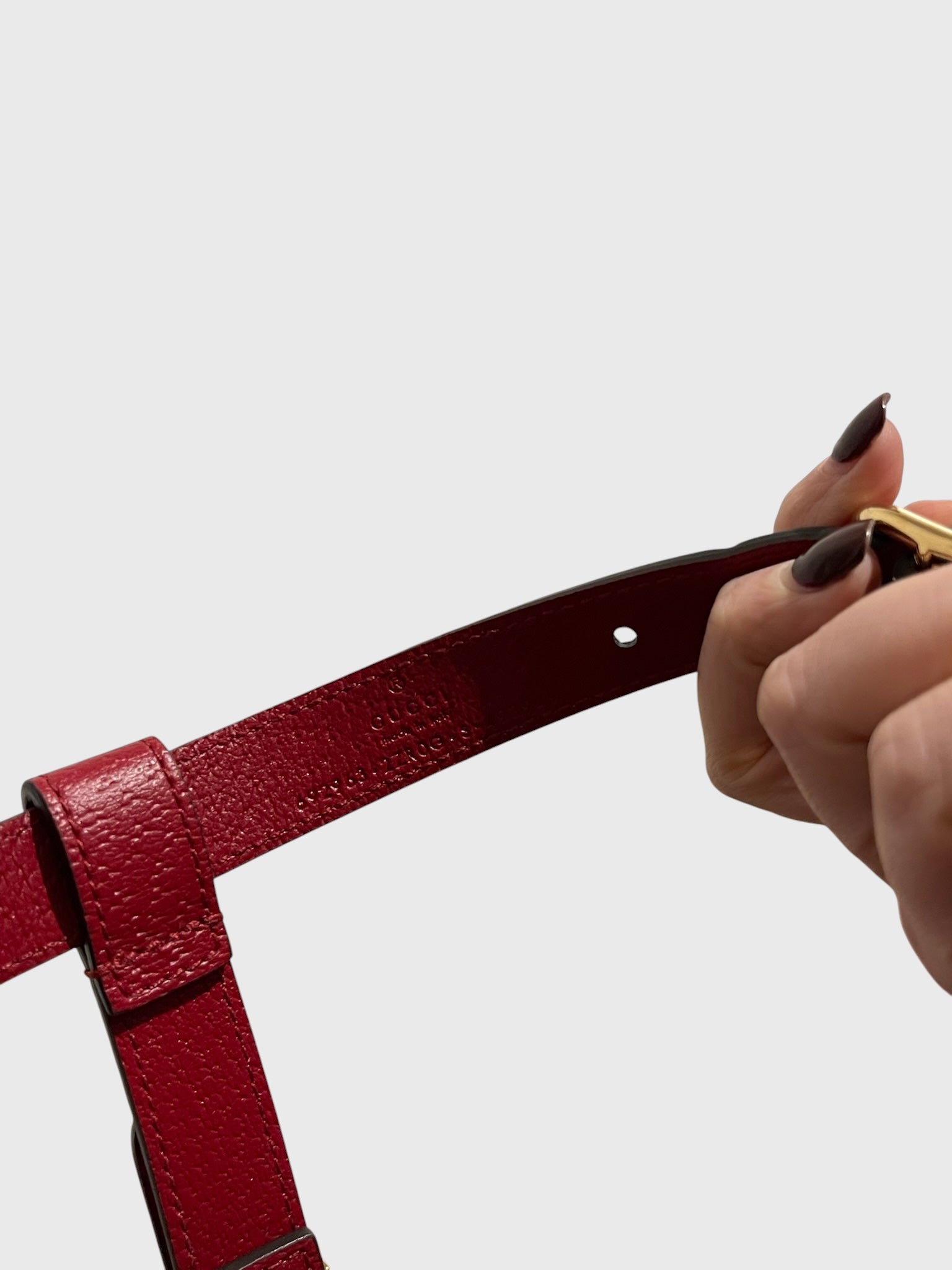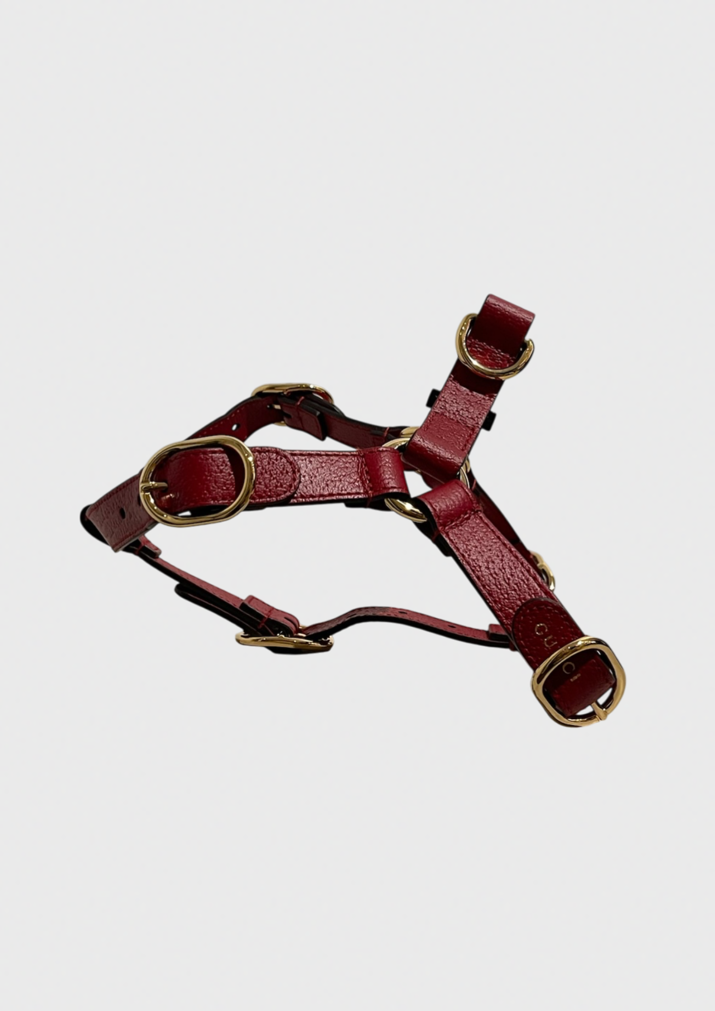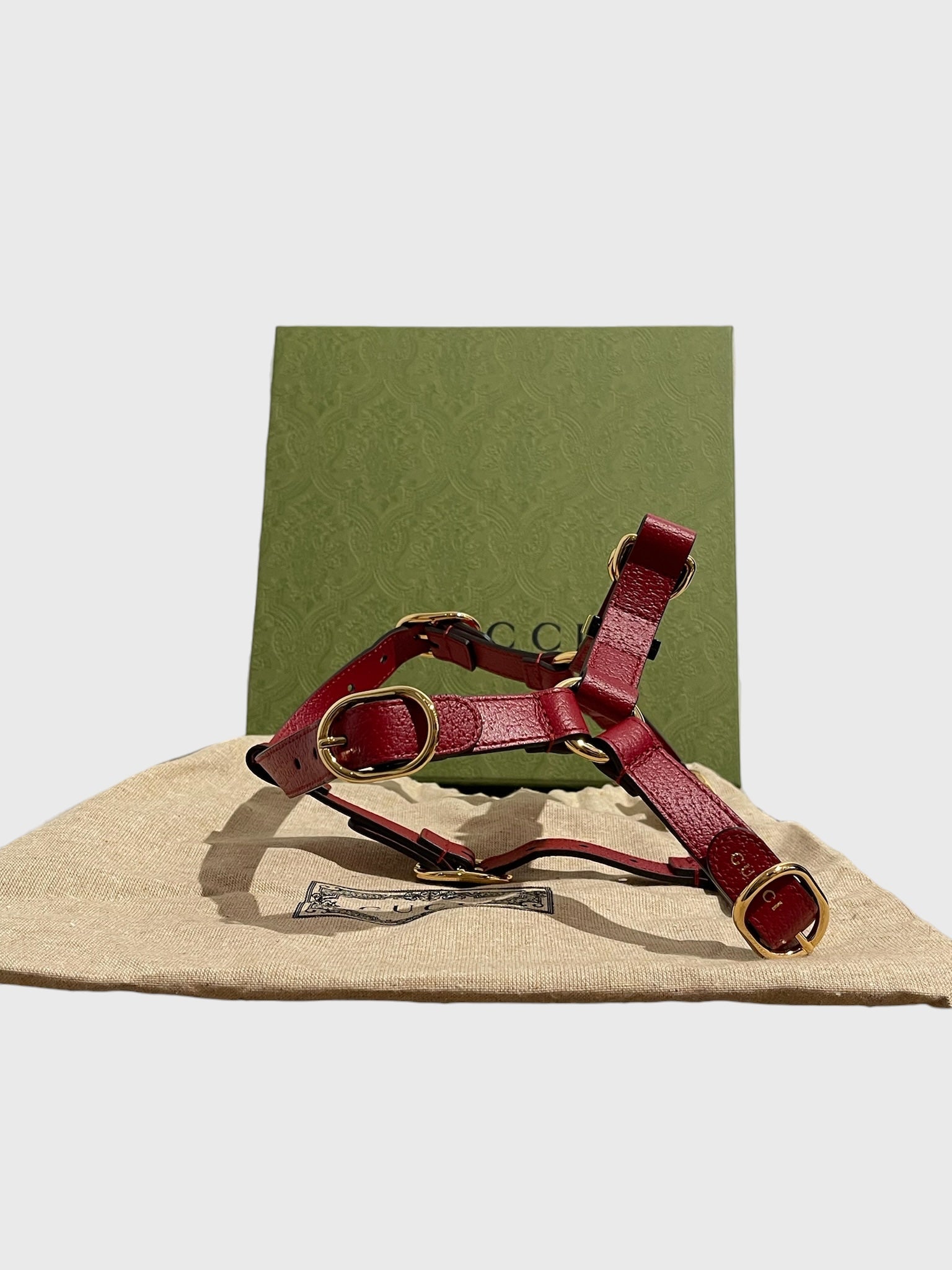 Harnais pour animal de compagnie signé Gucci, confectionné en cuir rouge. Design avec plusieurs boucles réglables dorées. Détail de la signature Gucci gravé sur les boucles.