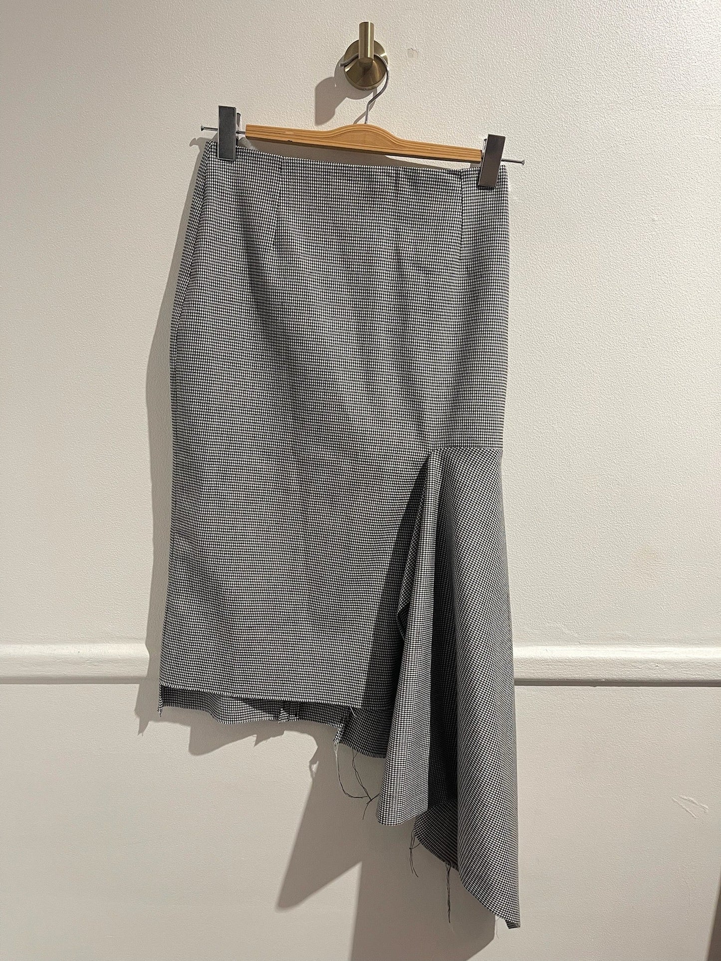 Jupe en laine à motif pied de poule noir et blanc. Coupe asymétrique. Fermeture zippée. Bords effet éffilé.