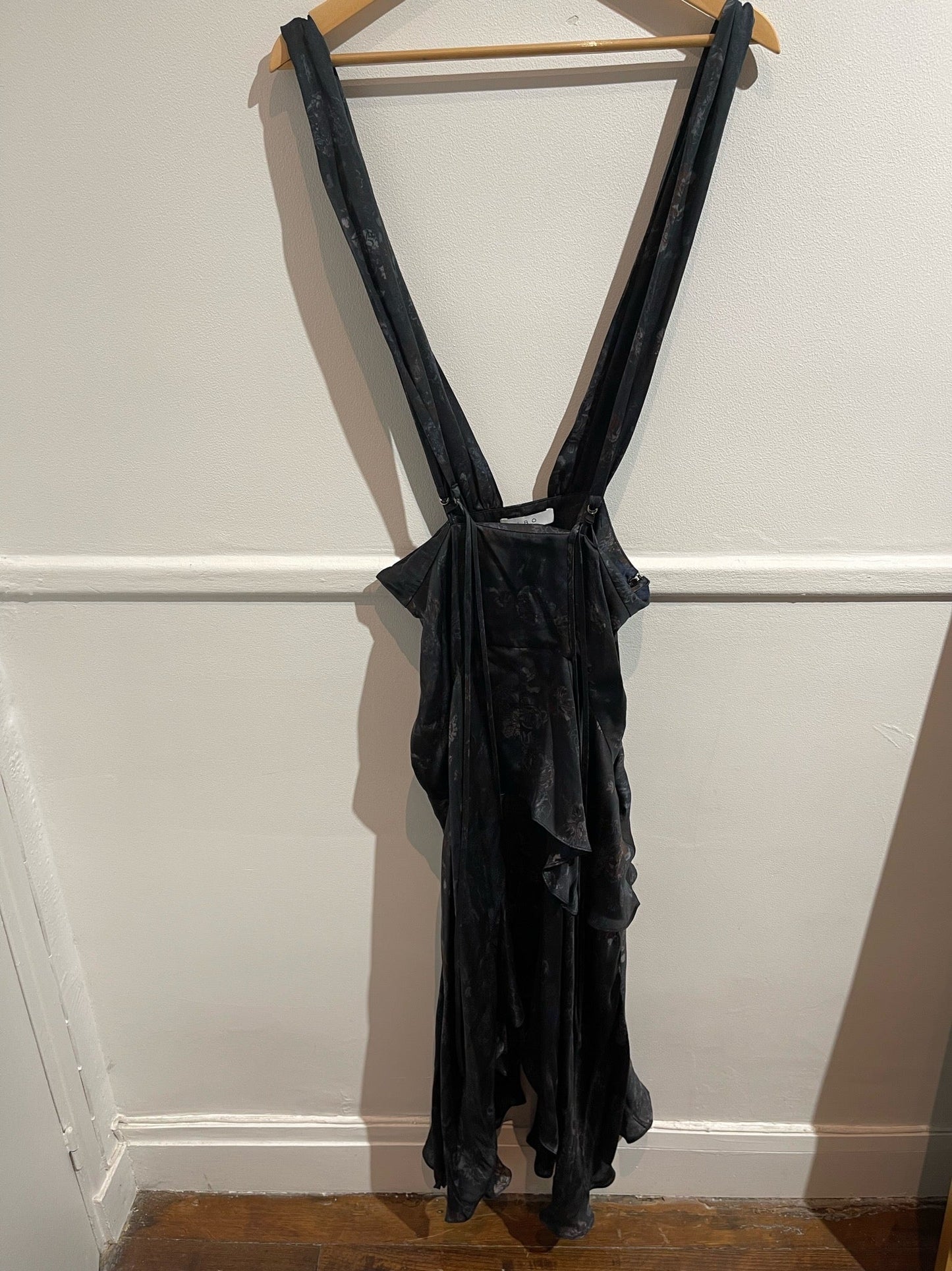 Jupe longue en soie anthracite à motif fleuri avec bretelles ajustables. Jupe asymétrique sur le bas. Fermeture zippée sur le côté. Coupe fluide.