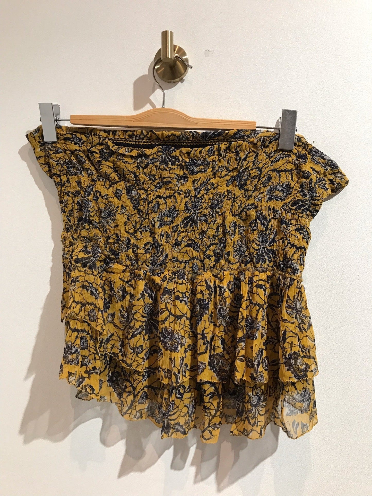 Jupe courte en soie imprimée jaune et bleu. Fronces au niveau de la taille et bas volanté.