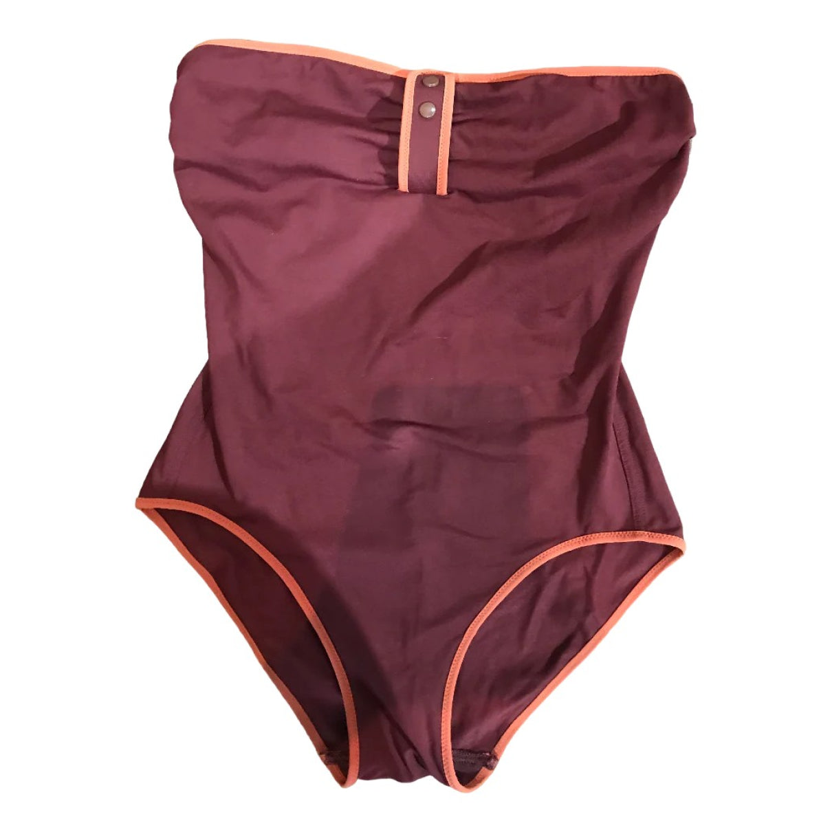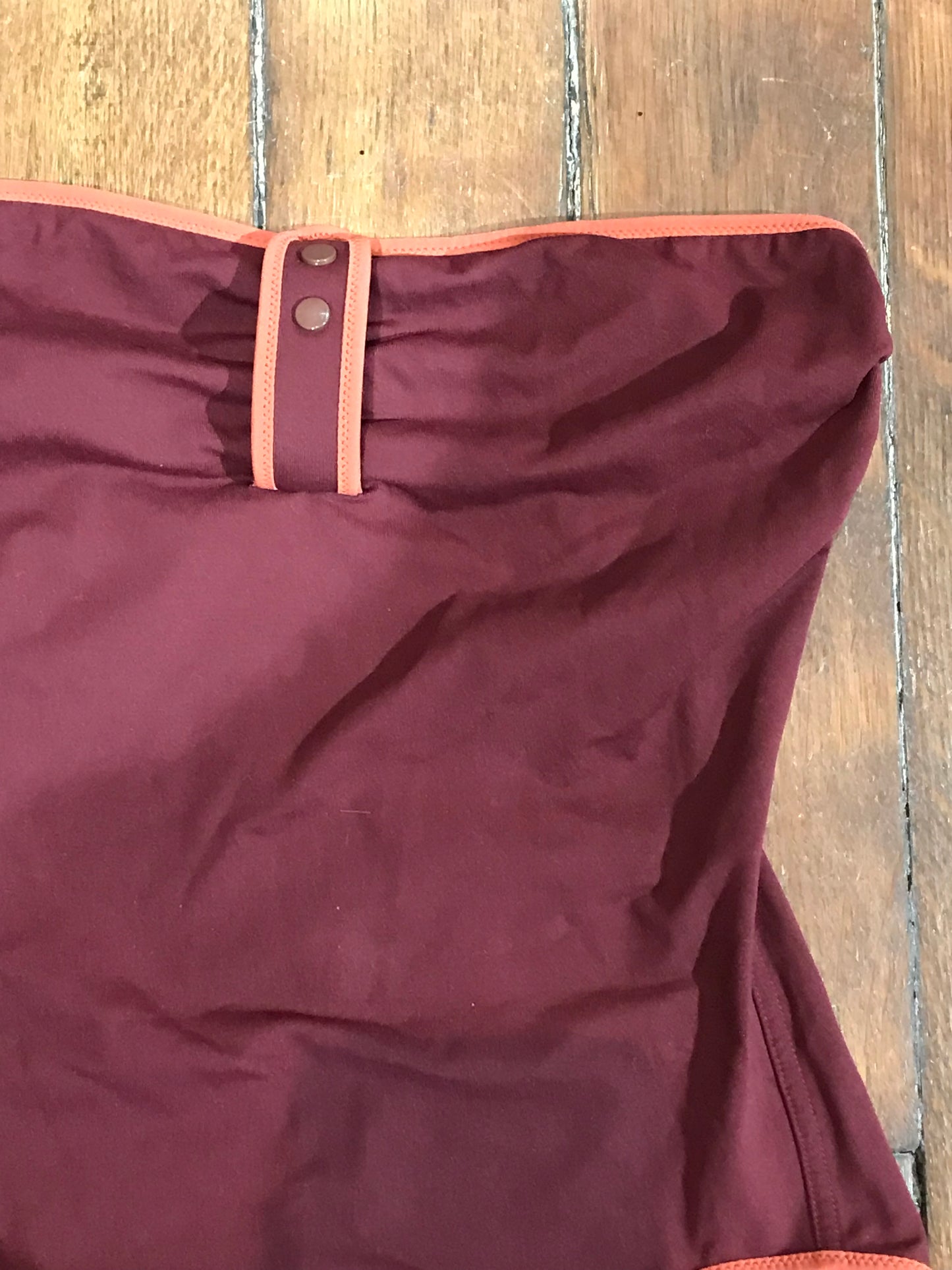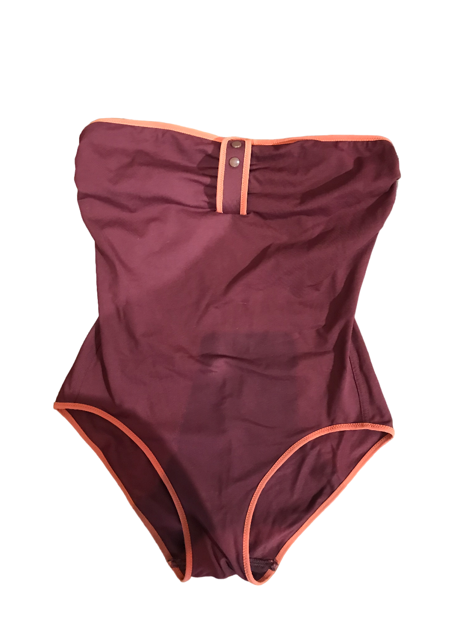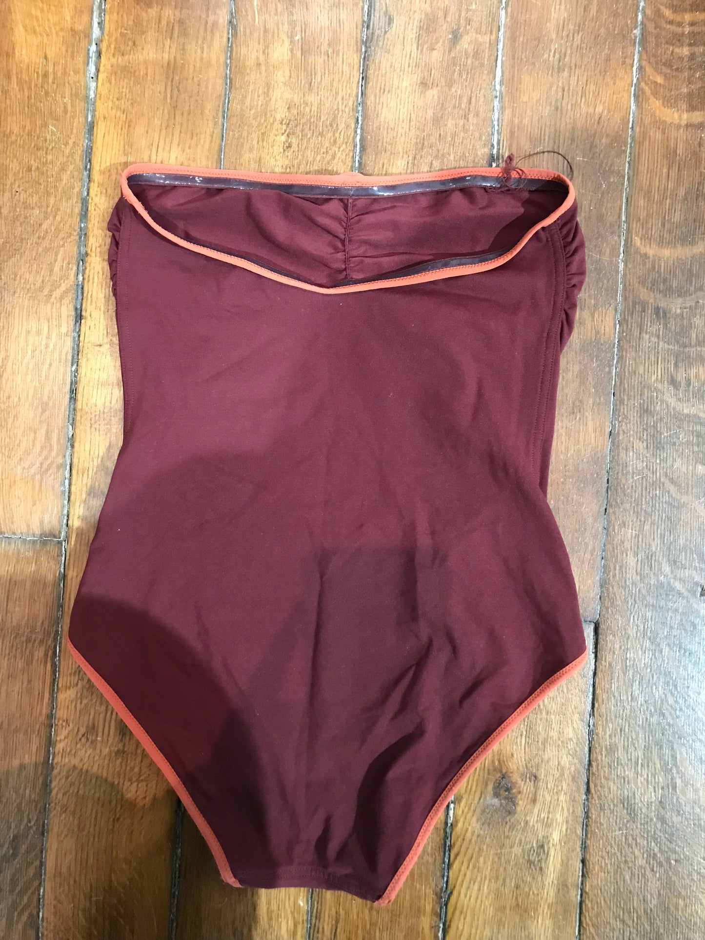 En polyamide bordeaux, coupe bustier et culotte bikini.