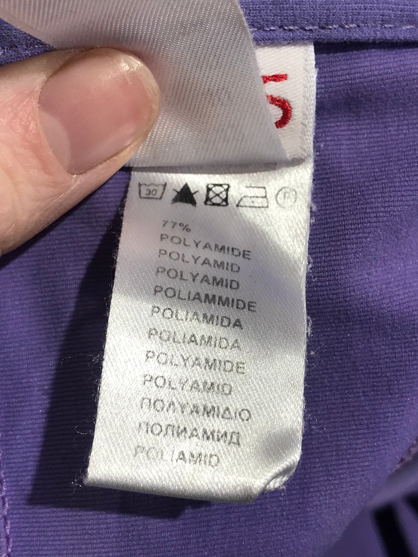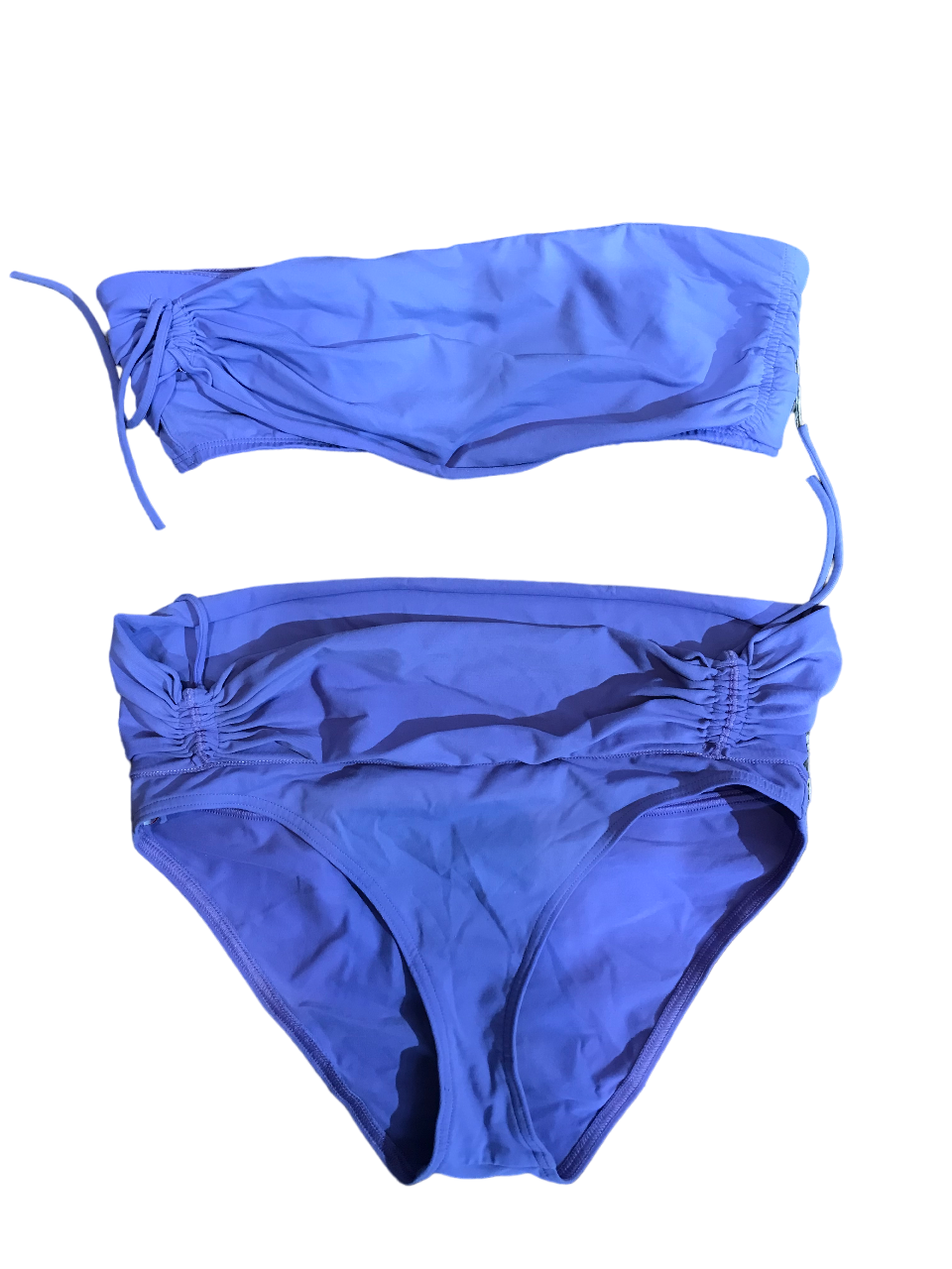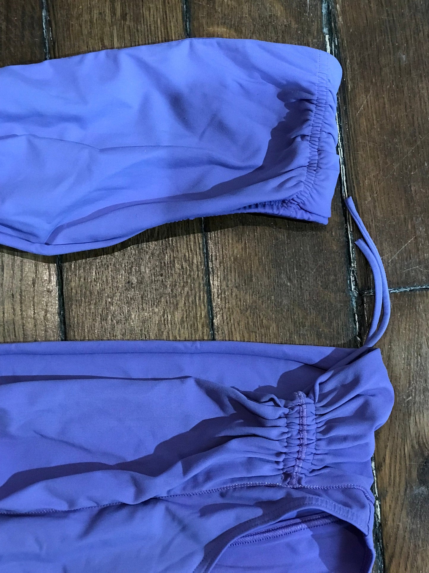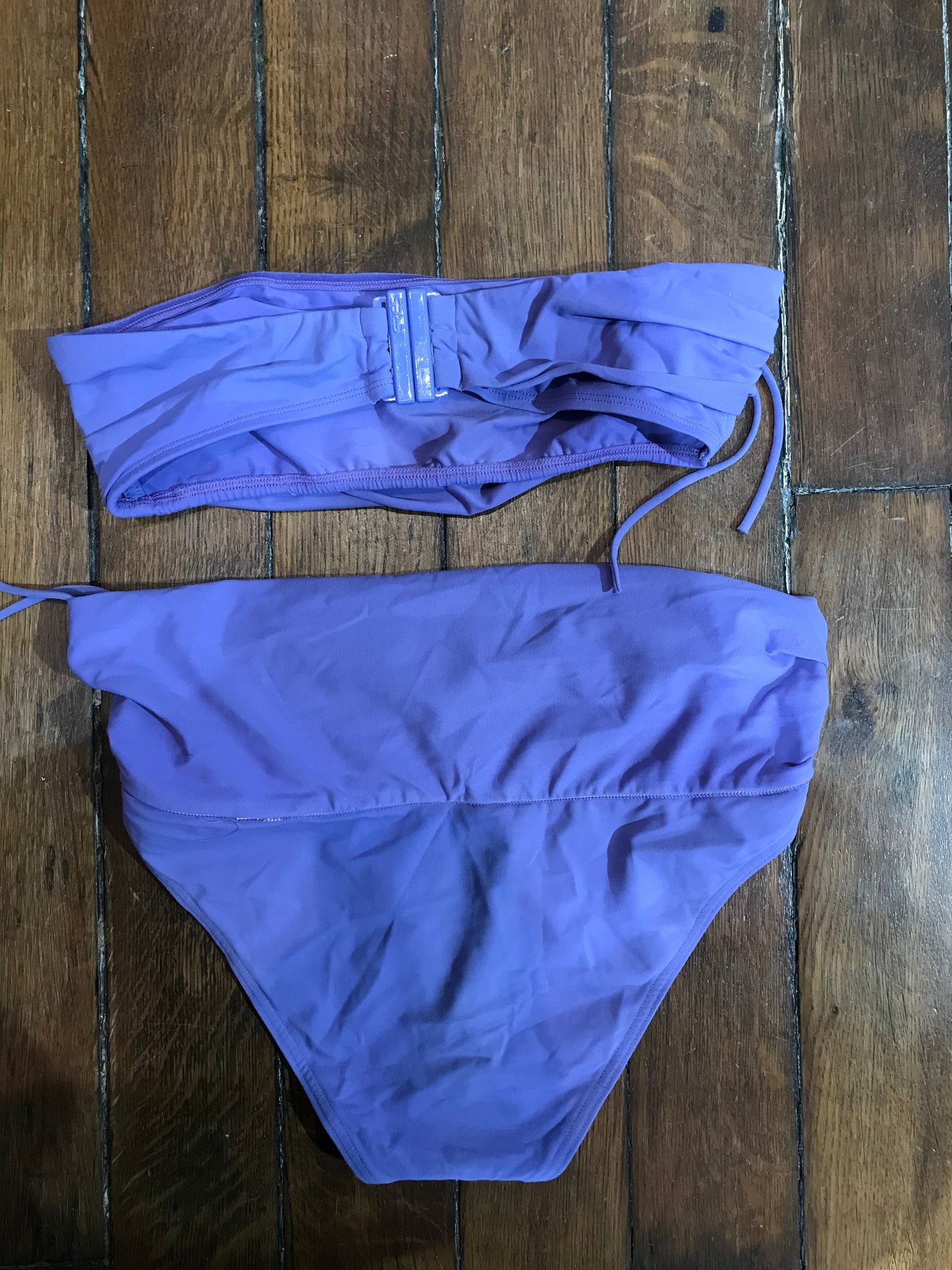 En polyamide violet, soutien gorge bandeau et culotte bikini. Détails de liens ajustables sur les côtés.
