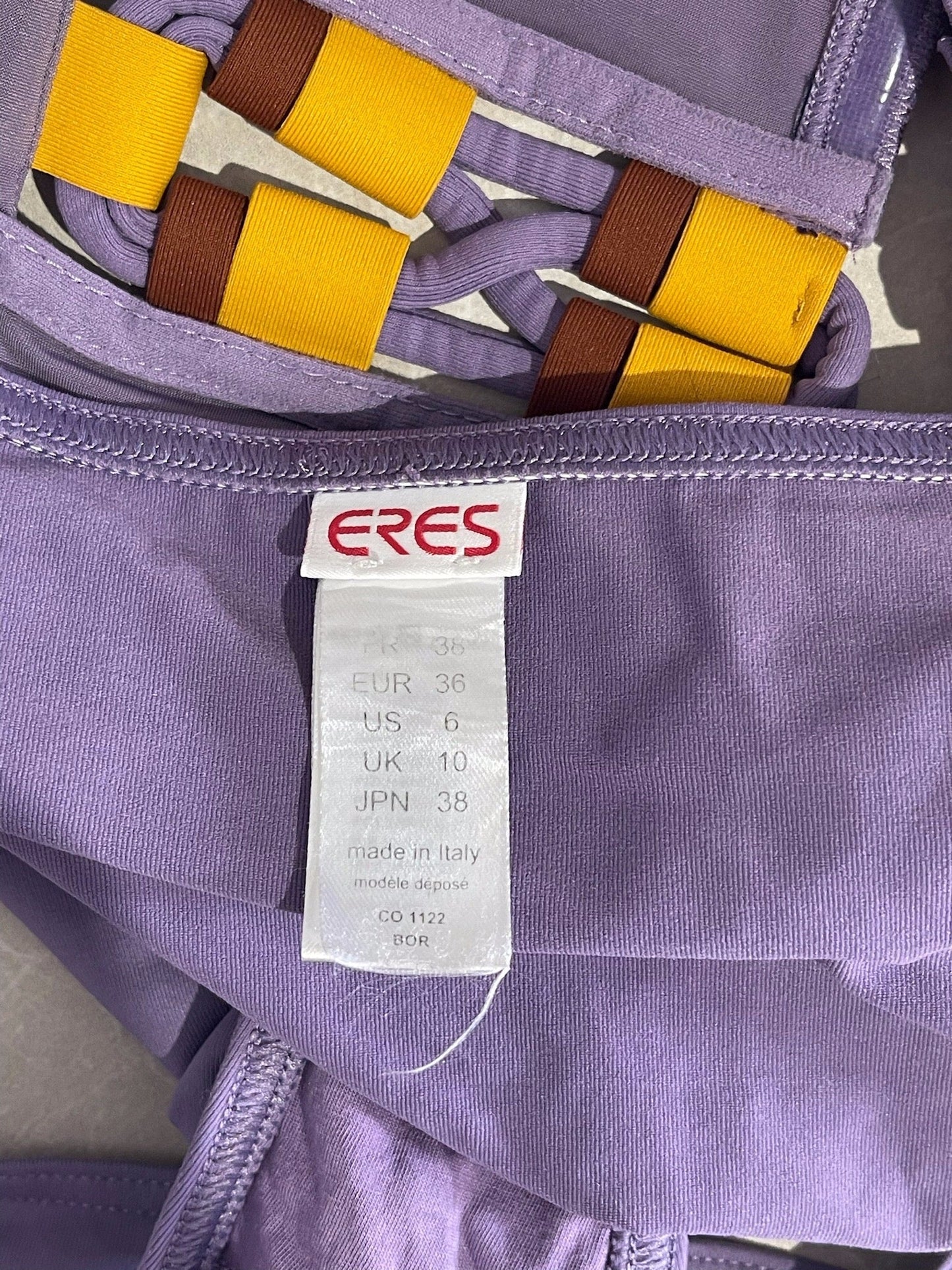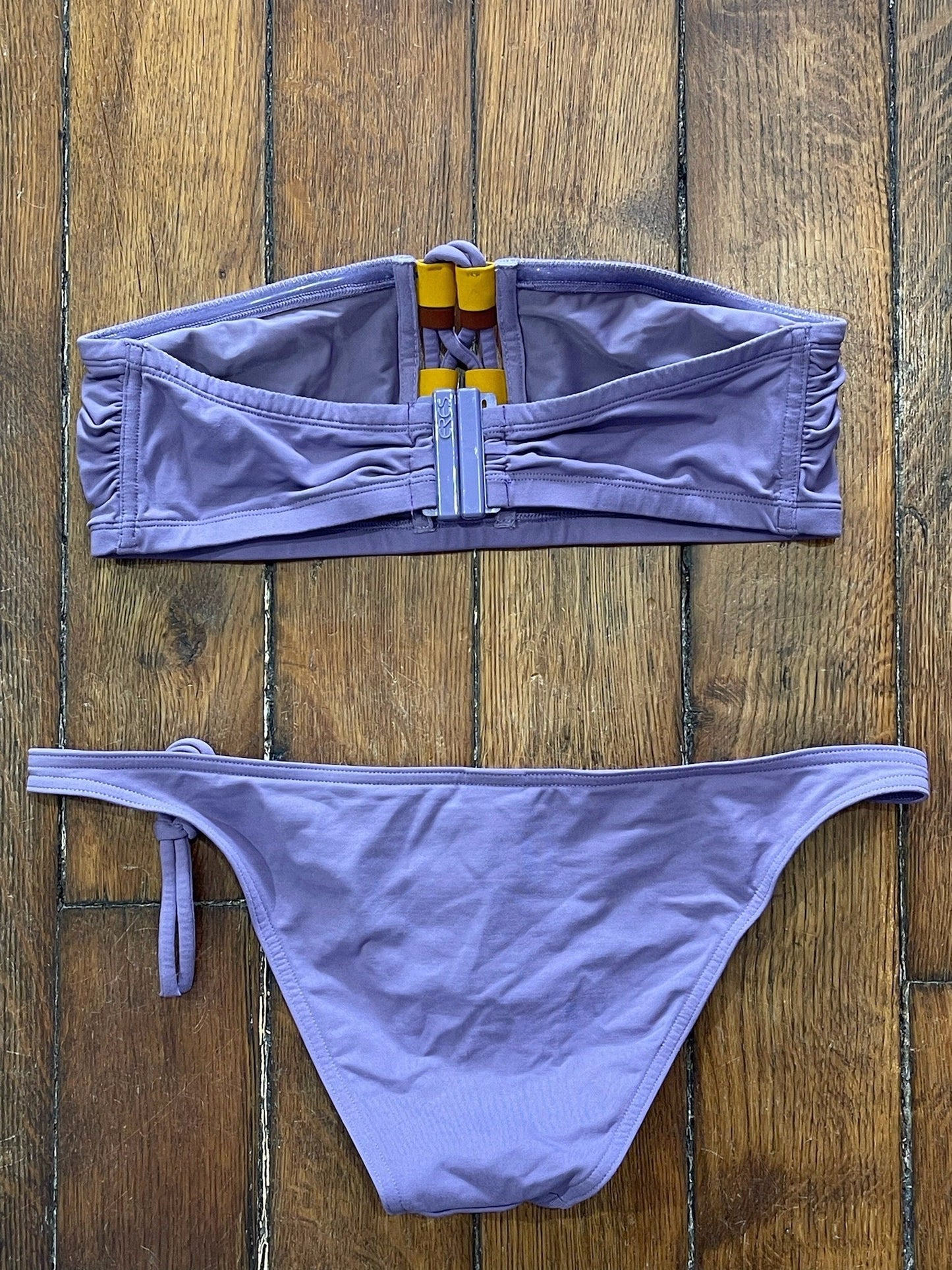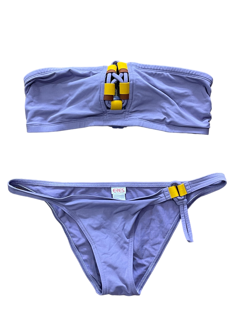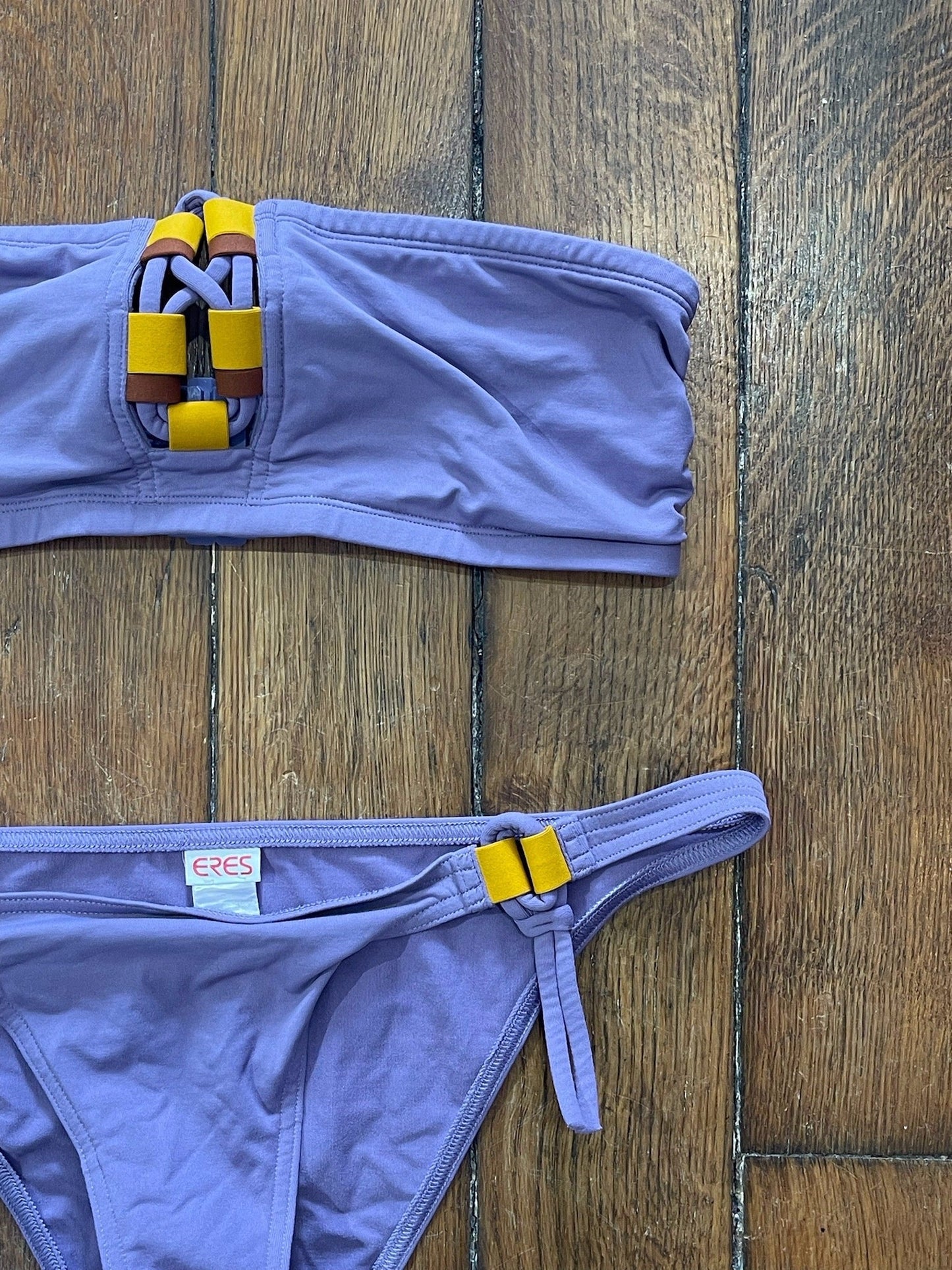 En polyamide violet. Soutien gorge bandeau avec effet perles jaunes et marron en tissu et culotte bikini.