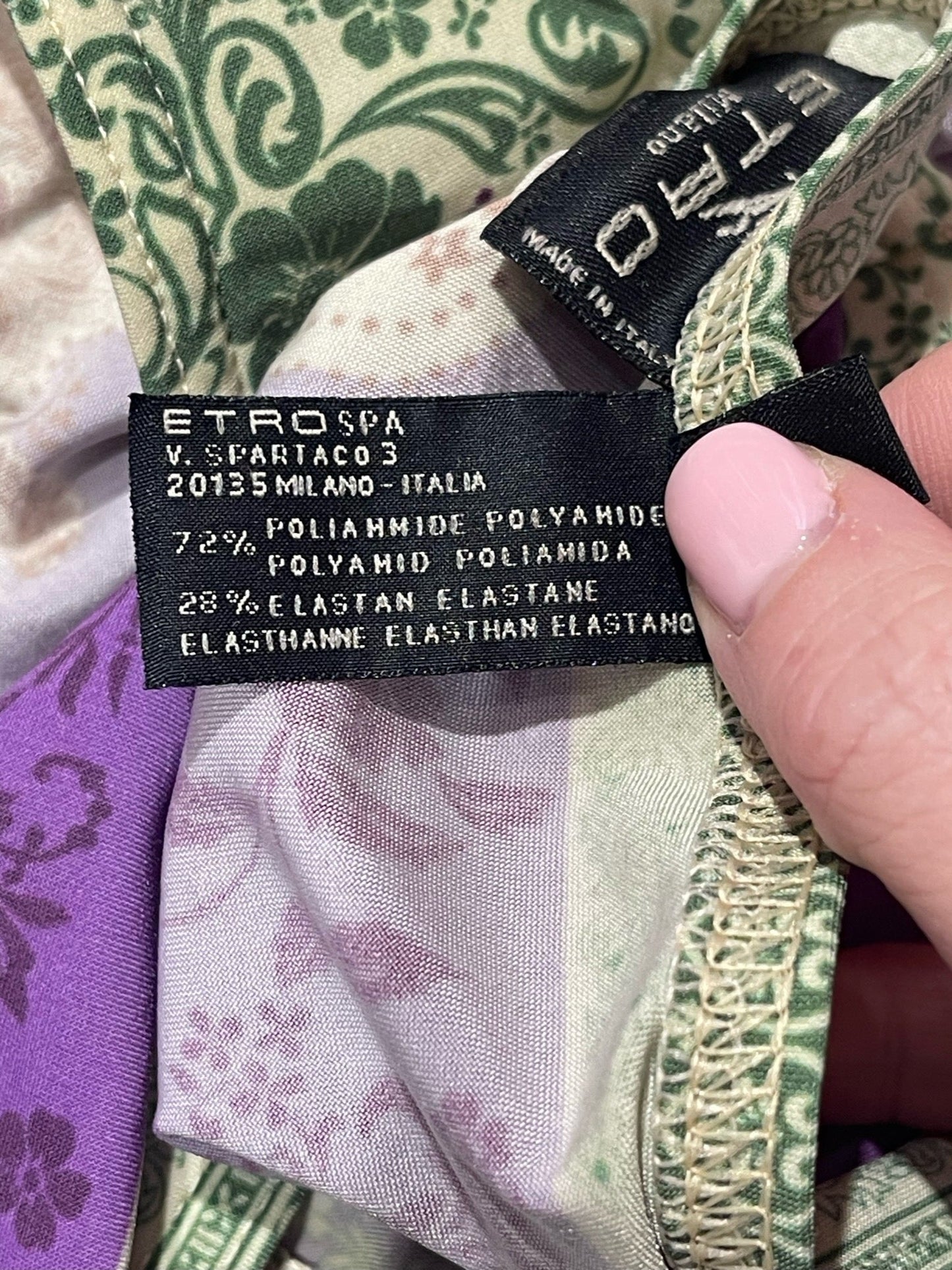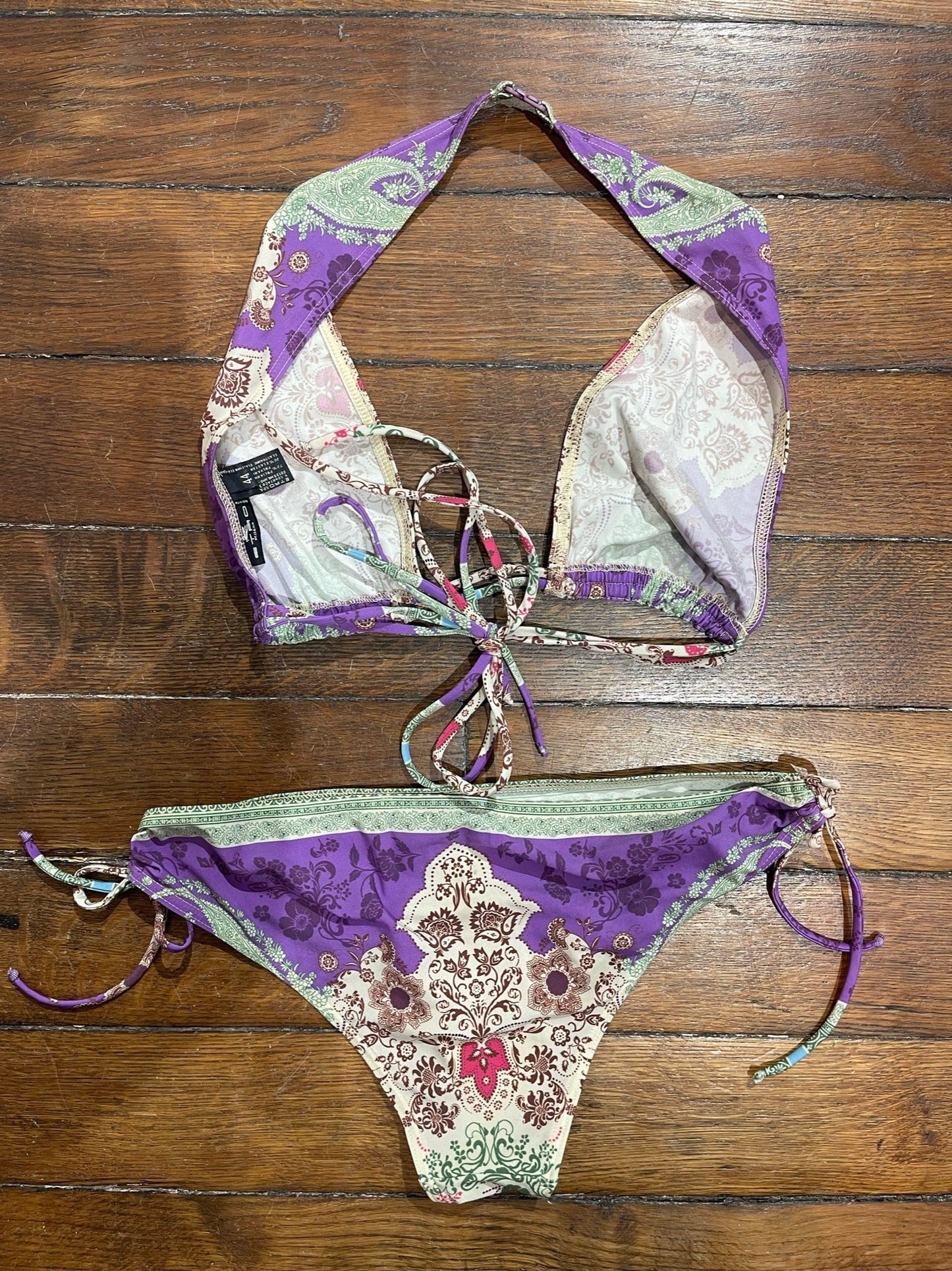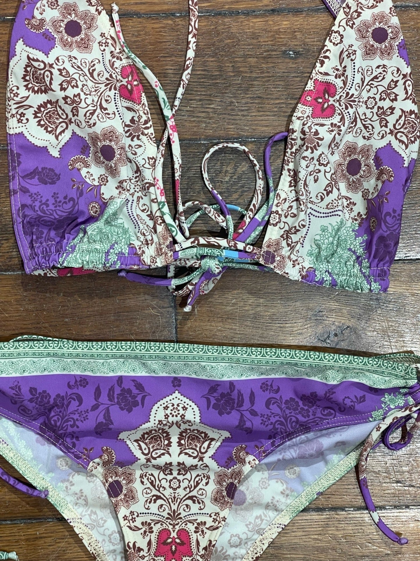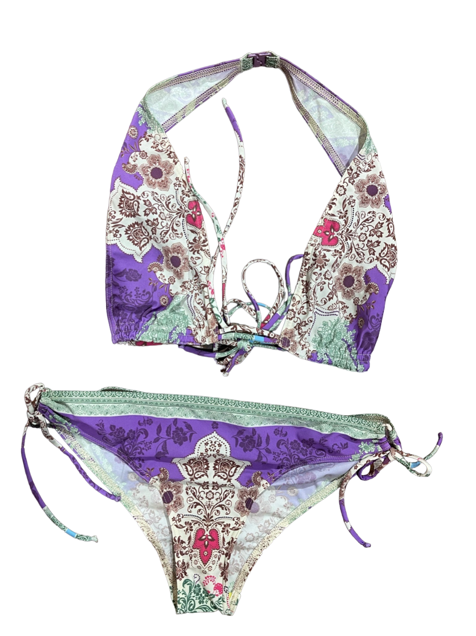 Maillot de bain en polyamide stretch à motif colorés. Haut de maillot triangle avec liens ajustables. Bas bikini avec noeud à nouer sur les côtés. Liens ajustables.