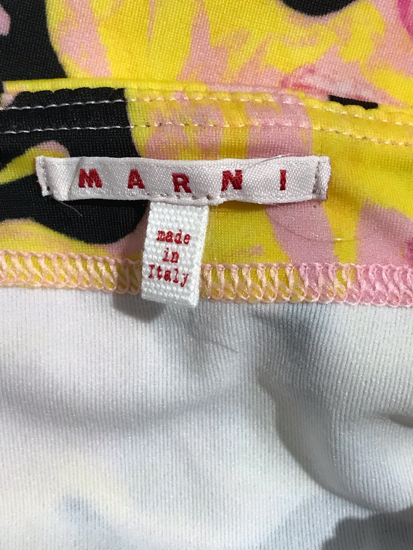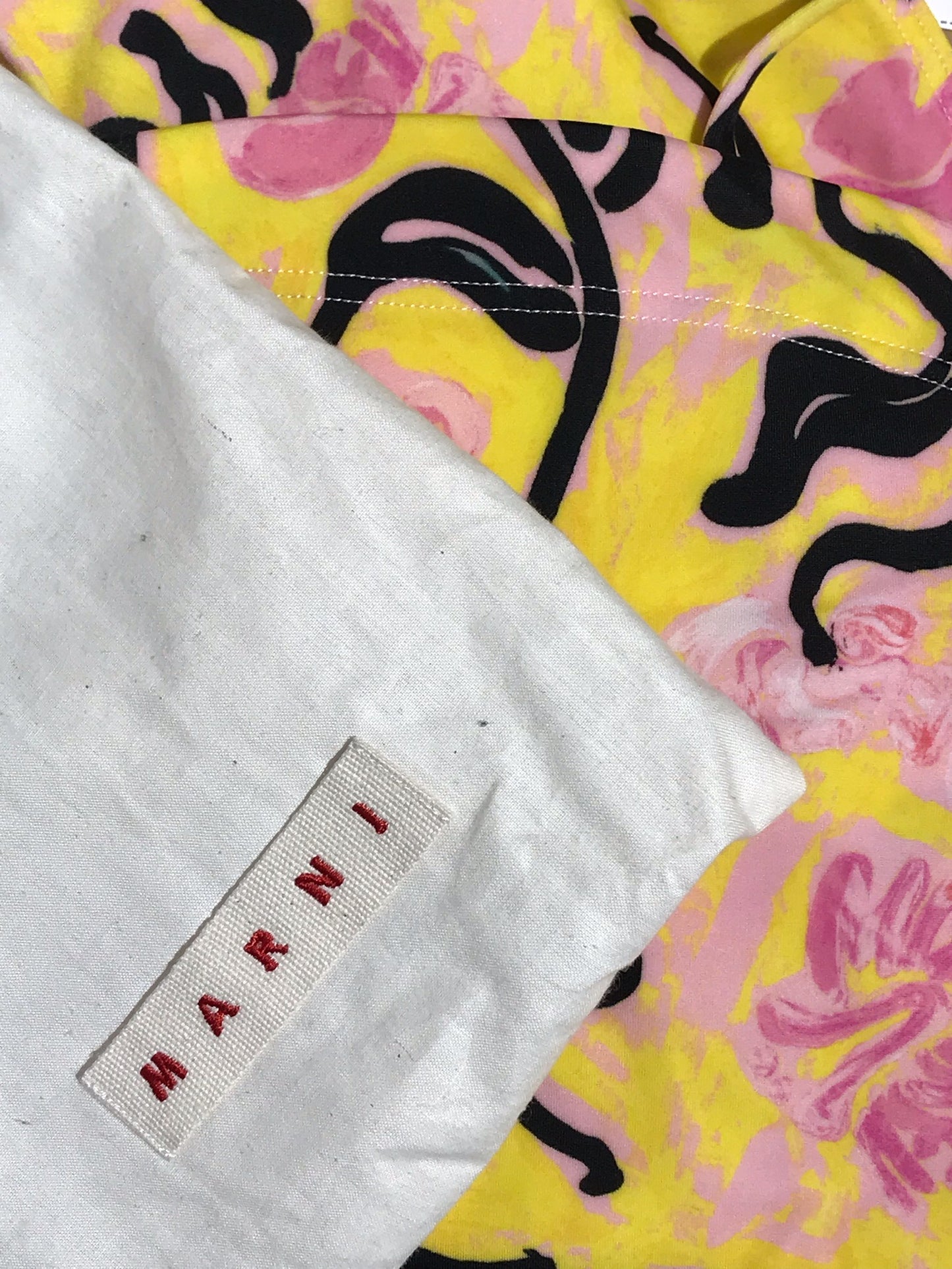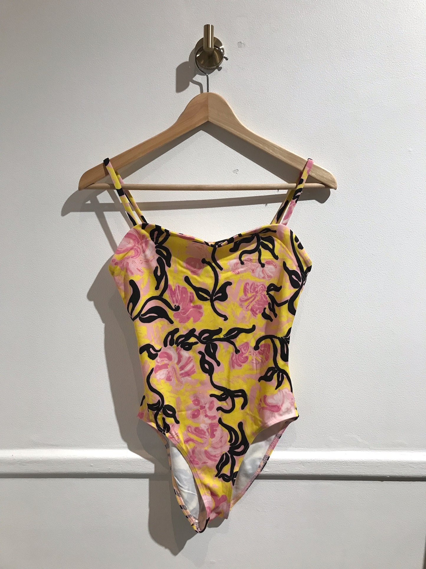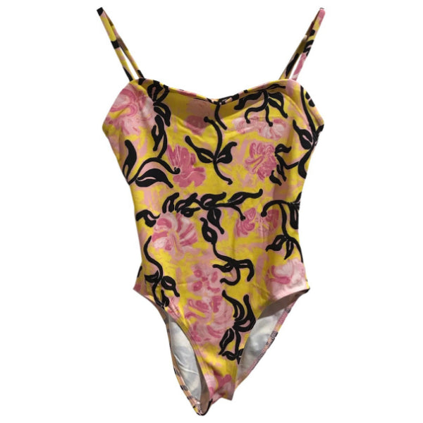 Modèle à bretelle à imprimé rose, jaune et noir.