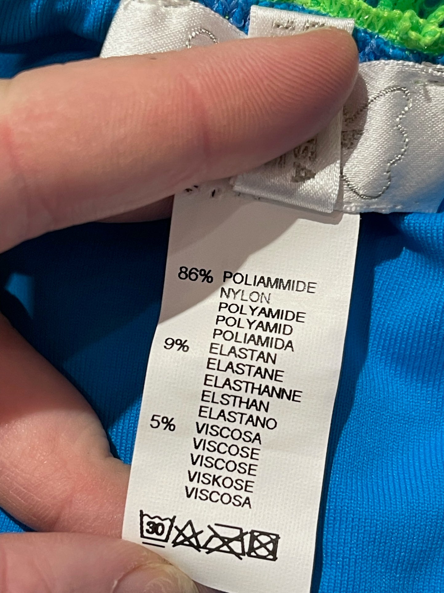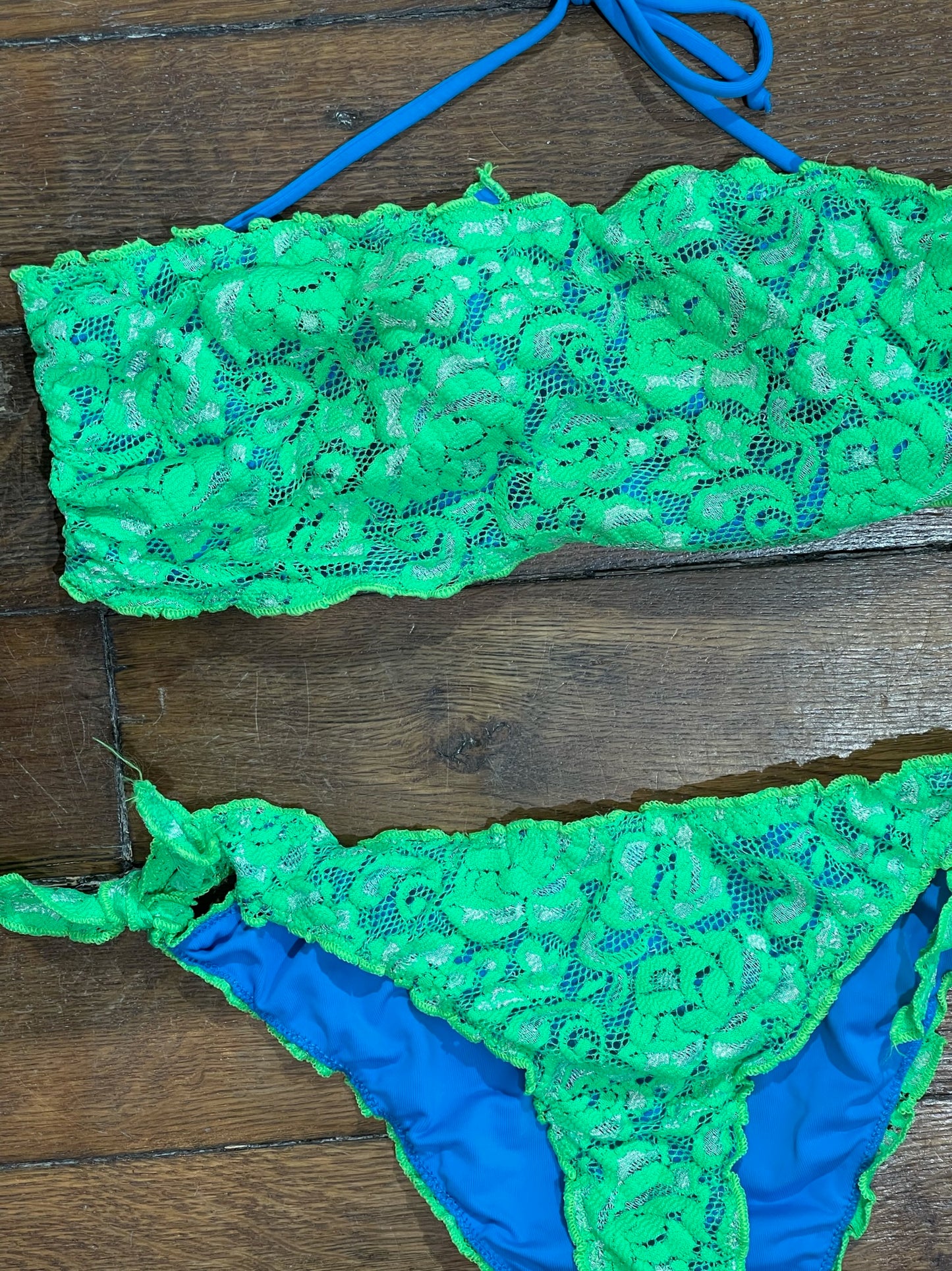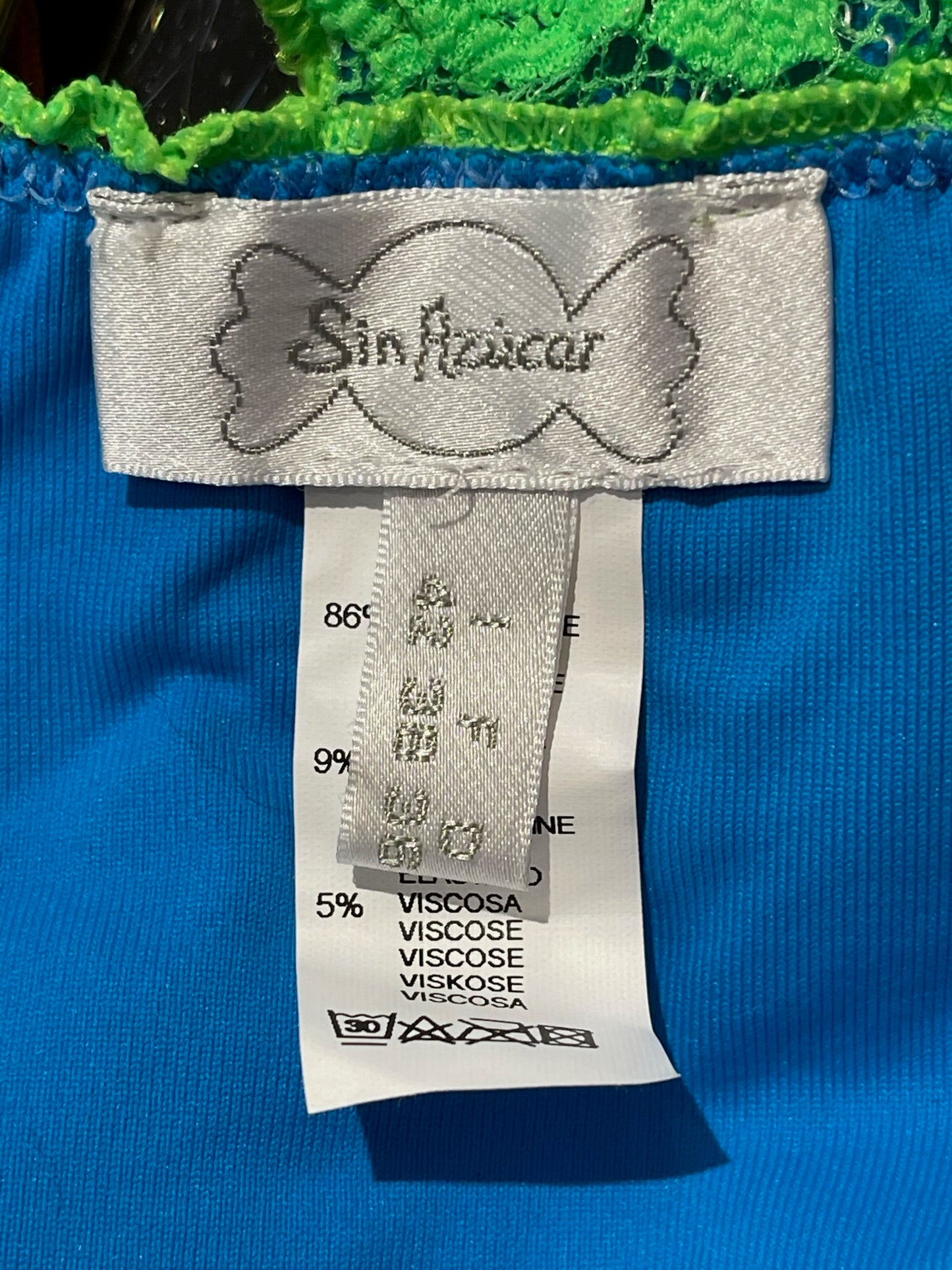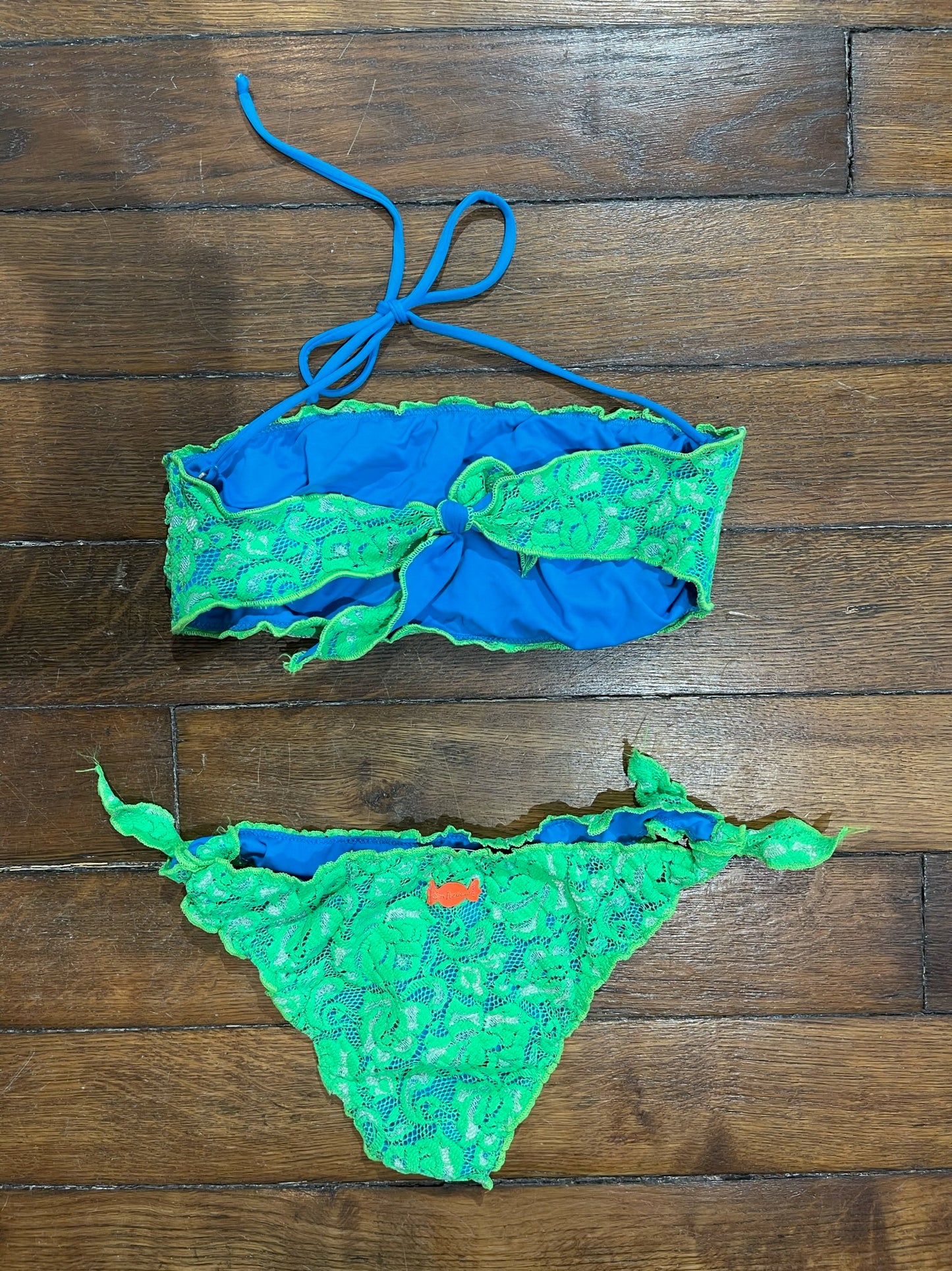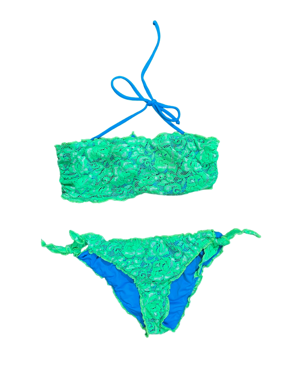 Maillot de bain en polyamide bleu recouvert de dentelle verte.
