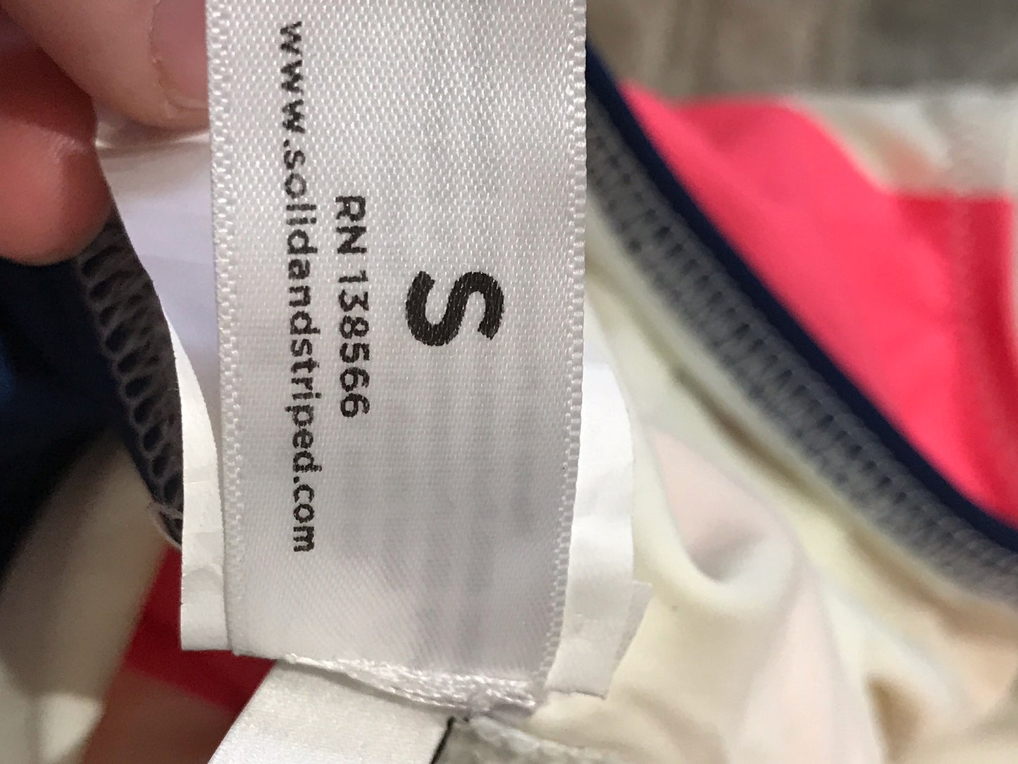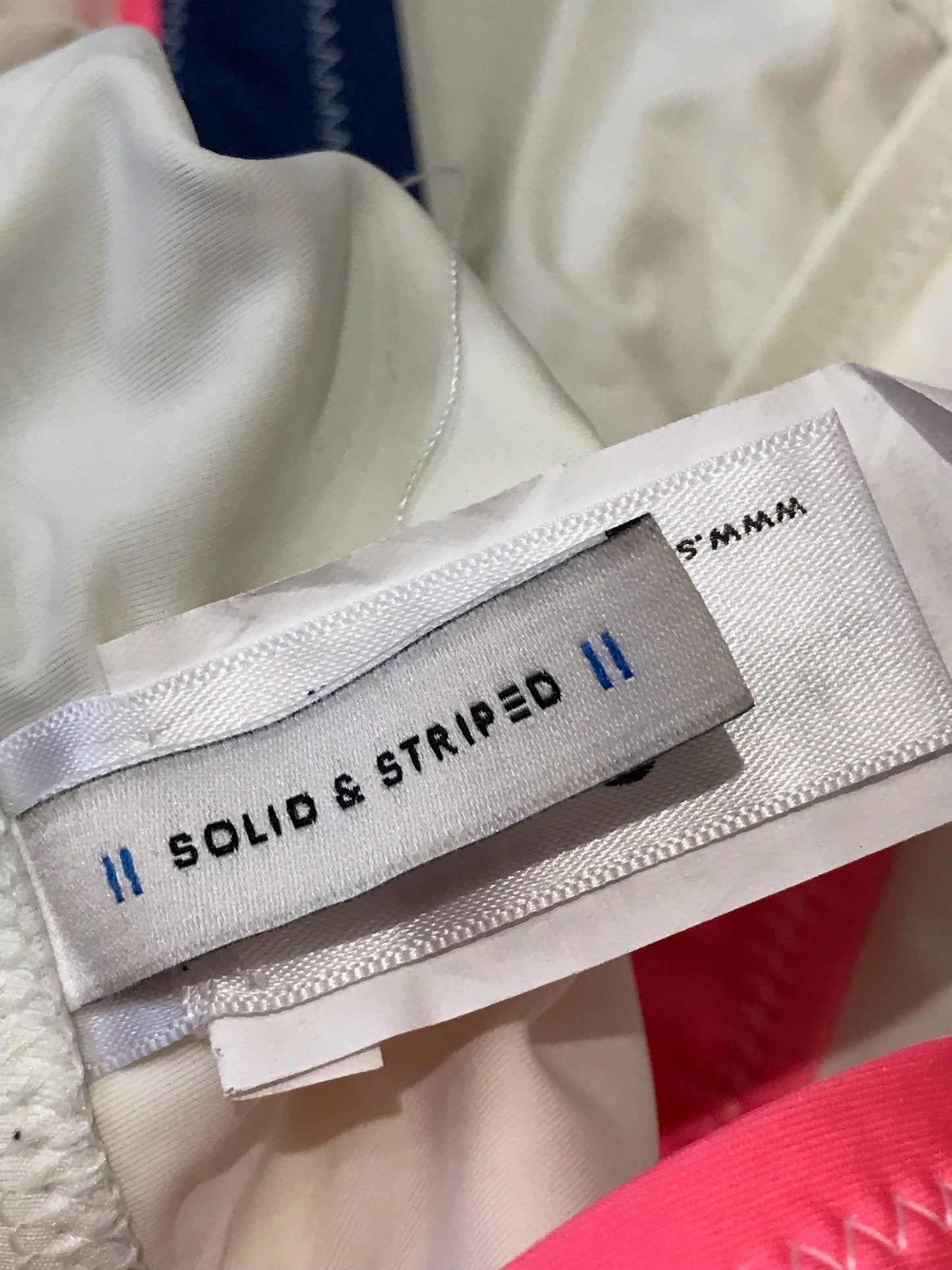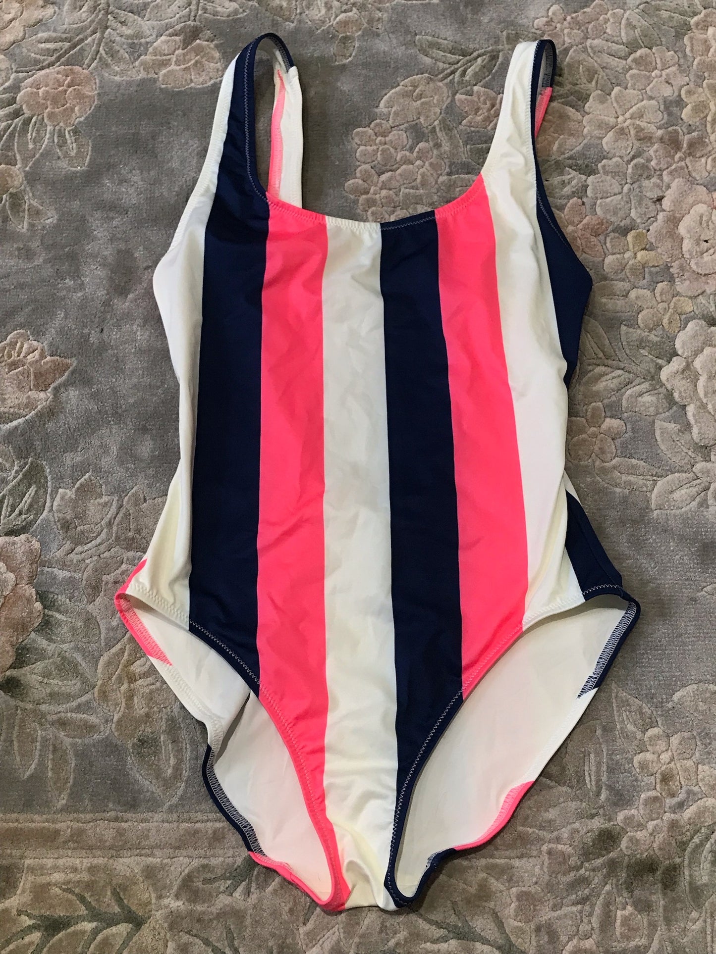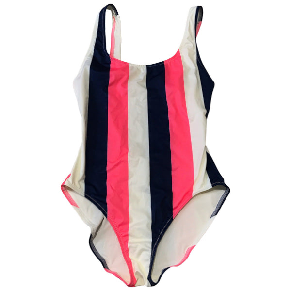 Maillot de bain Solid & Striped, modèle 1 pièce. En polyamide rayé bleu marine, rose et blanc.