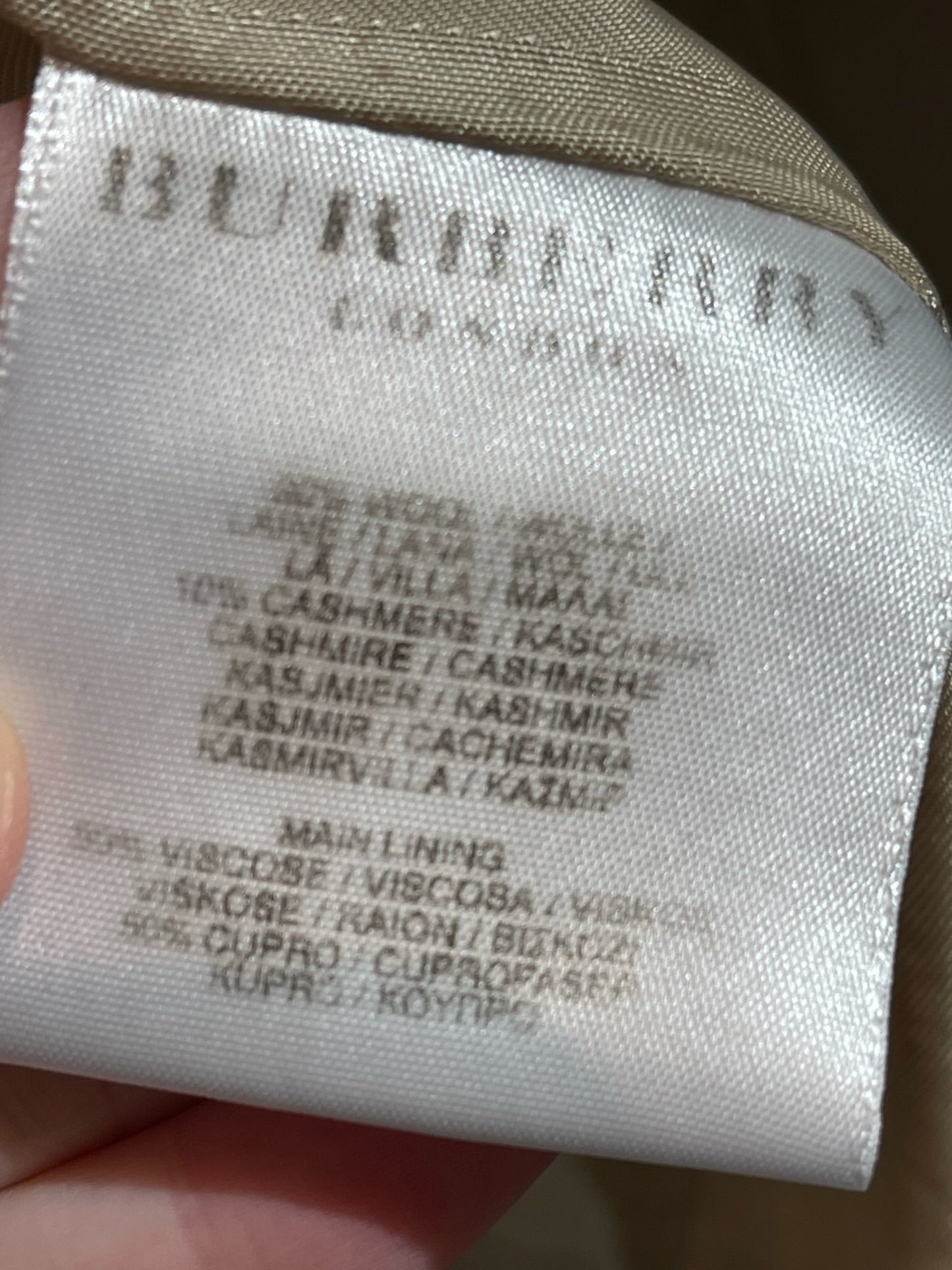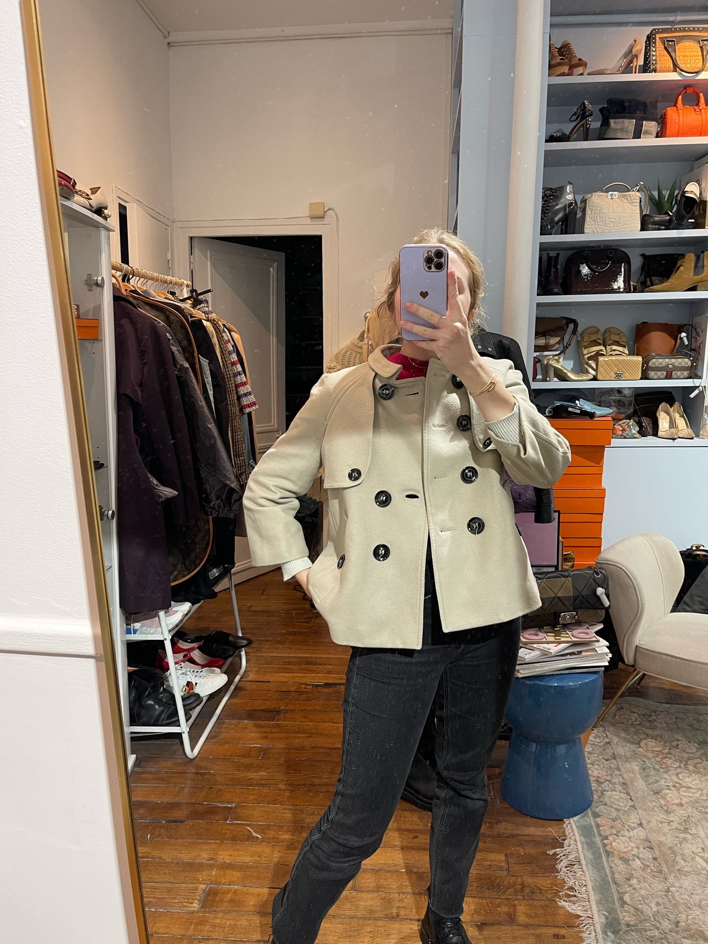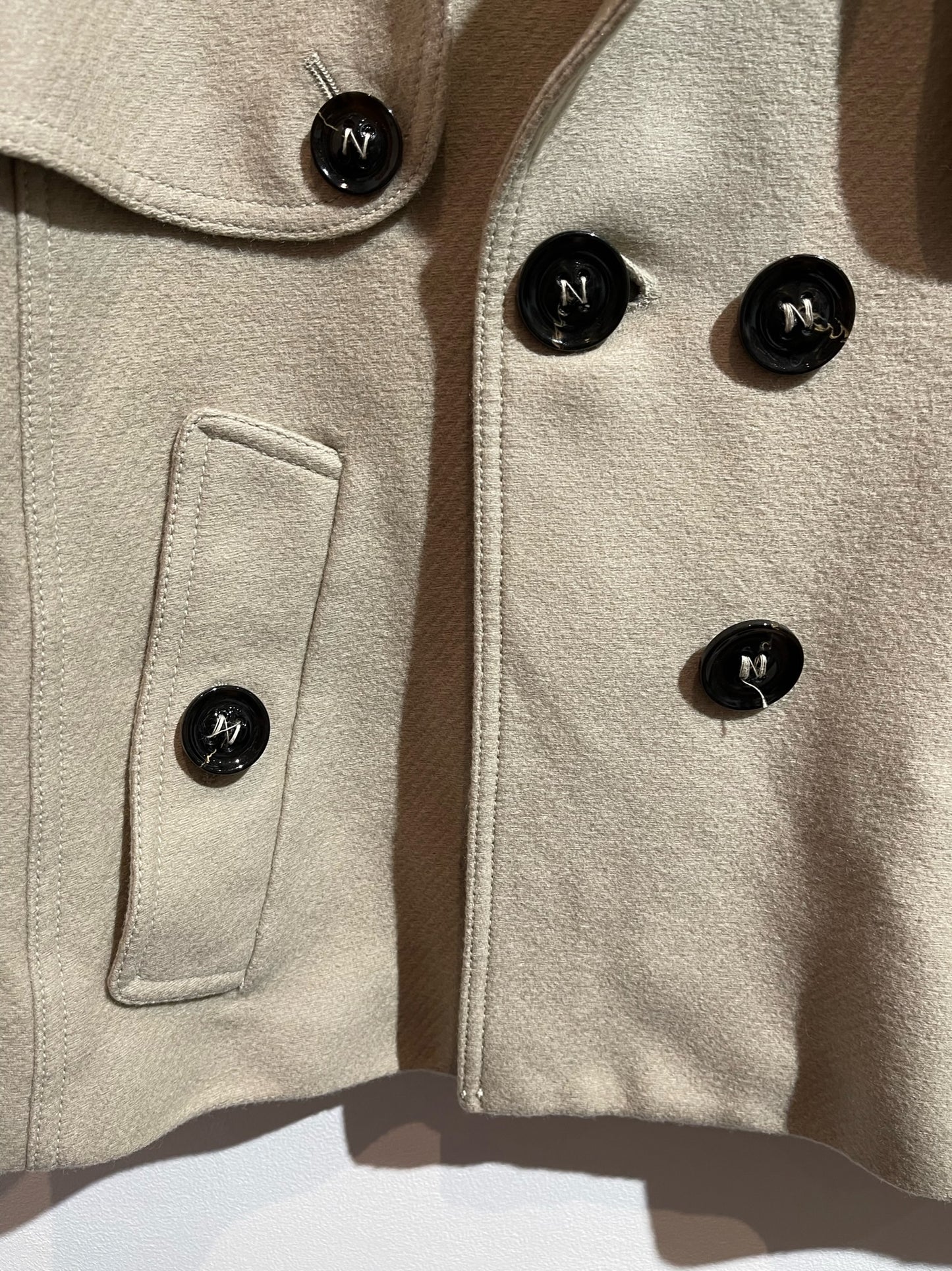 Caban court en laine beige et cachemire beige avec fermeture boutonnée, manches trois quarts et poches latérales.