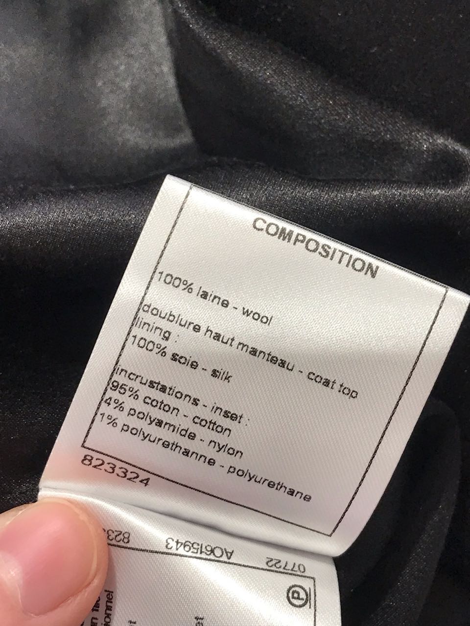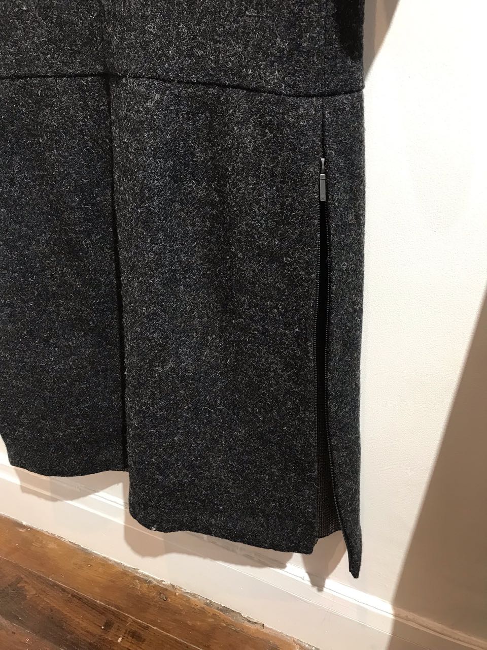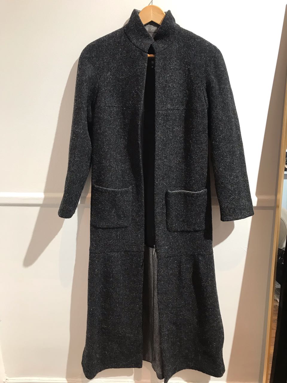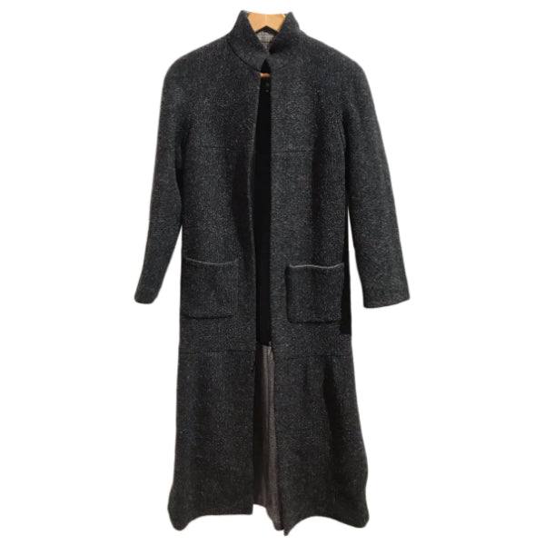 Superbe manteau Chanel en laine gris foncé avec détails chainette. Fermeture zip. Doublure en soie.