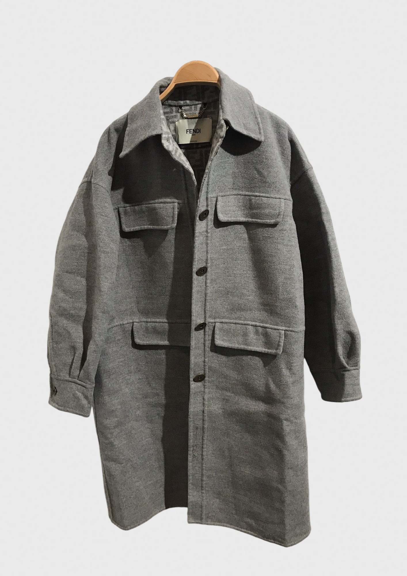 Manteau chemise en laine grise. Col classique, fermeture boutonnée, manches longues. Quatre poches plaquées sur le devant avec fermeture boutonnée. Intérieur de la veste avec monogramme FF en gris. Ceinture réglable et amovible.