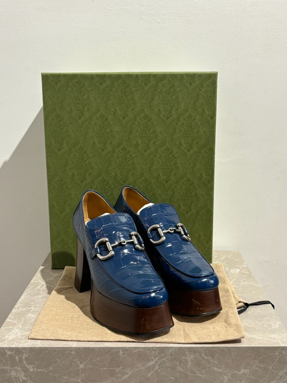 Mocassins à plateforme en cuir embossé crocodile bleu avec détail du mors à l'avant.