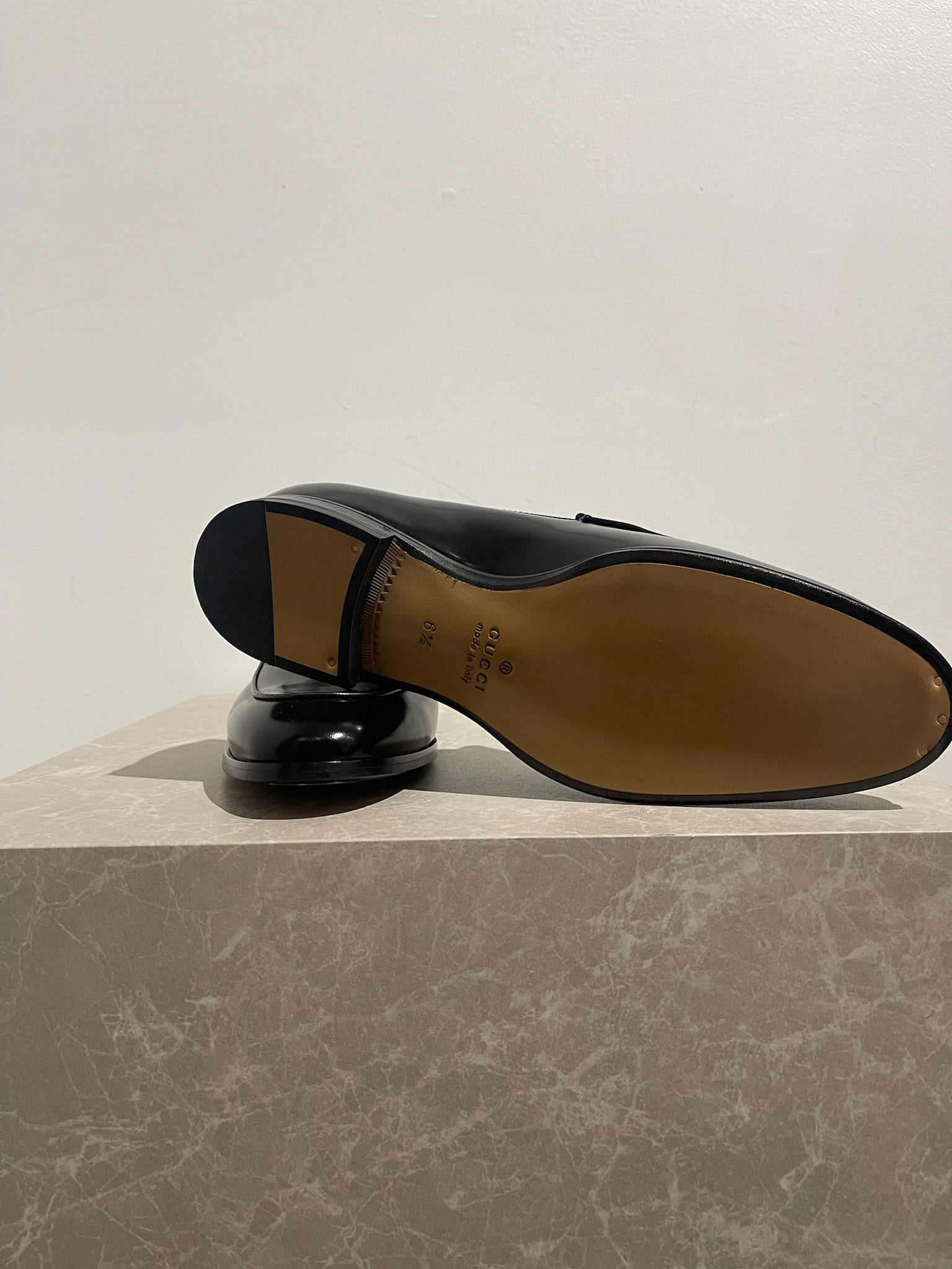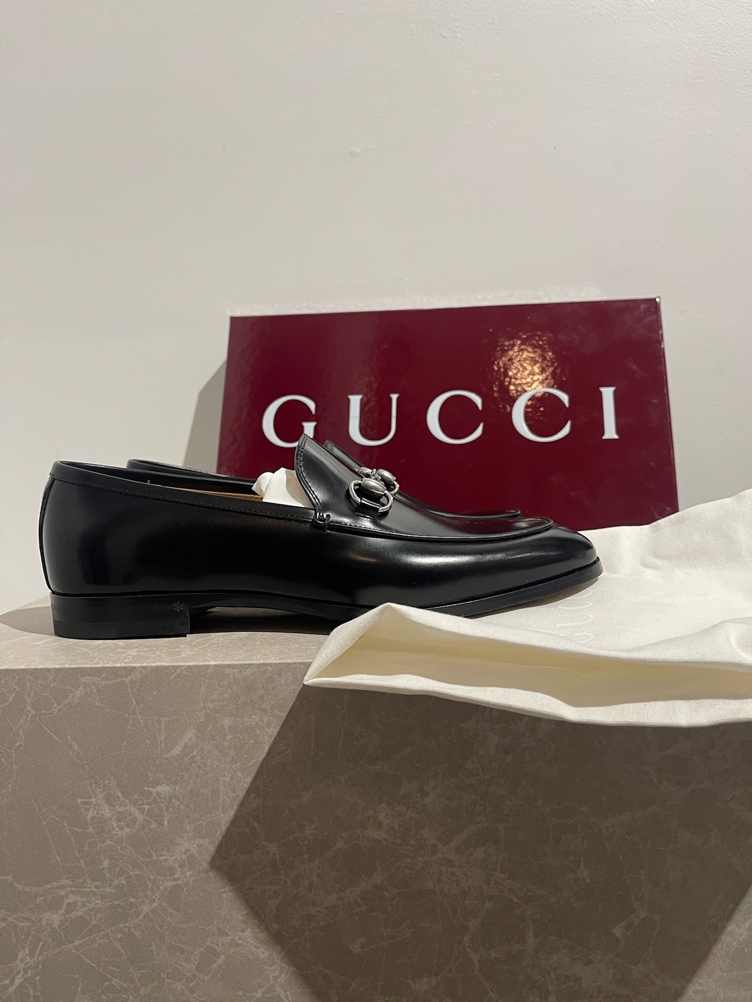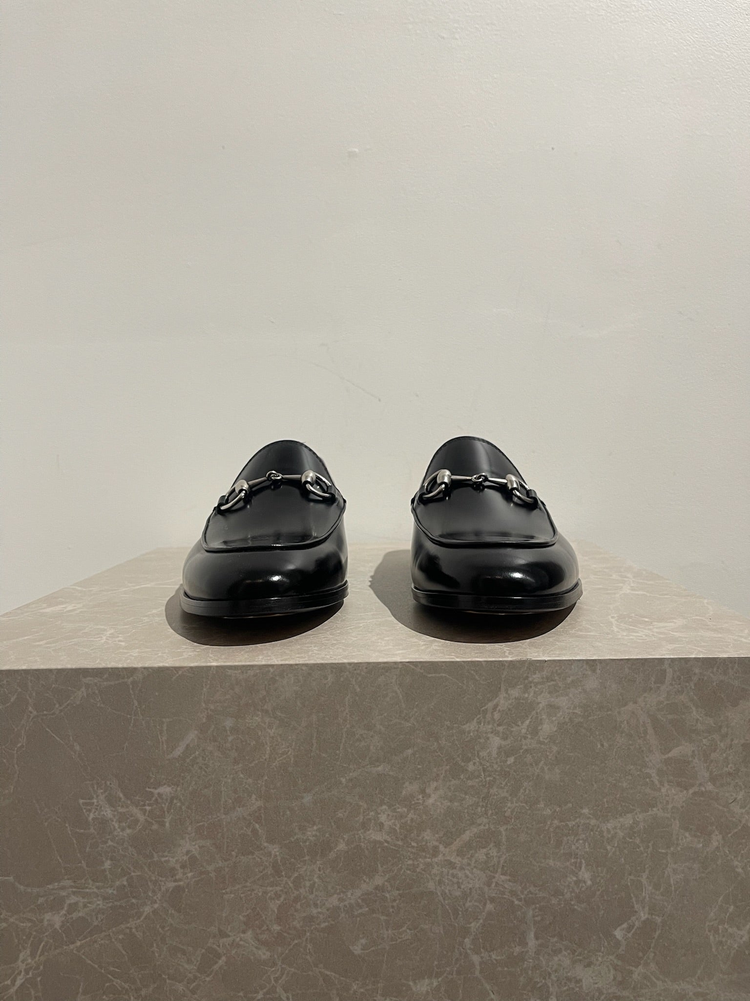 Mocassins en cuir noir orné du mors en métal argent à l'avant, signature Gucci.